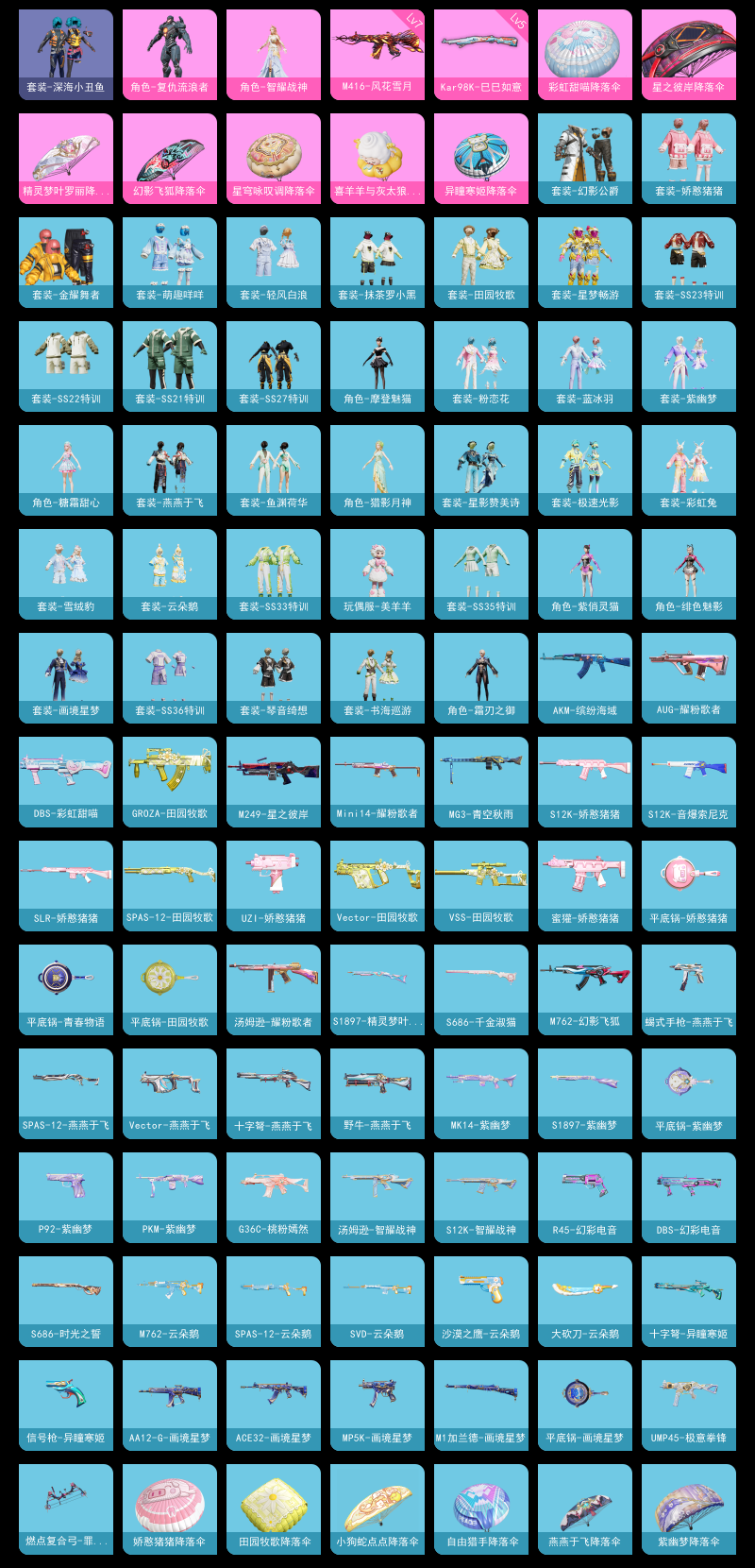 【和平精英】【lyhp21989】2粉装,6特效呛,0载具,历史最高段位:卓越王牌10星 王牌印记5次 热力值:43268,108套装,154呛械,191装备,81战备;套装:角色-复仇流浪者,角色-智耀战神,套装-橘黑制服,套装-黄色运动,套装-黑色伏地魔,套装-骑行爱好者,套装-竞技名士,套装-深蓝色名流,套装-湖蓝色名流,套装-黄色名流,套装-猛禽,套装-长空猛禽,套装-海岛探路者,套装-旭日情侣,套装-冷焰舞者,套装-特战装甲,套装-战地督导,套装-甜蜜告白,套装-魅力单车,套装-绮丽涂鸦,套装-竞技达人朋克,套装-野性战心,套装-破晓战魂,套装-幻世保卫者,套装-森林游猎者,套装-酷潮明星,套装-极地朋克,套装-幻世战舞者,套装-清新柠檬,套装-金耀舞者,套装-深海小丑鱼,套装-夏日倾情,套装-青涩时光,套装-缤纷果语,套装-滨海厨神,套装-龙魂突击队,套装-冰川特警,套装-元素星魂,套装-幻影公爵,套装-麻辣教官,套装-破蛋小黄鸡,套装-白糯汤圆,套装-战术大师,套装-飞行日记,套装-星梦畅游,套装-ss21特训,套装-萌趣咩咩,套装-娇憨猪猪,套装-玉兔迎春,套装-ss22特训,套装-田园牧歌,套装-轻风白浪,套装-抹茶罗小黑,套装-光之冒险,套装-绯格组合,套装-ss23特训,套装-王牌教练,套装-柠萌假日,套装-龟仙人,套装-漫游都市,套装-ss27特训,套装-恋语绒绒,套装-街头风暴,套装-海盐绵绵冰,套装-蝶变,角色-绯色魅影,角色-紫俏灵猫,套装-异域银装,角色-摩登魅猫,角色-糖霜甜心,角色-怀庆长公主,套装-ss31特训,套装-鱼渊荷华,套装-燕燕于飞,套装-智谋强哥,套装-紫幽梦,套装-粉恋花,套装-ss33特训,角色-猎影月神,套装-云朵鹅,套装-巳巳如意,套装-ss32特训,套装-彩虹兔,套装-青翼流星,套装-蓝冰羽,套装-顶瓜瓜,套装-雪绒豹,套装-狂鲨锋刃,套装-大橘大利,套装-极速光影,套装-炫彩糖果,套装-星影赞美诗,玩偶服-美羊羊,套装-元气之梦,套装-ss34特训,套装-薄荷星砂,套装-ss35特训,套装-琴音绮想,套装-画境星梦,套装-书海巡游,套装-阳光菠萝,套装-ss37特训,套装-ss36特训,角色-霜刃之御,套装-红釉青花,套装-雪国风尚,套装-萌鸡速递,套装-玲珑侠影;呛皮:aug-耀粉歌者,aug-天降萌叽,aug-异域银装,aug-冰晶雪宝,aug-紫晶流影,ace32-画境星梦,ace32-冰晶雪宝,akm-缤纷海域,akm-破晓战魂,akm-涂鸦街区,akm-荧星灵猫,akm-霓彩脉冲,ac-val-天降萌叽,famas-霓彩脉冲,famas-乌木金纹,蜜獾-娇憨猪猪,蜜獾-天降萌叽,蜜獾-乌木金纹,g36c-桃粉嫣然,m762-天降萌叽,m762-幻影飞狐,m762-云朵鹅,m762-登顶巅峰,m16a4-幻世战舞者,m16a4-冰河战士,m16a4-雨过天青,scar-l-红色方程式,scar-l-夜灯,scar-l-炫彩节奏,scar-l-玉兔迎春,scar-l-海盐豹豹,7级m416-风花雪月,m416-蓝色火焰,m416-红色方程式,m416-糯团青竹,groza-田园牧歌,groza-紫矿核心,groza-福马献瑞,q-彩虹符号,mk47-乌木金纹,莫辛纳甘-乌木金纹,m200-乌木金纹,5级kar98k-巳巳如意,win94-乌木金纹,amr-鸡智如我,amr-雨过天青,m24-炫彩节奏,awm-天降萌叽,svd-云朵鹅,m417-玩趣呆呆,slr-娇憨猪猪,slr-霓彩脉冲,slr-乌木金纹,mk20-h-星途旅人,mk20-h-狂鲨锋刃,mk20-h-乌木金纹,mini14-耀粉歌者,mini14-鸡智如我,m1加兰德-画境星梦,5级mk14-甜梦熊击,mk14-乌木金纹,mk14-冰河战士,mk14-紫幽梦,mk14-薄荷星砂,mk14-紫晶流影,mk12-乌木金纹,vss-田园牧歌,5级汤姆逊-热量炸弹,汤姆逊-耀粉歌者,汤姆逊-炫彩节奏,汤姆逊-智耀战神,ump45-蓝色火焰,ump45-海盐豹豹,ump45-极意拳锋,vect-生命誓言,vect-田园牧歌,vect-燕燕于飞,p90-玩趣呆呆,p90-巳巳如意,p90-紫矿核心,野牛-燕燕于飞,野牛-乌木金纹,uzi-娇憨猪猪,uzi-天降萌叽,uzi-冰河战士,uzi-炫彩糖果,mp5k-画境星梦,mp5k-乌木金纹,5级aks-74u-森灵之息,aks-74u-鸡智如我,aks-74u-乌木金纹,s686-红色方程式,s686-千金淑猫,s686-时光之誓,s686-巳巳如意,dbs-彩虹甜喵,dbs-幻彩电音,dbs-乌木金纹,spas-12-田园牧歌,spas-12-燕燕于飞,spas-12-狂鲨锋刃,spas-12-云朵鹅,spas-12-乌木金纹,s12k-破晓战魂,s12k-娇憨猪猪,s12k-音爆索尼克,s12k-蓝晶绮麟,s12k-智耀战神,s12k-霓彩脉冲,aa12-g-画境星梦,aa12-g-雨过天青,s1897-精灵梦叶罗丽,s1897-紫幽梦,s1897-糯团青竹,mg3-幻世战舞者,mg3-乌木金纹,mg3-青空秋雨,mg-36-薄荷星砂,5级dp-28-豹影疾电,m249-星之彼岸,m249-糯团青竹,m249-无面战甲,m249-冰晶雪宝,pkm-啾咪啾咪,pkm-雨过天青,pkm-紫幽梦,r45-幻彩电音,蝎式手呛-燕燕于飞,p92-紫幽梦,信号呛-异瞳寒姬,沙墨之鹦-云朵鹅,沙墨之鹦-雨过天青,平底锅-青春物语,平底锅-娇憨猪猪,平底锅-田园牧歌,平底锅-紫幽梦,平底锅-属我最6,平底锅-画境星梦,撬棍-炽纹蛇影,撬棍-冰晶雪宝,大砍刀-云朵鹅,燃烧瓶-甜梦桃焰,燃烧瓶-福马献瑞,十子怒-异瞳寒姬,十子怒-燕燕于飞,十子怒-异域银装,破片手留单-海盐豹豹,破片手留单-拽到爆炸,破片手留单-巳巳如意,破片手留单-爆破雪人,盐雾蛋-冰氧夏日,燃点复合弓-罪夜之冕,突击盾牌-绝对恒星,铝热弹-炫彩糖果;降落伞:牡丹亭・游园飞行器,炫彩糖果飞行器,异域银装飞行器,狂鲨锋刃飞行器,鸡智如我飞行器,登顶巅峰飞行器,马上有福飞行器; 详情看图4.3w热力值2粉装6特效呛 深海小丑鱼 满级风花雪月m4 满级妹控 满级aks-74u