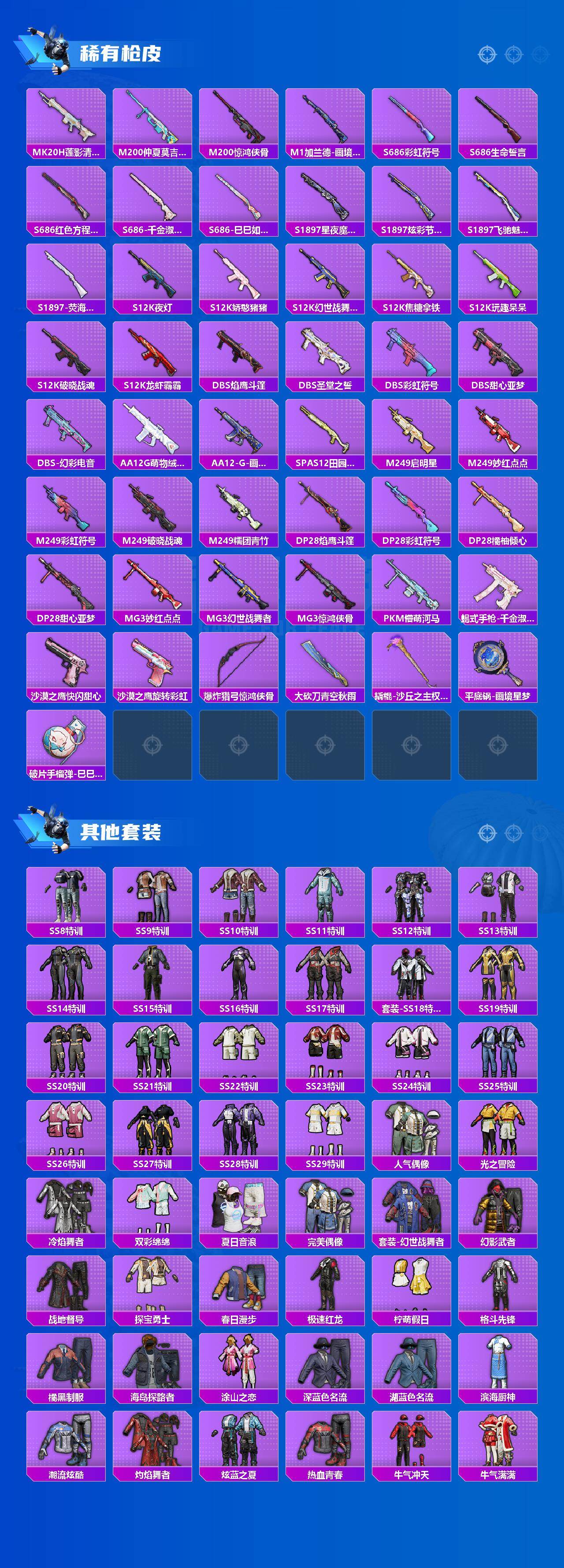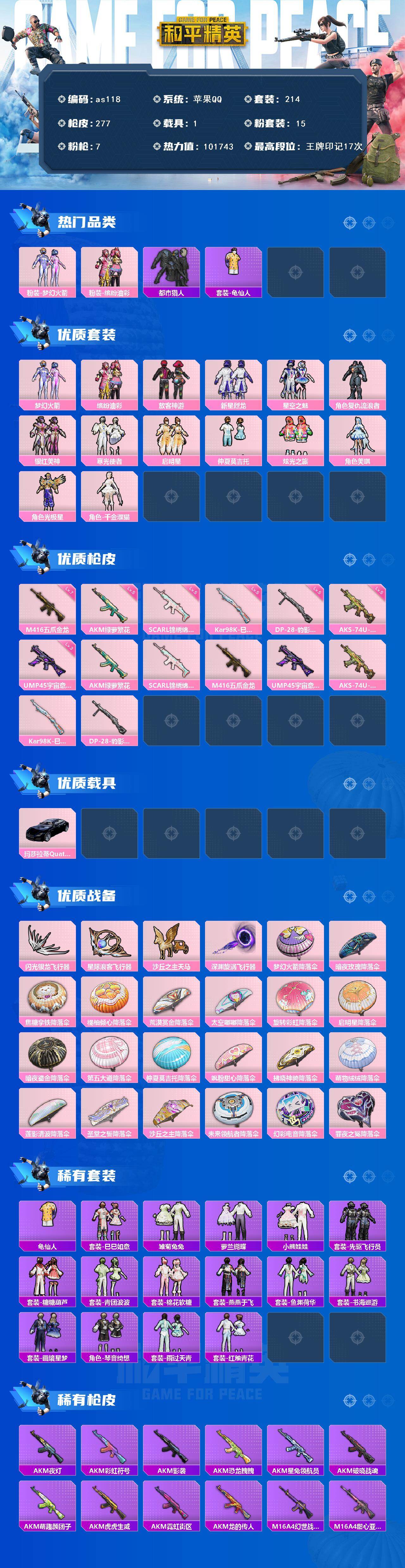 苹果 手q-15粉装-7特效呛-1载具-5粉色飞行器-101743热力值-17王牌印记-214套装-277呛皮 【热门品类】:粉装-梦幻火箭,粉装-缤纷油彩,套装-都市猎人,套装-龟仙人 【粉色套装】:粉装-梦幻火箭,粉装-缤纷油彩,粉装-放客神游,粉装-新星烈龙,粉装-星空之魅,角色-复仇流浪者,粉装-银红美神,粉装-寒光使者,粉装-启明星,粉装-仲夏莫吉托,粉装-炫光之旅,角色-美琪,角色-光极星,角色-千金淑猫 【粉色呛皮等级】:akm-绿萝繁花五级,scar-l-锦绣绵绵五级,m416-五爪金龙七级,ump45-宇宙意志三级,aks-74u-森灵之息五级,kar98k-巳巳如意五级,dp-28-豹影疾电五级 【粉色载具】:玛莎拉蒂quattropte(夜幕蓝) 【粉色呛皮】:akm-绿萝繁花,scar-l-锦绣绵绵,m416-五爪金龙,ump45-宇宙意志,aks-74u-森灵之息,kar98k-巳巳如意,dp-28-豹影疾电 【粉色飞行器】:闪光银龙飞行器,星际浪客飞行器,沙丘之主天马,深渊漩涡飞行器 【粉色降落伞】:梦幻火箭降落伞,暗夜玫瑰降落伞,焦糖拿铁降落伞,橘柚倾心降落伞,荒漠赏金降落伞,太空嘟嘟降落伞,旋转彩虹降落伞,启明星降落伞,暗夜鎏金降落伞,第五大道降落伞,仲夏莫吉托降落伞,飒粉甜心降落伞,拂晓神骑降落伞,萌物绒绒降落伞,莲影清波降落伞,圣堂之誓降落伞,沙丘之主降落伞,未来领航者降落伞,幻彩电音降落伞,罪夜之冕降落伞 【稀有套装】:套装-龟仙人,套装-巳巳如意,套装-雏菊兔兔,套装-萝兰蝴蝶,套装-小熊娃娃,套装-先驱飞行员,套装-糖糖葫芦,套装-青团波波,套装-棉花软糖,套装-燕燕于飞,套装-鱼渊荷华,套装-书海巡游,套装-画境星梦,套装-琴音绮想,套装-雨过天青,套装-红釉青花 【稀有呛皮】:akm-夜灯,akm-彩虹符号,akm-影袭,akm-恐龙拽拽,akm-星兔领航员,akm-破晓战魂,akm-萌趣颜团子,akm-虎虎生威,akm-霓虹街区,akm-龙的传人,m16a4-幻世战舞者,m16a4-甜心亚梦,m16a4-红色方程式,m16a4-莲影清波,m16a4-蓝色火焰,scar-l-夜灯,scar-l-流星咚咚,scar-l-玉兔迎春,scar-l-红色方程式,scar-l-龙宫之主,m416-圣诞惊喜,m416-夜灯,m416-糯团青竹,m416-红色方程式,m416-蓝色火焰,groza-彩虹符号,groza-影袭,groza-恐龙拽拽,groza-懵萌河马,groza-田园牧歌,aug-冰川粉黛,aug-天降萌叽,aug-流星咚咚,aug-甜蜜菠萝,aug-耀粉歌者,q-赛罗,q-飞驰魅影,m762-天降萌叽,m762-彩虹符号,m762-暗夜鎏金,m762-牛气冲天,mk47-妙红点点,mk47-洛神天依,g36c-懵萌河马,ac-val-天降萌叽,ac-val-快闪甜心,ac-val-甜心亚梦,ac-val-闲梦青缨,ac-val-魅影蝠王,蜜獾-天降萌叽,蜜獾-娇憨猪猪,ace32-画境星梦,uzi-啾咪啾咪,uzi-天降萌叽,uzi-娇憨猪猪,uzi-影袭,uzi-炫彩节奏,uzi-红色方程式,ump45-夜灯,ump45-涂山之恋,ump45-生命誓言,ump45-蓝色火焰,vect-焰鹰斗篷,vect-彩虹符号,vect-生命誓言,vect-田园牧歌,汤姆逊-天降萌叽,汤姆逊-暗夜鎏金,汤姆逊-炫彩节奏,汤姆逊-耀粉歌者,野牛-沙丘之主,mp5k-画境星梦,p90-快闪甜心,p90-飞驰魅影,p90-巳巳如意,kar98k-彩虹符号,kar98k-影袭,kar98k-炫彩节奏,kar98k-电玩视界,kar98k-红色方程式,kar98k-终极赛罗,kar98k-飞驰魅影,m24-影袭,awm-焰鹰斗篷,awm-黄金龙骨,sks-天之羽翼,sks-未来歌姬,sks-炫彩节奏,sks-焦糖拿铁,sks-糯团青竹,vss-彩虹符号,vss-田园牧歌,vss-碧影闪光,mini14-千面幻镜,mini14-旋转彩虹,mini14-海渊国主,mini14-涂山之恋,mini14-炫彩节奏,mini14-耀粉歌者,mini14-绯穹魔姬,mk14-暗星紫秘,mk14-猪猪侠,mk14-绚金瑰梦,win94-夏日绵绵冰,slr-娇憨猪猪,slr-彩虹符号,slr-墨龙九天,莫辛纳甘-懵萌河马,amr-妙红点点,amr-喜羊羊与灰太狼,m417-惊鸿侠骨,m417-星兔领航员,mk20-h-启明星,mk20-h-快闪甜心,mk20-h-莲影清波,m200-仲夏莫吉托,m200-惊鸿侠骨,m1加兰德-画境星梦,s686-彩虹符号,s686-生命誓言,s686-红色方程式,s686-巳巳如意,s686-千金淑猫,s1897-星夜魔法师,s1897-炫彩节奏,s1897-飞驰魅影,s1897-荧海星豚,s12k-玩趣呆呆,s12k-破晓战魂,s12k-龙虾霸霸,s12k-夜灯,s12k-娇憨猪猪,s12k-幻世战舞者,s12k-焦糖拿铁,dbs-焰鹰斗篷,dbs-圣堂之誓,dbs-彩虹符号,dbs-甜心亚梦,dbs-幻彩电音,aa12-g-萌物绒绒,aa12-g-画境星梦,spas-12-田园牧歌,m249-启明星,m249-妙红点点,m249-彩虹符号,m249-破晓战魂,m249-糯团青竹,dp-28-焰鹰斗篷,dp-28-彩虹符号,dp-28-橘柚倾心,dp-28-甜心亚梦,mg3-妙红点点,mg3-幻世战舞者,mg3-惊鸿侠骨,pkm-懵萌河马,蝎式手呛-千金淑猫,沙墨之鹦-快闪甜心,沙墨之鹦-旋转彩虹,爆炸猎弓-惊鸿侠骨,大砍刀-青空秋雨,撬棍-沙丘之主权杖,平底锅-画境星梦,破片手留单-巳巳如意 【其他套装】:套装-ss8特训,套装-ss9特训,套装-ss10特训,套装-ss11特训,套装-ss12特训,套装-ss13特训,套装-ss14特训,套装-ss15特训,套装-ss16特训,套装-ss17特训,套装-ss18特训,套装-ss19特训,套装-ss20特训,套装-ss21特训,套装-ss22特训,套装-ss23特训,套装-ss24特训,套装-ss25特训,套装-ss26特训,套装-ss27特训,套装-ss28特训,套装-ss29特训,套装-人气偶像,套装-光之冒险,套装-冷焰舞者,套装-双彩绵绵,套装-夏日音浪,套装-完美偶像,套装-幻世战舞者,套装-幻影武者,套装-战地督导,套装-探宝勇士,套装-春日漫步,套装-极速红龙,套装-柠萌假日,套装-格斗先锋,套装-橘黑制服,套装-海岛探路者,套装-涂山之恋,套装-深蓝色名流,套装-湖蓝色名流,套装-滨海厨神,套装-潮流炫酷,套装-灼焰舞者,套装-炫蓝之夏,套装-热血青春,套装-牛气冲天,套装-牛气满满,套装-特种颜团子,套装-特训学院,套装-猎鹰,套装-猛禽,套装-玉兔迎春,套装-王牌教练,套装-甜蜜熊情侣,套装-疯狂小兔子,套装-白熊同盟