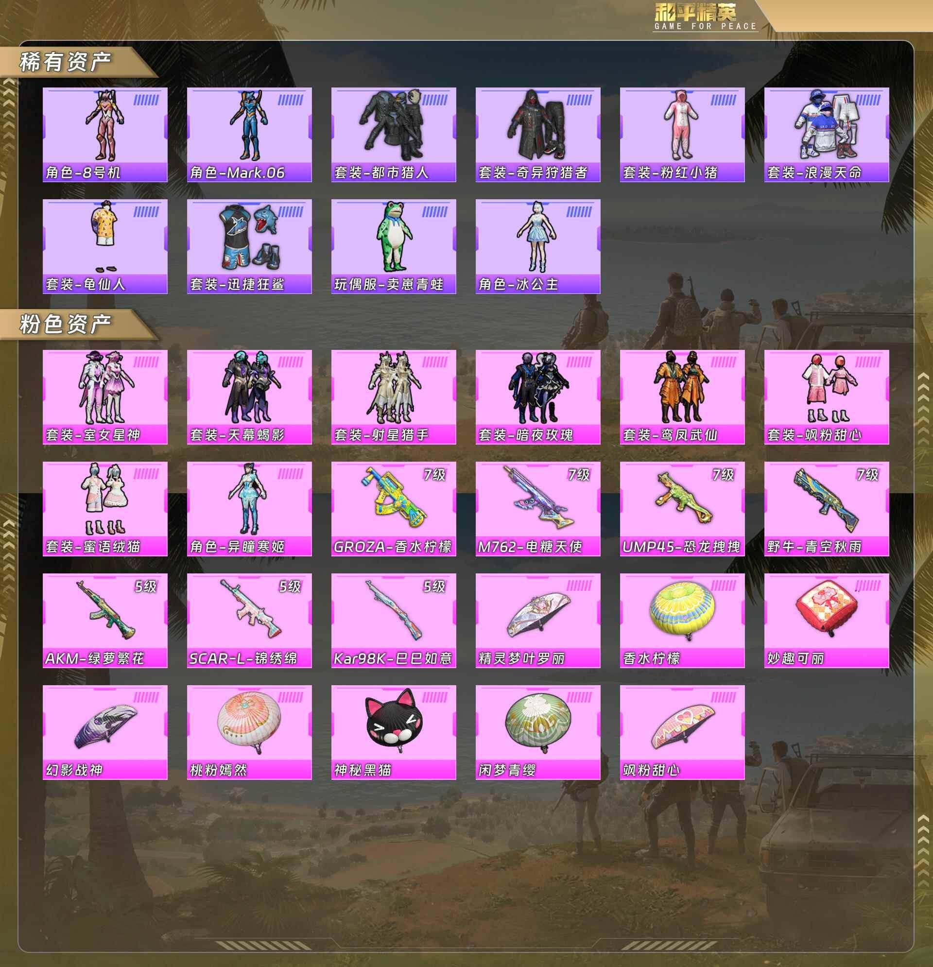 身法号-粉螳螂/蓝螳螂/都市/奇异狩猎者/浪漫天命/室女星神/天幕蝎影/射星猎手/暗夜玫瑰/鸾凤武仙/飒粉甜心/蜜语绒猫/异瞳寒姬/groza香水柠檬7级/m762电糖天使7级/ump45恐龙拽拽7级/野牛青空秋雨7级/ak绿萝繁花5级/scar锦绣绵绵5级/98k巳巳如意5级(8粉套7粉呛)没战神框4317-0粉色飞行器-71435热力值-14王牌印记-170套装-219呛皮 【热门品类