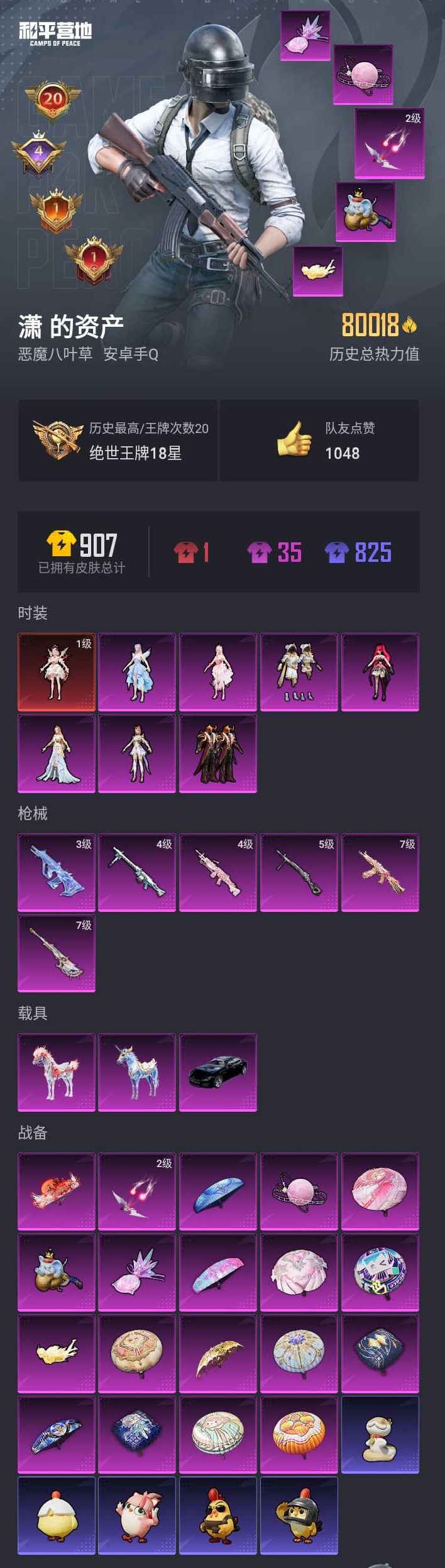 【和平精英】【lyhp20565】7粉装,6特效呛,3载具,历史最高段位:绝世王牌18星 王牌印记20次 热力值:80018,184套装,253呛械,279装备,161战备;套装:暮色玫影-艾丽娅,套装-炙焰牛王,角色-圣堂之誓,角色-星梦奇缘,角色-绯穹魔姬,角色-智耀战神,角色-绝对恒星,套装-极意拳锋,套装-特训学院,套装-猎鹰,套装-青年教官,套装-橘黑制服,套装-红色运动,套装-黄色运动,套装-蓝色运动,套装-黄色伏地魔,套装-白色伏地魔,套装-黑色伏地魔,套装-骑行爱好者,套装-竞技名士,套装-深蓝色名流,套装-酒红色名流,套装-湖蓝色名流,套装-黄色名流,套装-猛禽,套装-长空猛禽,套装-黎明保卫者,套装-海岛探路者,套装-雨林探路者,套装-旭日情侣,套装-冷焰舞者,套装-灼焰舞者,套装-特战装甲,套装-战地督导,套装-甜蜜告白,套装-春日漫步,套装-完美偶像,套装-人气偶像,套装-幻影武者,套装-街头潮人,套装-蓝彩潮人,套装-魅力单车,套装-绮丽涂鸦,套装-竞技达人朋克,套装-野性战心,套装-破晓战魂,套装-都市魅力,套装-热血青春,套装-沙漠兵团,套装-幻世战舞者,套装-甜蜜菠萝,套装-甜蜜熊情侣,套装-青涩时光,套装-缤纷果语,套装-滨海厨神,套装-龙魂突击队,套装-冰川特警,套装-元素星魂,套装-极速红龙,套装-格斗先锋,套装-破蛋小黄鸡,套装-鹤鸣,套装-霓虹街区,套装-萌黄之夏,套装-夏日音浪,套装-探宝勇士,套装-牛气满满,套装-青春冒险家,套装-潮流游乐家,套装-萌趣颜团子,套装-战术大师,套装-ss12特训,套装-牛气冲天,套装-ss18特训,套装-镭射皇者,套装-银白舞王,套装-耀粉歌者,套装-迅捷之星,套装-治愈之星,套装-科技之星,套装-飞行日记,套装-ss13特训,套装-ss14特训,套装-天籁歌者,套装-电音精灵,角色-迪迦奥特曼,套装-吉莉礼服,套装-ss15特训,套装-ss16特训,套装-暴风机械师,套装-时空追击者,套装-暗夜傀儡,套装-ss17特训,套装-水晶王族,套装-瑞龙福将,套装-团圆交子,套装-福星高照,套装-虎虎生威吉莉,套装-空投萌叽,套装-ss19特训,套装-极速竞梦,套装-飞驰魅影,套装-音速流光,套装-ss20特训,套装-甜心亚梦,套装-虚音幻奏,套装-ss21特训,套装-萌趣咩咩,套装-娇憨猪猪,套装-荷畔雨呱,套装-玉兔迎春,套装-ss22特训,套装-田园牧歌,套装-轻风白浪,套装-光之冒险,套装-绯格组合,套装-ss23特训,套装-龙舌兰冰茶,套装-神气柴柴,套装-懵萌河马,套装-妙红点点,套装-幻彩翩翩,套装-王牌教练,套装-柠萌假日,套装-ss24特训,套装-龟仙人,套装-涂山之恋,套装-ss25特训,套装-龙的传人,套装-冰河战士,套装-ss26特训,套装-漫游都市,套装-空岛之星,套装-云魄琉璃,套装-ss27特训,套装-老实芭蕉,套装-ss28特训,角色-极地流光,角色-粉雾星云,套装-街头风暴,套装-ss29特训,角色-无面战甲,套装-异域银装,套装-星途旅人,套装-ss30特训,套装-ss31特训,角色-瑰梦爱神,套装-紫幽梦,套装-粉恋花,套装-ss33特训,角色-猎影月神,套装-云朵鹅,套装-ss32特训,套装-彩虹兔,套装-青翼流星,套装-蓝冰羽,套装-顶瓜瓜,套装-雪绒豹,套装-狂鲨锋刃,套装-大橘大利,套装-星渊小夜曲,套装-炫彩糖果,套装-星影赞美诗,角色-乐音,套装-元气之梦,套装-ss34特训,套装-擎苍青焰,套装-朱霞炽焰,套装-游乐,套装-凌霄紫焰,套装-薄荷星砂,套装-ss35特训,套装-午间小调,套装-风迹短诗,套装-琴音绮想,角色-超感刻度,套装-画境星梦,套装-书海巡游,角色-甜心蒙太奇,角色-杯旋调茶师,套装-ss36特训,套装-雪国风尚,套装-超能元气,套装-萌鸡速递;呛皮:ace32-画境星梦,ace32-冰晶雪宝,scar-l-红色方程式,scar-l-凝视深渊,scar-l-王牌四分卫,scar-l-炫彩节奏,scar-l-彩虹符号,scar-l-玉兔迎春,scar-l-星途旅人,scar-l-海盐豹豹,蜜獾-娇憨猪猪,蜜獾-天降萌叽,蜜獾-风迹短诗,蜜獾-乌木金纹,m762-牛气冲天,m762-镭射皇者,m762-瑞龙福将,m762-彩虹符号,m762-天降萌叽,m762-云朵鹅,mk47-青春冒险家,mk47-洛神天依,mk47-乌木金纹,mk47-妙红点点,mk47-风迹短诗,akm-破晓战魂,akm-霓虹街区,akm-夜灯,akm-锦绣火鲤,akm-涂鸦街区,akm-彩虹符号,akm-萌趣颜团子,akm-虎虎生威,akm-龙的传人,akm-霓彩脉冲,famas-霓彩脉冲,famas-乌木金纹,m16a4-蓝色火焰,m16a4-红色方程式,m16a4-甜心亚梦,m16a4-幻世战舞者,groza-治愈之星,groza-彩虹符号,groza-田园牧歌,groza-懵萌河马,groza-海盐豹豹,groza-无面战甲,groza-暮色玫影,g36c-时空追击者,g36c-懵萌河马,g36c-星穹咏叹调,g36c-乌木金纹,m416-夜灯,m416-蓝色火焰,m416-红色方程式,m416-糯团青竹,3级aug-星梦奇缘,aug-耀粉歌者,aug-青春冒险家,aug-天降萌叽,aug-异域银装,aug-绝对恒星,aug-冰晶雪宝,aug-紫晶流影,q-彩虹符号,q-洛神天依,q-飞驰魅影,ac-val-甜心亚梦,ac-val-乌木金纹,ac-val-六号稻草人,arx-凌霄紫焰,win94-夏日绵绵冰,win94-瑞龙福将,win94-乌木金纹,莫辛纳甘-乌木金纹,莫辛纳甘-懵萌河马,莫辛纳甘-风迹短诗,svd-云朵鹅,m24-治愈之星,m24-炫彩节奏,m24-青空秋雨,m24-乌木金纹,awm-垂柳戏鸭,awm-暮色玫影,awm-乌木金纹,7级amr-智耀战神,amr-妙红点点,amr-鸡智如我,amr-乌木金纹,kar98k-红色方程式,kar98k-彩虹符号,kar98k-炫彩节奏,kar98k-洛神天依,kar98k-飞驰魅影,kar98k-星穹咏叹调,kar98k-乌木金纹,sks-炫彩节奏,sks-时空追击者,sks-糯团青竹,sks-圣域龙灵,vss-镭射皇者,vss-田园牧歌,vss-彩虹符号,qbu-青春冒险家,mini14-耀粉歌者,mini14-海渊国主,mini14-绯穹魔姬,mk20-h-星梦奇缘,mk20-h-圣域龙灵,mk20-h-狂鲨锋刃,mk20-h-乌木金纹,mk14-治愈之星,mk14-乌木金纹,mk14-冰河战士,mk14-