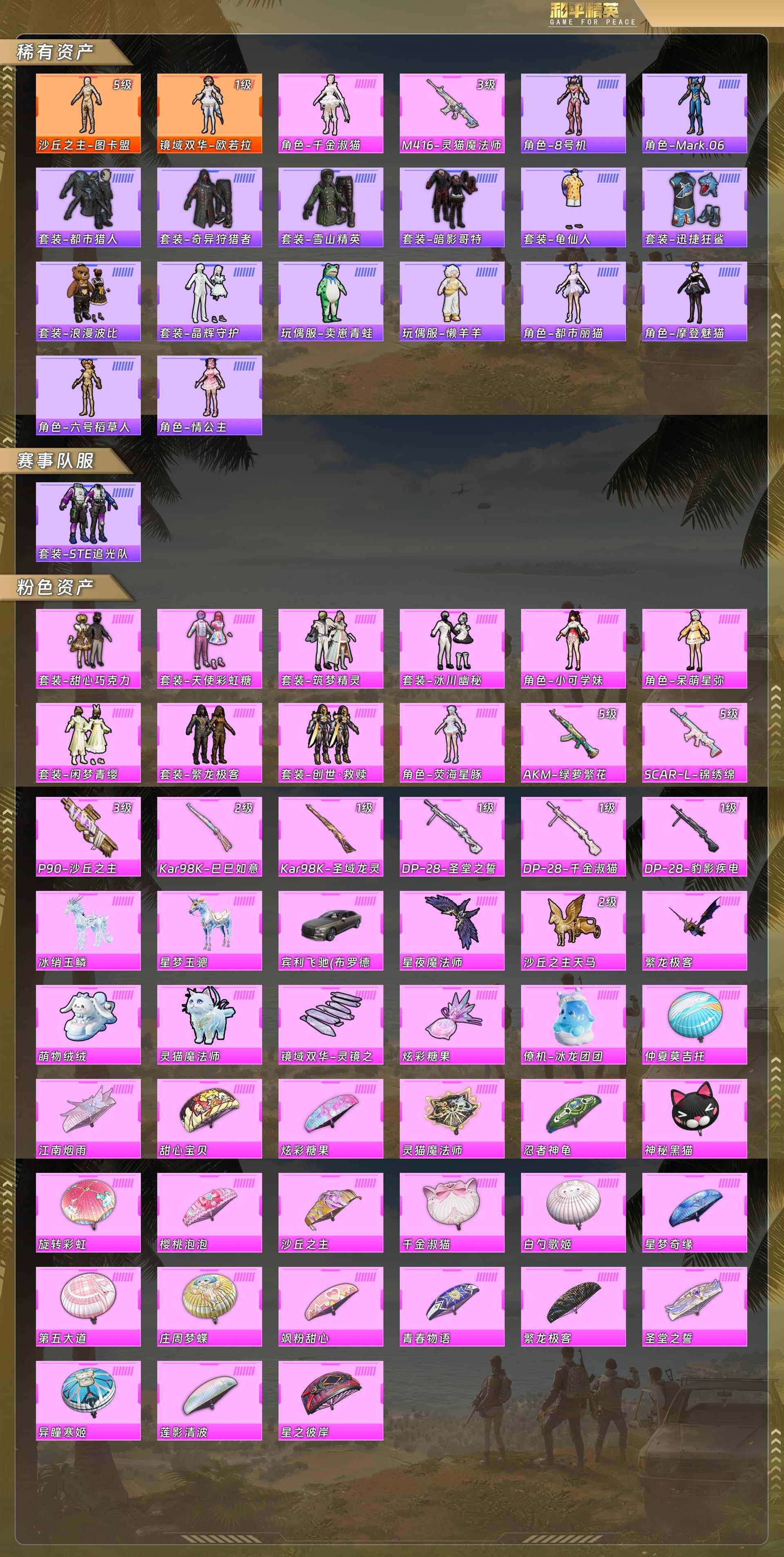 3载具-240套装-302呛皮-身法号-图卡盟[5级]/欧若拉[1级]/甜心巧克力/千金淑猫/都市猎人/暗影哥特/晶辉守护/都市丽猫/摩登魅猫/六号稻草人/ste追光队服/天使彩虹糖/筑梦精灵/冰川幽秘/小可学妹/呆萌星弥/闲梦青缨/繁龙极客/创世·救赎/荧海星豚/m416-灵猫魔法师[3级]/p90-沙丘之主[3级]/冰绡玉鳞/星梦玉骢/宾利飞驰布罗德盖棕双色没战神框 hp5113 【红色神装等级】:镜域双华-欧若拉
