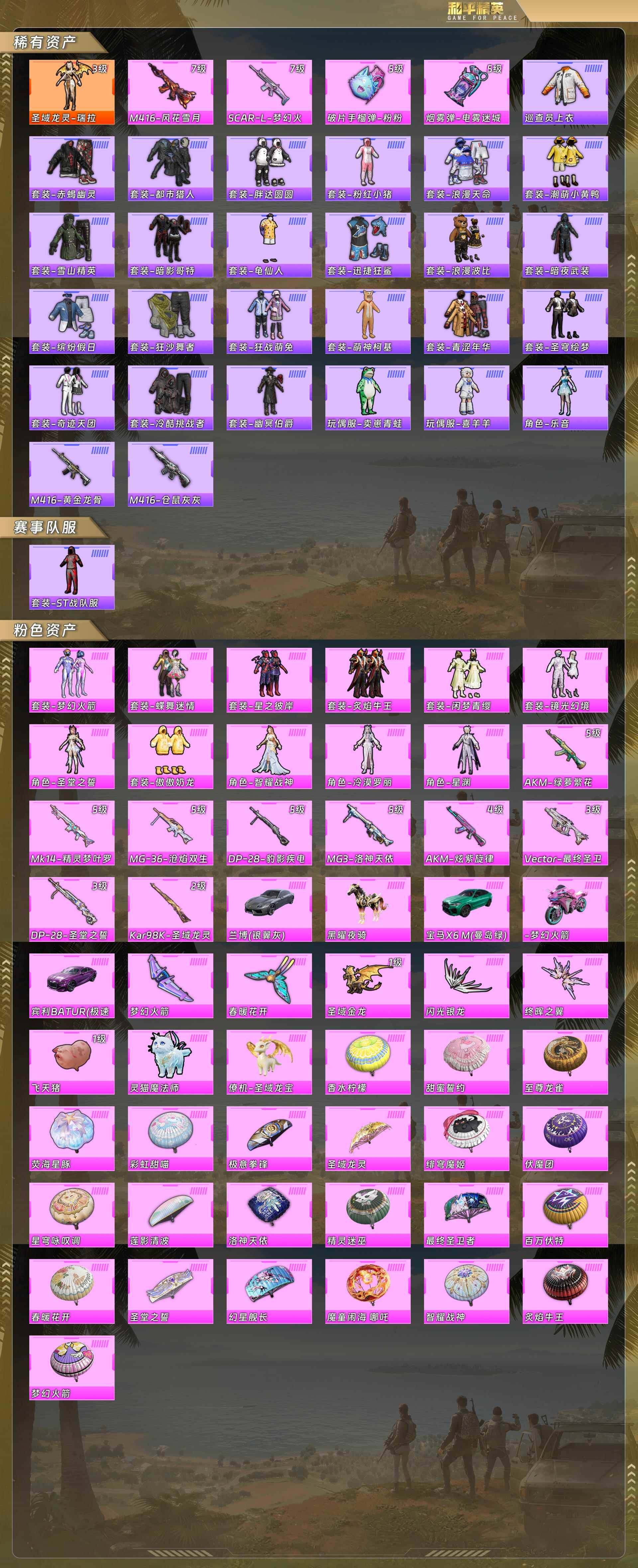 素材号-3级瑞拉/巡查衣/赤蝎/都市/浪漫天命/红眼罩/梦幻火箭/蝶舞迷情/星之彼岸/闲梦青缨/镜光幻境/圣堂之誓/傲傲奶龙/智耀战神/冷漠罗丽/mk14精灵梦叶罗丽5级/mg36沧焰双生5级/mg3洛神天依5级/ak炫紫旋律4级/dp28圣堂之誓3级/98k圣域龙灵2级/兰博基尼灰/黑曜夜骑/宝马绿/摩托梦幻火箭/宾利紫(1神装11粉套13粉呛5载具)没战神框4992-7粉色