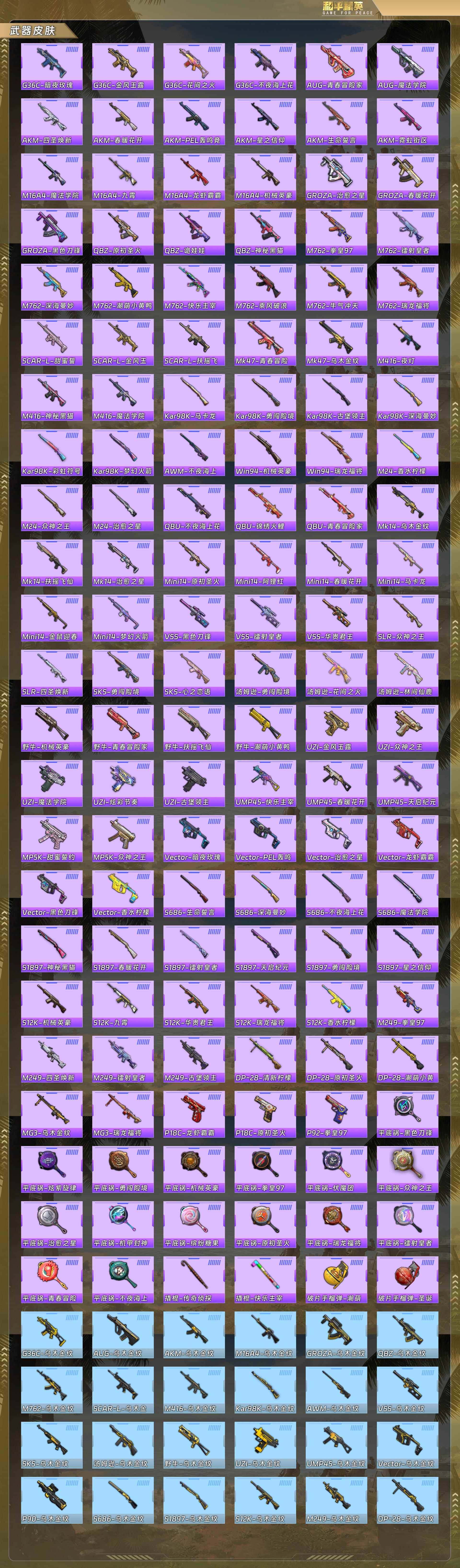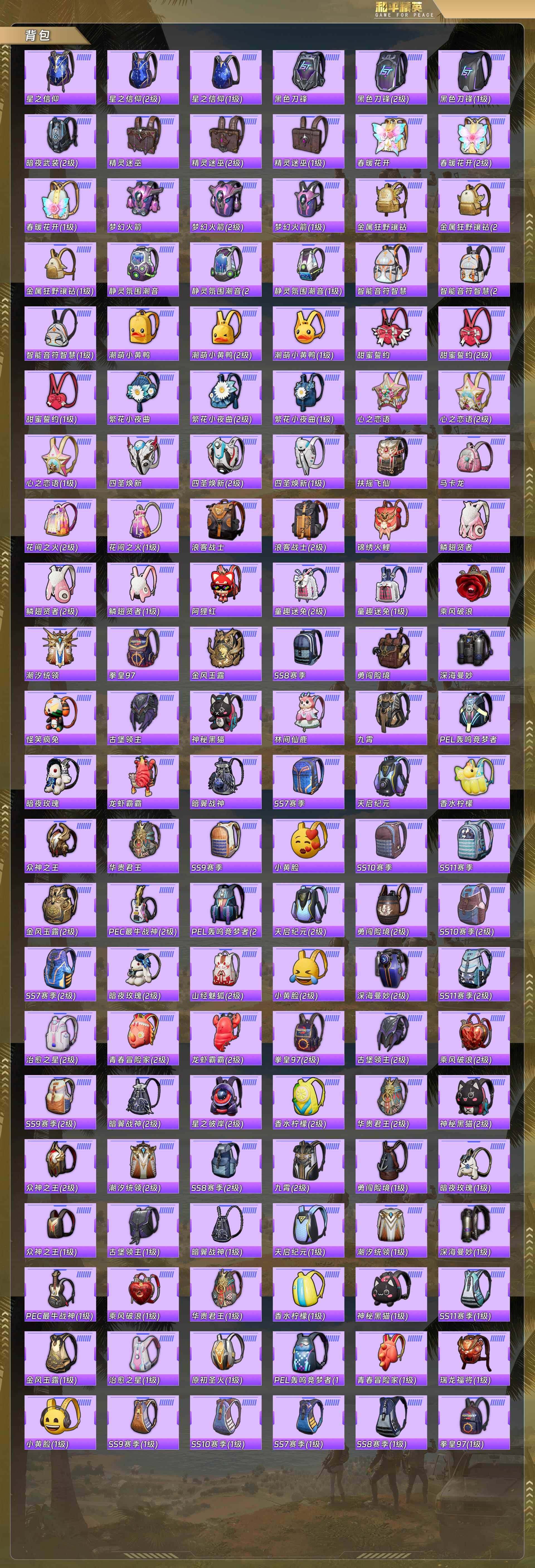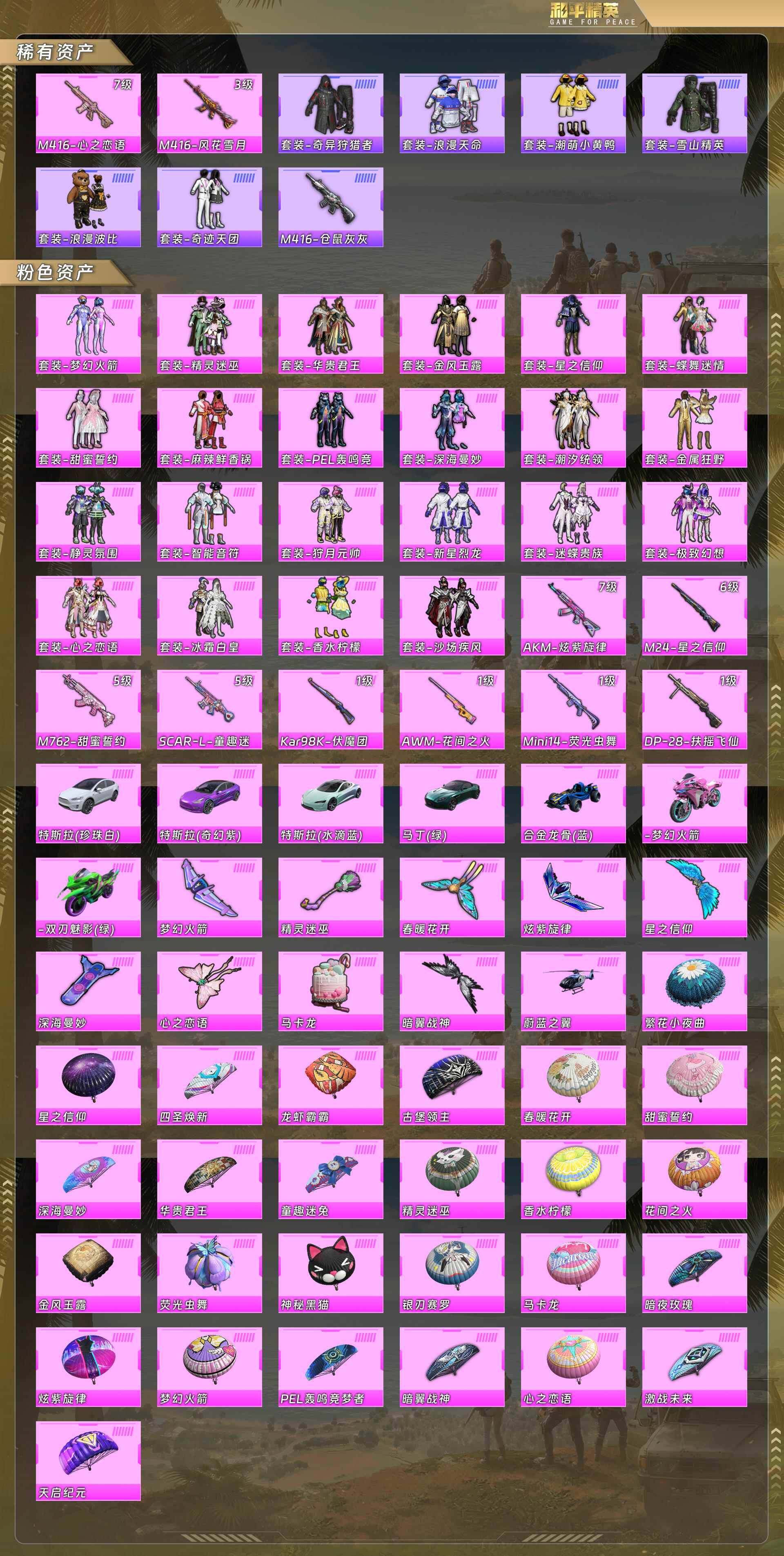 身法号-奇异狩猎者/浪漫天命/梦幻火箭/金风玉露/星之信仰/蝶舞迷情/甜蜜誓约/深海曼妙/金属狂野/静灵氛围/智能音符/新星烈龙/极致幻想/心之恋语/香水柠檬/m4心之恋语7级/ak炫紫旋律7级/m762甜蜜誓约5级/scar童趣迷兔5级/特斯拉白/特斯拉紫/特斯拉蓝/阿斯顿马丁绿/合金龙骨(蓝)/摩托梦幻火箭/摩托双刃魅影绿(22粉套10粉呛7载具)没战神框5212-