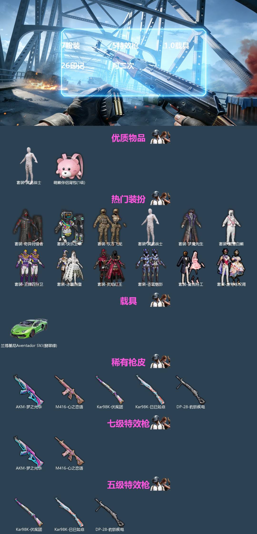 7粉装 5特效呛 1.0载具 26印记 可二次 【热门装扮】奇异狩猎者快乐主宰东方飞龙冥河战士老木乃伊梦魇先生爱崽白熊王牌四分卫冰霜白皇炙焰红王苍蓝魅影蜜桃特工星穹咏叹调 【载具】兰博基尼aventad svj翡翠绿 【稀有呛皮】akm梦之光华m416心之恋