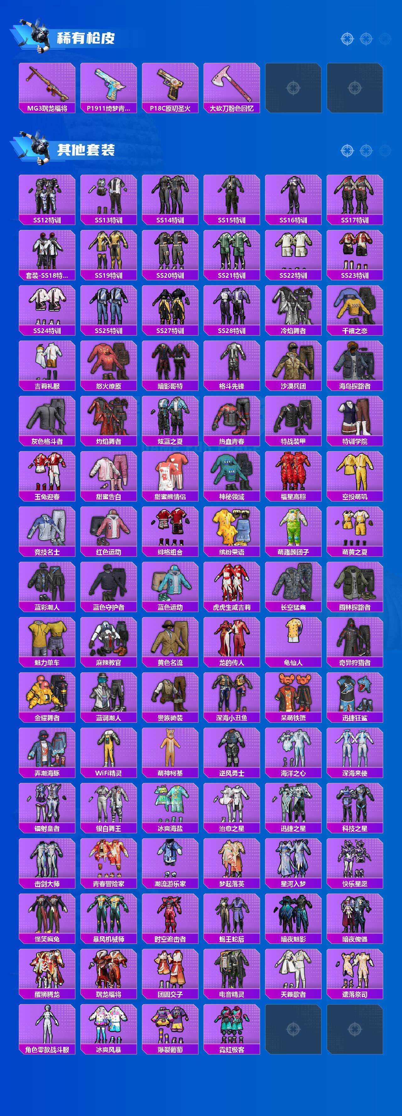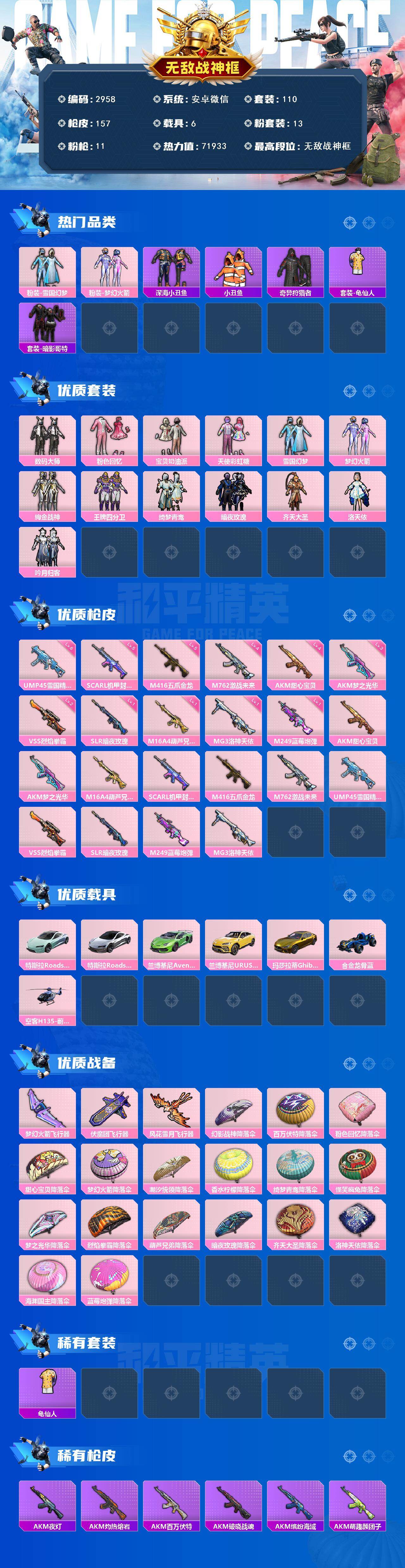 6载具-110套装-157呛皮-110套装/呛械11/装备182/载具6/战备97/王牌印记5/热力值71933/四级akm-甜心宝贝/三级akm-梦之光华/m16a4-葫芦兄弟/五级scar-l-机甲封神/五级m416-五爪金龙/四级m762-激战未来/六级ump45-雪国精灵/二级vss-烈焰拳霸/slr-暗夜玫瑰/m249-蓝莓炮弹/mg3-洛神天依/粉装-雪国幻梦/粉装-梦幻火箭/深海小丑鱼/小丑鱼/奇异狩猎者/套装