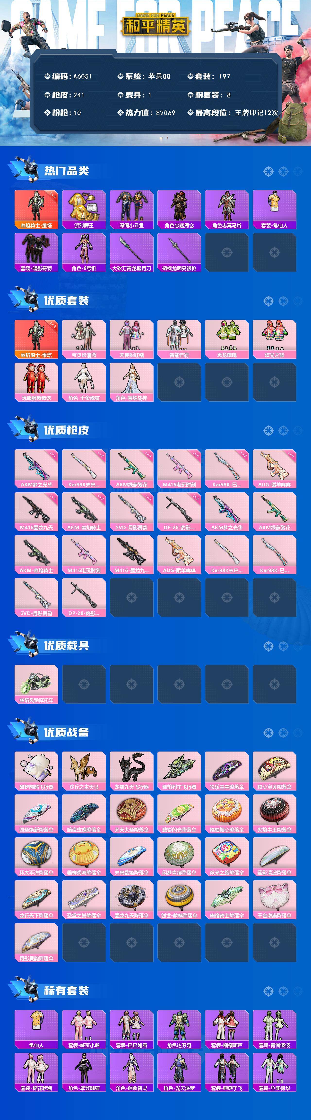 [16661684]苹果 【神装号 幽焰骑士-维塔二级/派对舞王/深海小丑鱼/暗影哥特/8号机/akm-梦之光华七级/m416-电玩时刻五级/m416-墨龙九天三级/幽焰风驰摩托车】手q-1神装-8粉装-10特效呛-1载具-7粉色飞行器-82069热力值-12王牌印记-197套装-241呛皮 【红色神装等级】:幽焰骑士-维塔二级 【红色角色神装】:幽焰骑士-维塔 【热门品类】:套装-派对舞王,套装-深海小丑鱼,角色-忠猛周仓,角色-忠真马岱,套装-龟仙人,套装-暗影哥特,角色-8号机,大砍刀-青龙偃月刀,撬棍-龙胆亮银呛 【粉色套装】:粉装-宝贝奶油派,粉装-天使彩虹糖,粉装-智能音符,粉装-恐龙拽拽,粉装-炫光之旅,玩偶服-猪猪侠,角色-千金淑猫,角色-智耀战神 【粉色呛皮等级】:akm-梦之光华七级,akm-绿萝繁花五级,akm-幽焰骑士三级,m416-电玩时刻五级,m416-墨龙九天三级,aug-暖羊咩咩五级,kar98k-未来歌姬六级,kar98k-巳巳如意五级,svd-月影灵韵三级,dp-28-豹影疾电二级 【粉色载具】:幽焰风驰摩托车 【粉色呛皮】:akm-梦之光华,akm-绿萝繁花,akm-幽焰骑士,m416-电玩时刻,m416-墨龙九天,aug-暖羊咩咩,kar98k-未来歌姬,kar98k-巳巳如意,svd-月影灵韵,dp-28-豹影疾电 【粉色飞行器】:酣梦熊熊飞行器,沙丘之主天马,龙翔九天飞行器,幽焰列车飞行器 【粉色降落伞】:快乐主宰降落伞,甜心宝贝降落伞,四圣焕新降落伞,暗夜玫瑰降落伞,齐天大圣降落伞,碧影闪光降落伞,橘柚倾心降落伞,炙焰牛王降落伞,环太平洋降落伞,垂柳戏鸭降落伞,未来歌姬降落伞,闲梦青缨降落伞,炫光之旅降落伞,莲影清波降落伞,龙行天下降落伞,圣堂之誓降落伞,墨龙九天降落伞,创世·救赎降落伞,幽焰骑士降落伞,千金淑猫降落伞,月影灵韵降落伞 【稀有套装】:套装-龟仙人,套装-绒宝小鹅,套装-巳巳如意,角色-达芬奇,套装-糖糖葫芦,套装-青团波波,套装-棉花软糖,角色-摩登魅猫,角色-俏兔智灵,角色-光矢逐梦,套装-燕燕于飞,套装-鱼渊荷华,角色-海琴烟,角色-瑰梦爱神,角色-绯色魅影 【稀有呛皮】:akm-夜灯,akm-彩虹符号,akm-江南烟雨,akm-灼热熔岩,akm-王牌投手,a