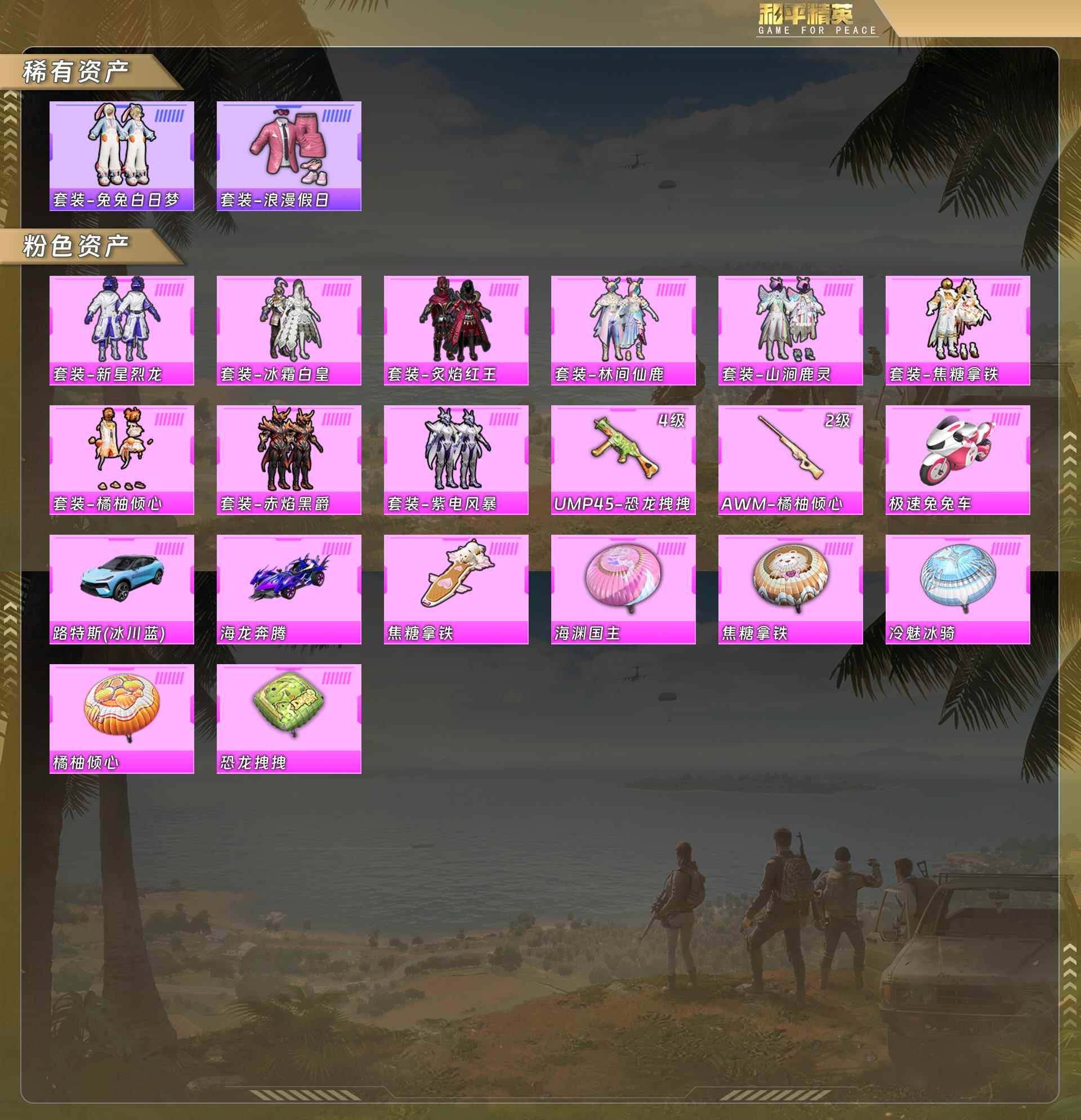 (9粉装-2粉呛-3载具)兔兔白日梦/浪漫假日/新星烈龙/冰霜白皇/炙焰红王/林间仙鹿/山涧鹿灵/焦糖拿铁/橘柚倾心/赤焰黑爵/紫电风暴/极速兔兔车/路特斯蓝/海龙奔腾 没战神框 5593-1粉色飞行器-22858热力值-1王牌印记-55套装-45呛皮 【粉色套装】:粉装-新星烈龙,粉装-冰霜白皇,粉装-炙焰红王,粉装-林间仙鹿,粉装-山涧鹿灵,粉装-焦糖拿铁,粉装-橘柚倾心,粉装-赤