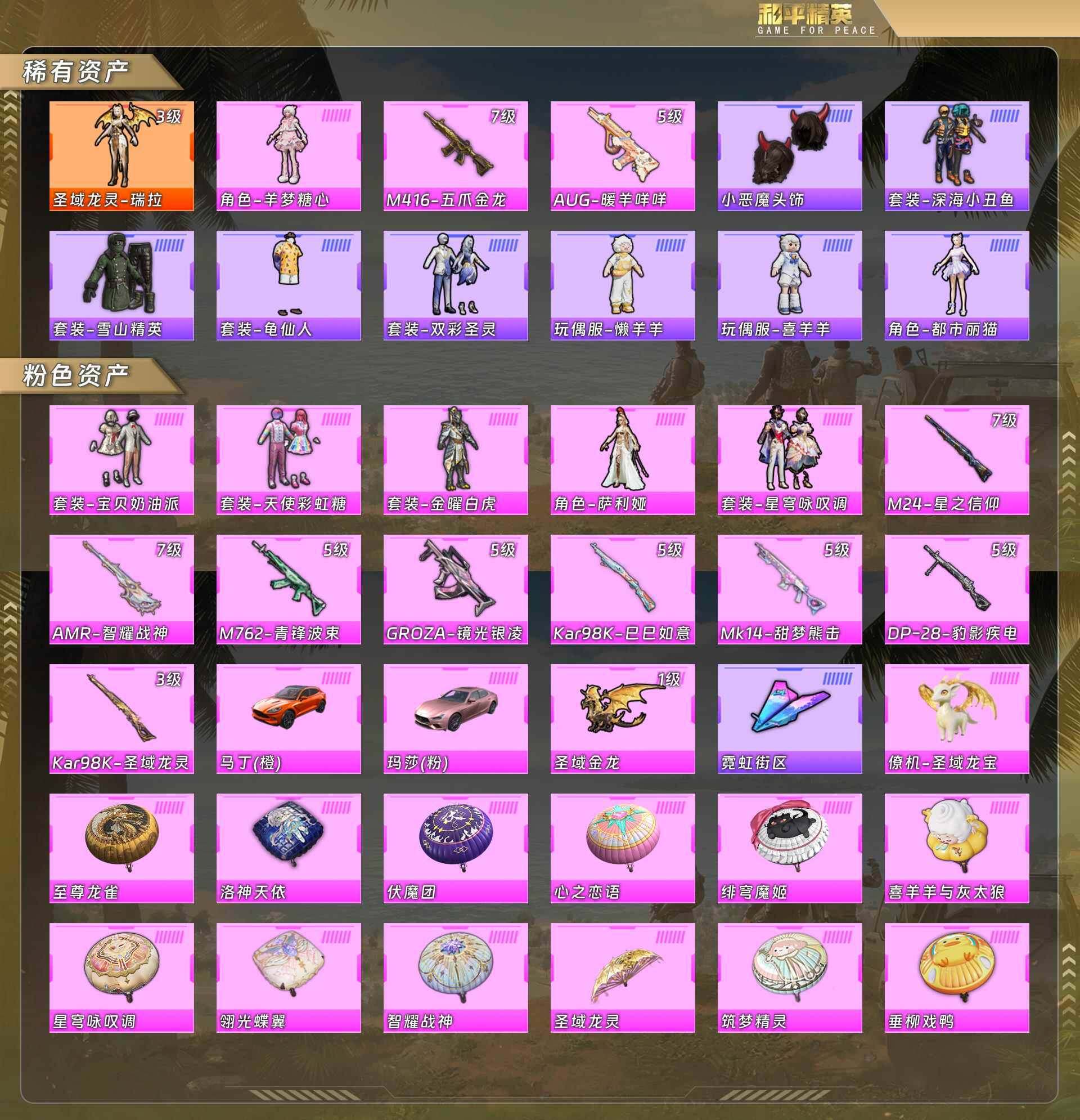 公主号-圣域龙灵瑞拉3级/羊梦糖心/m4五爪金龙7级/aug暖羊咩咩5级/小恶魔头饰/深海小丑鱼/双彩圣灵/懒羊羊/喜羊羊/都市丽猫/宝贝奶油派/天使彩虹糖/金曜白虎/萨利娅/星穹咏叹调/阿斯顿马丁橙/玛莎拉蒂粉 (1神装-6粉装-10粉呛-2载具)没战神框 5604-1粉色飞行器-92891热力值-23王牌印记-233套装-293呛皮 【红色神装等级】:圣域龙灵-瑞拉三级 【