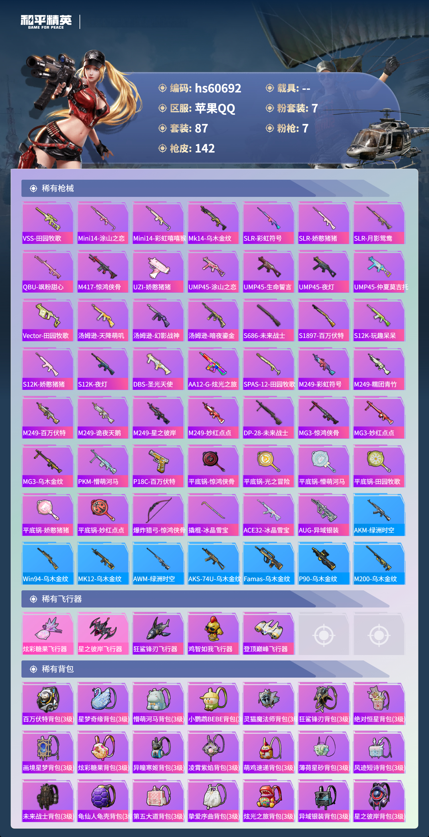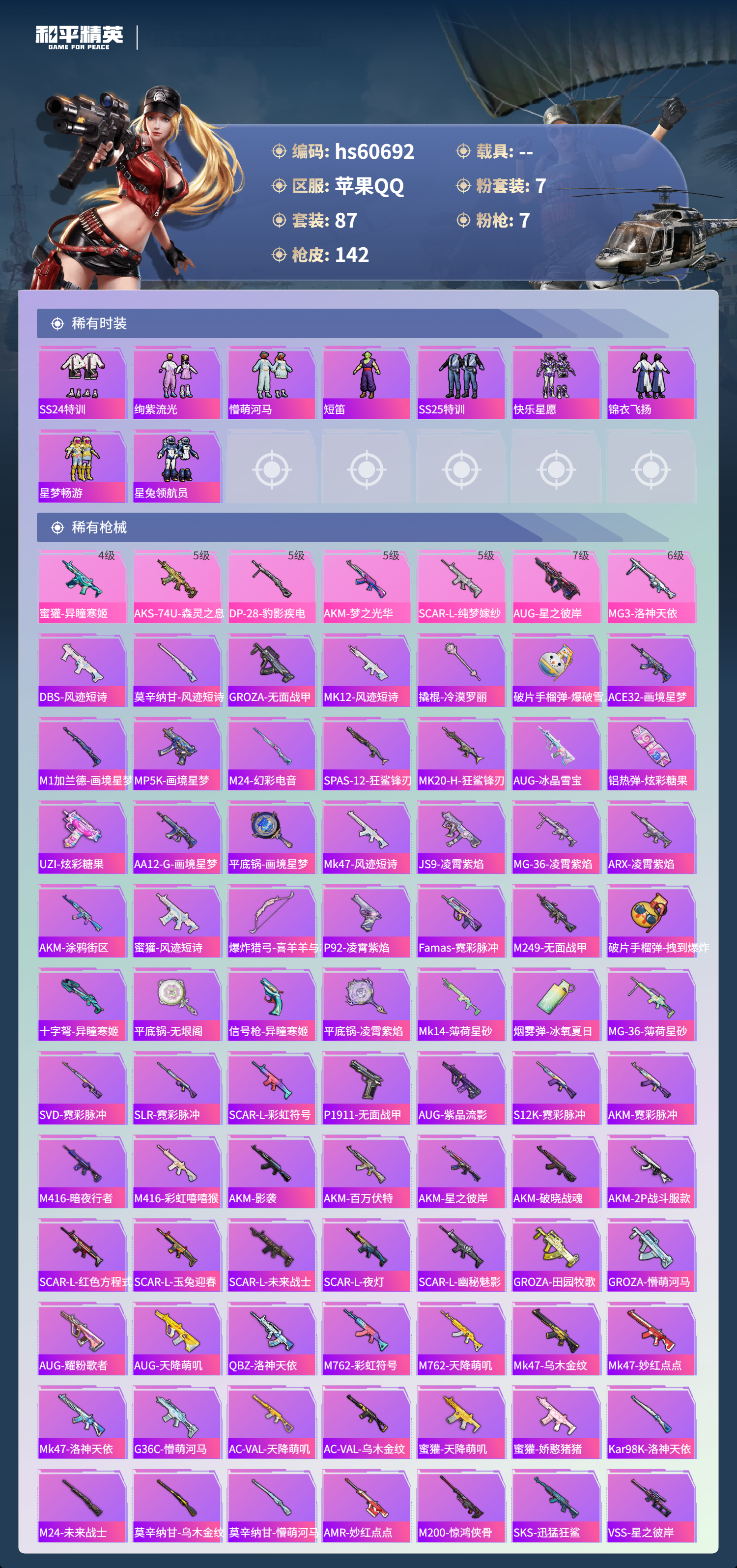 0载具-87套装-142呛皮-hs60692 苹果手q-8王牌印记-7粉装-7特效呛-44922热力值-87套装-142呛皮-1卓越印记【7粉装】套装-甜梦冰蝶套装-挚爱序曲角色-千金淑猫套装-音爆索尼克套装-第五大道角色-洛天依角色-异瞳寒姬【7特效呛】蜜獾-异瞳寒姬/4级aug-星之彼岸/7级dp-28-豹影疾电/5级mg3-洛神天依/6级akm-梦之光华/5级aks-74u-森灵之息/5级sc