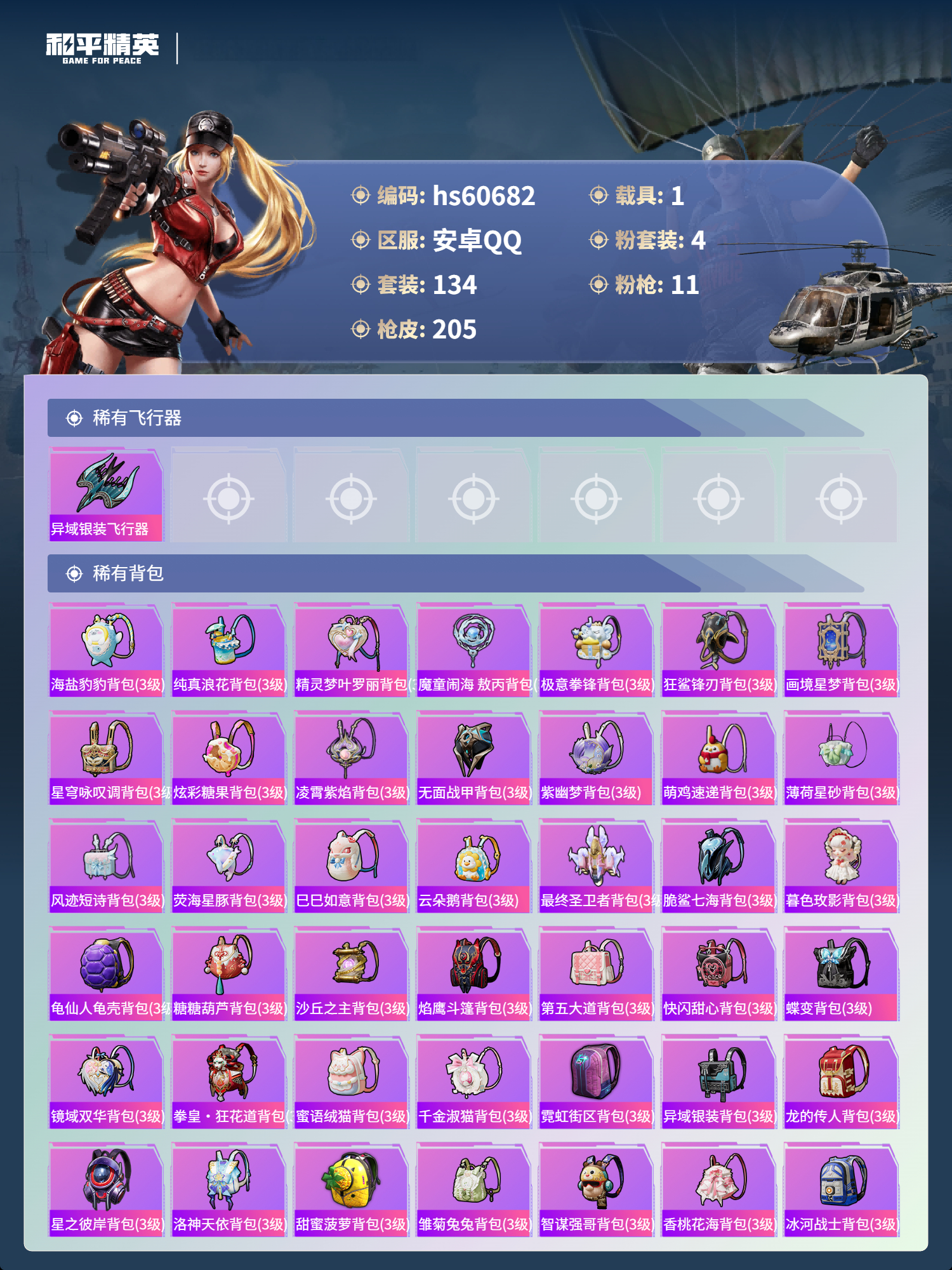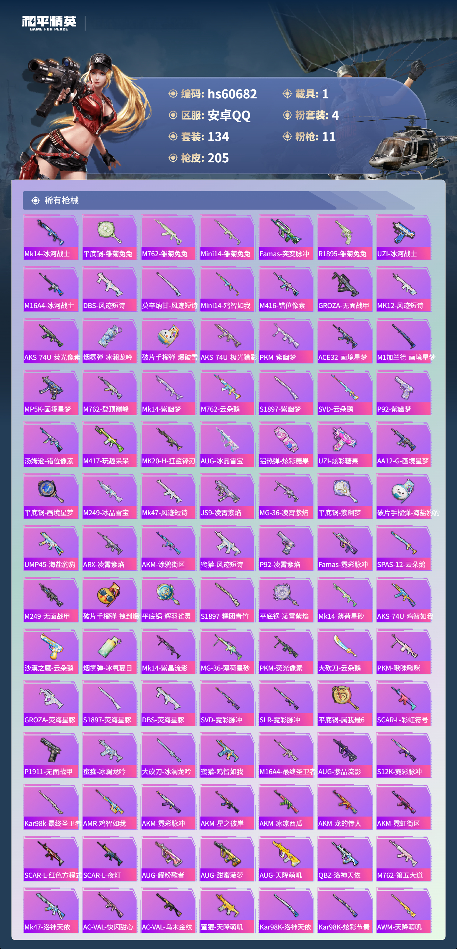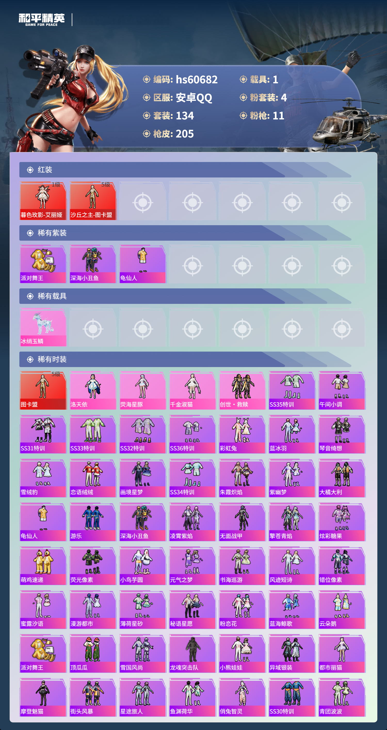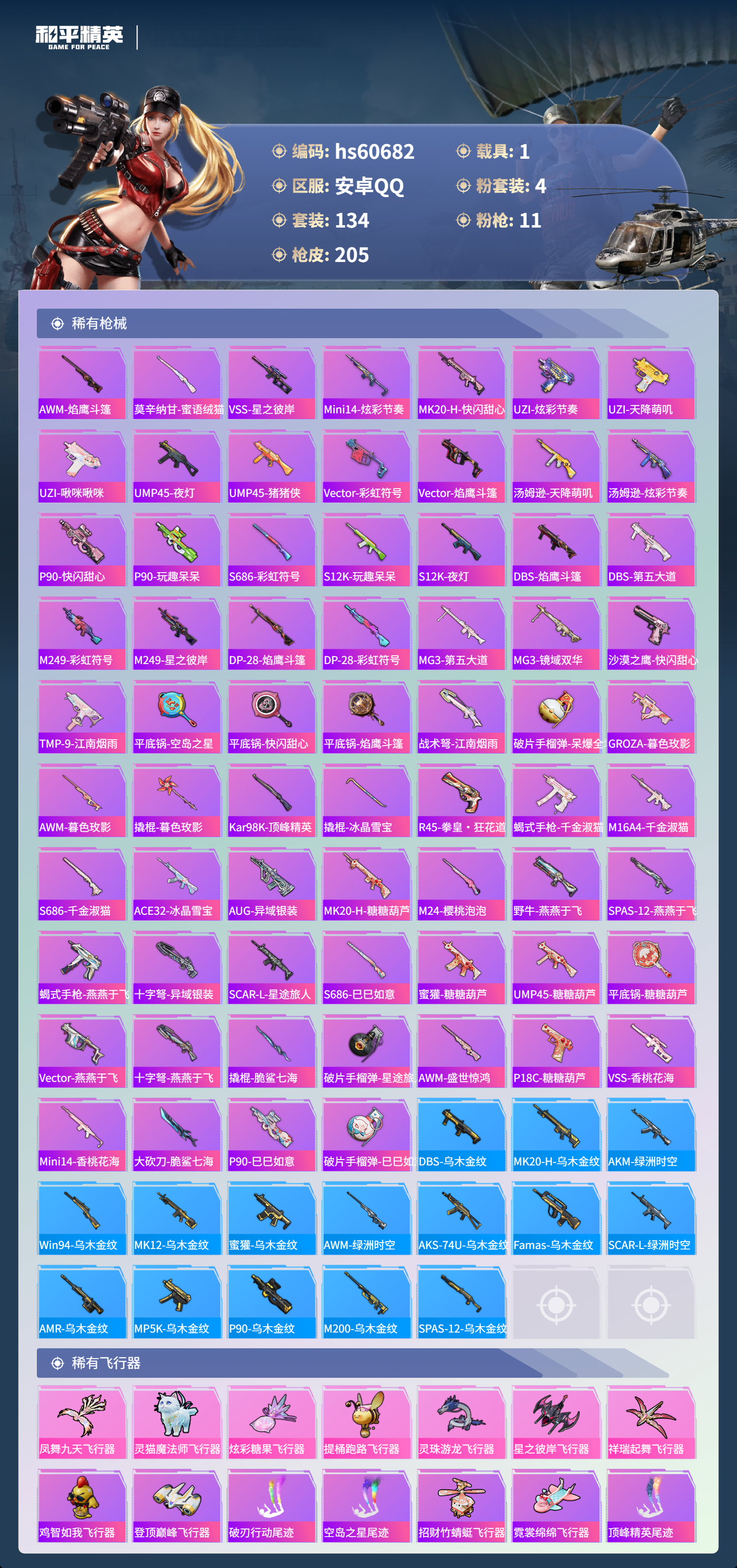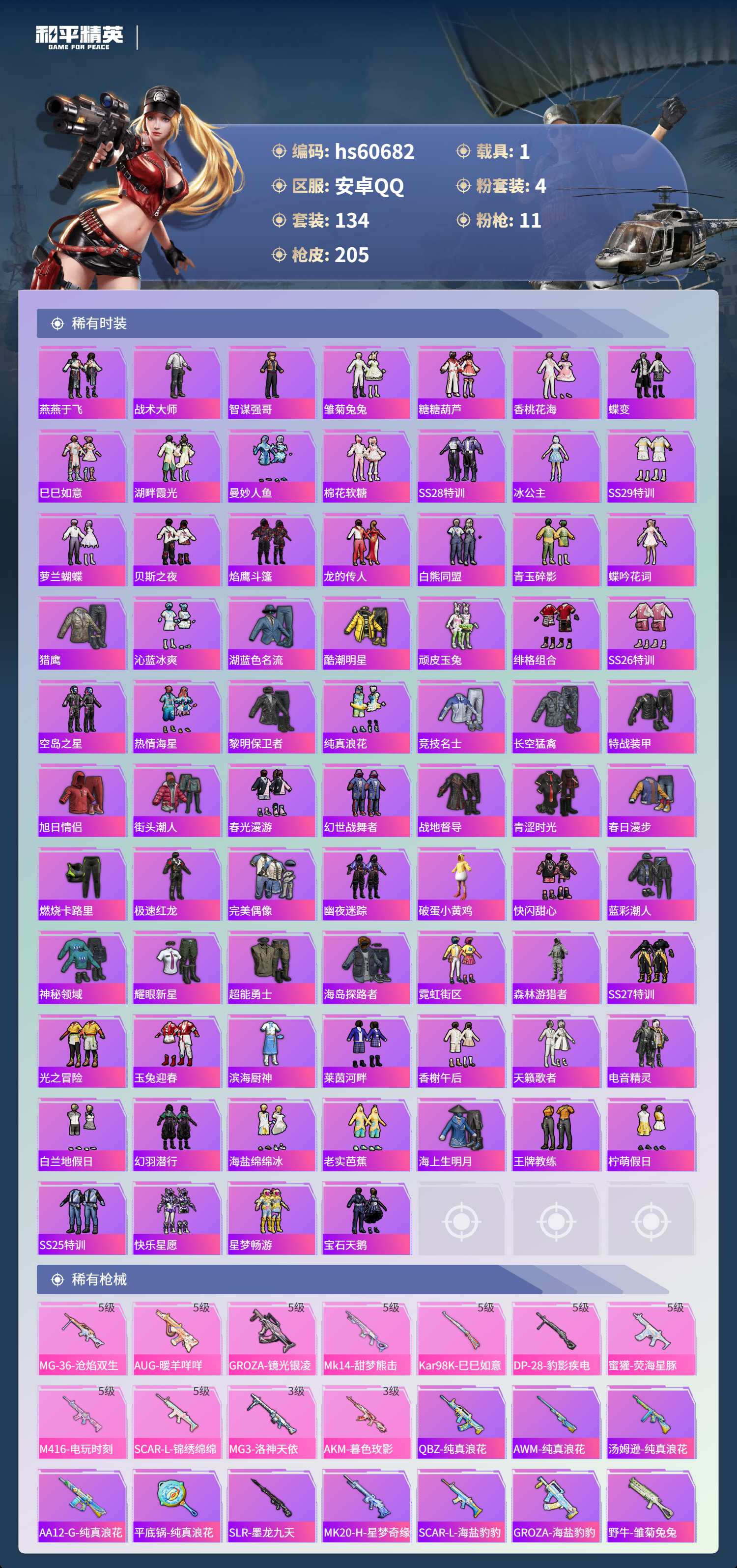 1载具-134套装-205呛皮-hs60682 安卓手q-11王牌印记-2红装-4粉装-11特效呛-1载具-73059热力值-134套装-205呛皮-10卓越印记-1传奇印记【2红装】沙丘之主-图卡盟/5级暮色玫影-艾丽娅/1级【4粉装】角色-千金淑猫角色-洛天依角色-荧海星豚套装-创世·救赎【11特效呛】dp-28-豹影疾电/5级mg-36-沧焰双生/5级scar-l-锦绣绵绵/5级mk14-甜梦熊击/5级