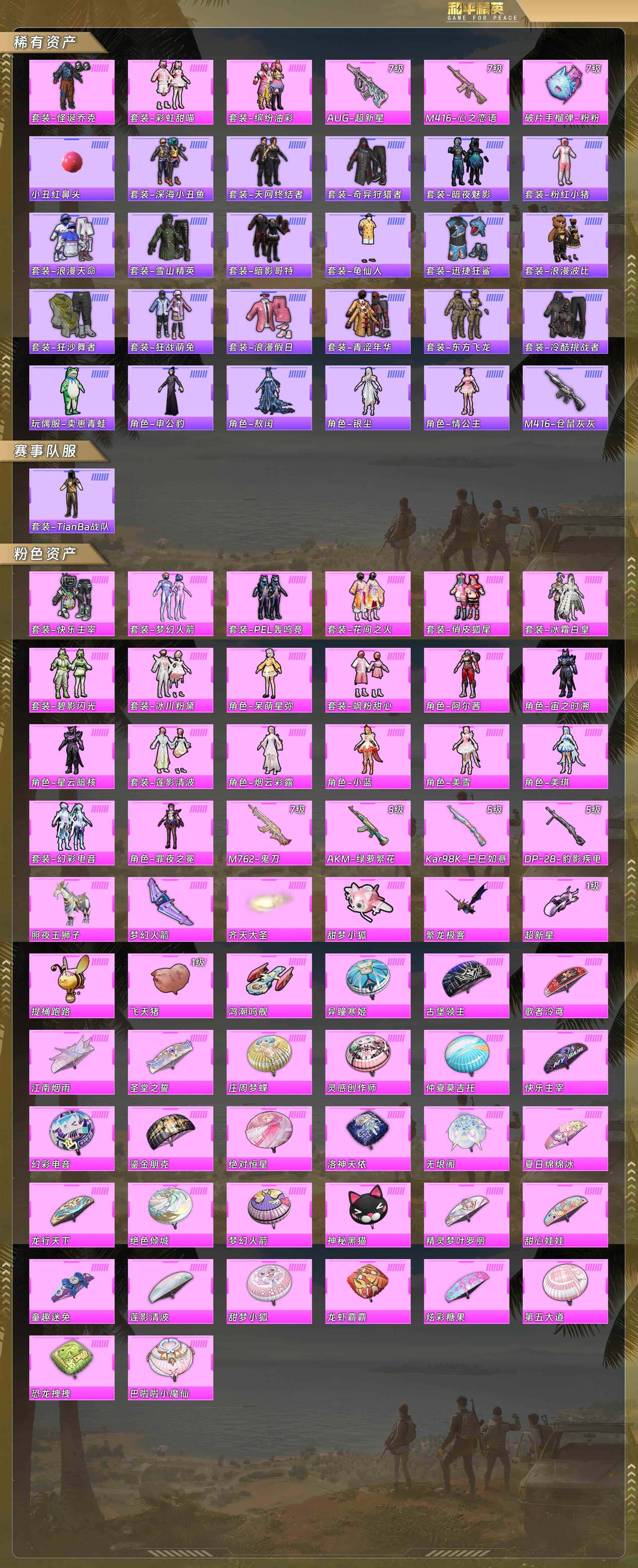 素材号-地铁满天赋/天网/小丑/奇异狩猎者/红眼罩/浪漫天命/深海小丑鱼/彩虹甜喵/猪脸/aug超新星7级/m4心之恋语7级/快乐主宰/梦幻火箭/花间之火/俏皮狐尾/冰霜白皇/碧影闪光/冰川粉黛/呆萌星弥/飒粉甜心/阿尔茜/宙之时溯/星云暗核/莲影清波/烟云彩露/小蓝/美雪/美琪/幻彩电音/罪夜之冕/m762鬼刀7级/ak绿萝繁花5级/照夜玉狮子(23粉套7粉呛1载具)没战神框5619-8