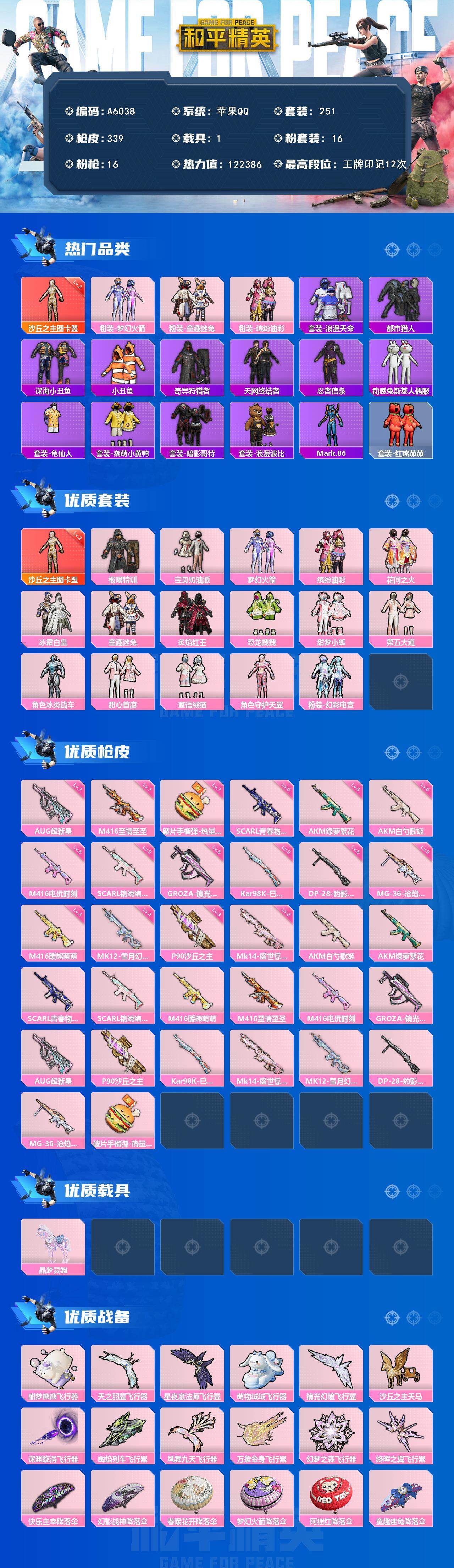 [16663267]苹果 【神装号 沙丘之主-图卡盟二级/梦幻火箭/缤纷油彩/童趣迷兔/都市猎人/浪漫天命/深海小丑鱼/奇异狩猎者/天网终结者/暗影哥特/浪漫波比/mark.06/红熊茄茄/m416-至情至圣七级/p90-沙丘之主三级/晶梦灵驹】手q-1神装-16粉装-16特效呛-1载具-14粉色飞行器-122386热力值-12王牌印记-251套装-339呛皮 【红色神装等级】:沙丘之主-图卡盟二级 【红色角色神装】:沙丘之主-图卡盟 【热门品类】:粉装-梦幻火箭,粉装-童趣迷兔,粉装-缤纷油彩,套装-浪漫天命,套装-都市猎人,套装-深海小丑鱼,套装-小丑鱼,套装-奇异狩猎者,套装-天网终结者,套装-忍者信条,套装-动感兔斯基人偶服,套装-龟仙人,套装-潮萌小黄鸭,套装-暗影哥特,套装-浪漫波比,角色-mark.06,套装-红熊茄茄 【粉色套装】:粉装-极限特训,粉装-宝贝奶油派,粉装-梦幻火箭,粉装-缤纷油彩,粉装-花间之火,粉装-冰霜白皇,粉装-童趣迷兔,粉装-炙焰红王,粉装-恐龙拽拽,粉装-甜梦小狐,粉装-第五大道,角色-冰炎战车,粉装-甜心首席,粉装-蜜语绒猫,角色-守护天翼,粉装-幻彩电音 【粉色呛皮等级】:akm-白勺歌姬五级,akm-绿萝繁花五级,scar-l-青春物语五级,scar-l-锦绣绵绵五级,m416-暖熊萌萌四级,m416-至情至圣七级,m416-电玩时刻五级,groza-镜光银凌五级,aug-超新星七级,p90-沙丘之主三级,kar98k-巳巳如意五级,mk14-盛世惊鸿三级,mk12-雪月幻音四级,dp-28-豹影疾电五级,mg-36-沧焰双生五级,破片手留单-热量炸弹七级 【粉色载具】:晶梦灵驹 【粉色呛皮】:akm-白勺歌姬,akm-绿萝繁花,scar-l-青春物语,scar-l-锦绣绵绵,m416-暖熊萌萌,m416-至情至圣,m416-电玩时刻,groza-镜光银凌,aug-超新星,p90-沙丘之主,kar98k-巳巳如意,mk14-盛世惊鸿,mk12-雪月幻音,dp-28-豹影疾电,mg-36-沧焰双生,破片手留单-热量炸弹 【粉色飞行器】:酣梦熊熊飞行器,天之羽翼飞行器,星夜魔法师飞行翼,萌物绒绒飞行器,镜光幻境飞行翼,沙丘之主天马,深渊漩涡飞行器,幽焰列车飞行器