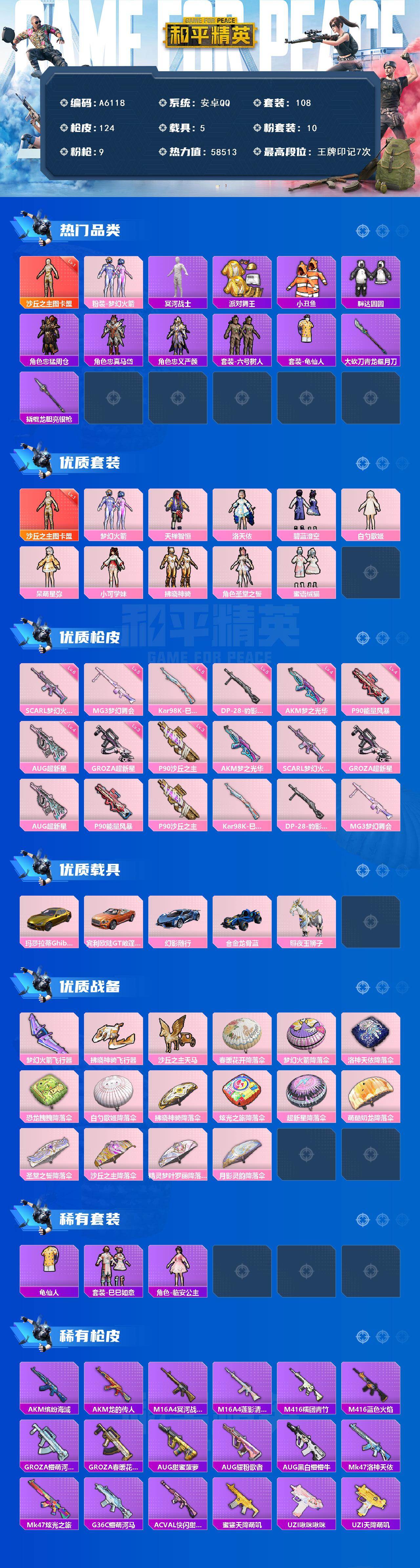 [16664338]安卓 【神装号 沙丘之主-图卡盟一级/梦幻火箭/冥河战士/派对舞王/洛天依/akm-梦之光华四级/scar-l-梦幻火箭六级/p90-沙丘之主三级/玛莎拉蒂ghibli(金)】手q-1神装-10粉装-9特效呛-5载具-3粉色飞行器-58513热力值-7王牌印记-108套装-124呛皮 【红色神装等级】:沙丘之主-图卡盟一级 【红色角色神装】:沙丘之主-图卡盟 【热门品类】:粉装-梦幻火箭,套装-冥河战士,套装-派对舞王,套装-小丑鱼,套装-胖达圆圆,角色-忠猛周仓,角色-忠真马岱,角色-忠义严颜,套装-六号树人,套装-龟仙人,大砍刀-青龙偃月刀,撬棍-龙胆亮银呛 【粉色套装】:粉装-梦幻火箭,粉装-天禅智恒,角色-洛天依,粉装-碧蓝澄空,角色-白勺歌姬,角色-呆萌星弥,角色-小可学妹,粉装-拂晓神骑,角色-圣堂之誓,粉装-蜜语绒猫 【粉色呛皮等级】:akm-梦之光华四级,scar-l-梦幻火箭六级,groza-超新星三级,aug-超新星四级,p90-能量风暴四级,p90-沙丘之主三级,kar98k-巳巳如意五级,dp-28-豹影疾电五级,mg3-梦幻舞会五级 【粉色载具】:玛莎拉蒂ghibli(金),宾利欧陆gt敞篷(火焰橘),幻影随行,合金龙骨(蓝),照夜玉狮子 【粉色呛皮】:akm-梦之光华,scar-l-梦幻火箭,groza-超新星,aug-超新星,p90-能量风暴,p90-沙丘之主,kar98k-巳巳如意,dp-28-豹影疾电,mg3-梦幻舞会 【粉色飞行器】:梦幻火箭飞行器,拂晓神骑飞行器,沙丘之主天马 【粉色降落伞】:春暖花开降落伞,梦幻火箭降落伞,洛神天依降落伞,恐龙拽拽降落伞,白勺歌姬降落伞,拂晓神骑降落伞,炫光之旅降落伞,超新星降落伞,萌酷奶龙降落伞,圣堂之誓降落伞,沙丘之主降落伞,精灵梦叶罗丽降落伞,月影灵韵降落伞 【稀有套装】:套装-龟仙人,套装-巳巳如意,角色-临安公主 【稀有呛皮】:akm-缤纷海域,akm-龙的传人,m16a4-冥河战士,m16a4-莲影清波,m416-糯团青竹,m416-蓝色火焰,groza-懵萌河马,groza-春暖花开,aug-甜蜜菠萝,aug-耀粉歌者,aug-黑白懵懵牛,mk47-洛神天依,mk47-炫光之旅,g36c-懵萌河马,ac-val-快闪甜心,蜜