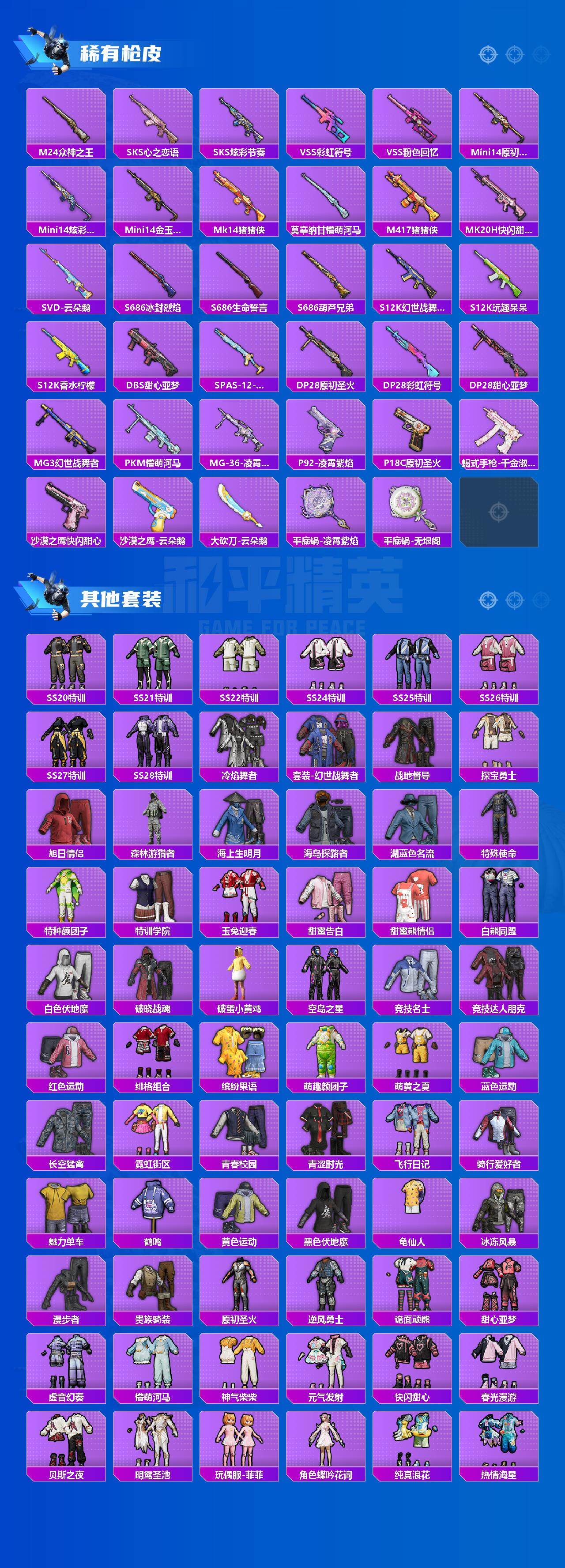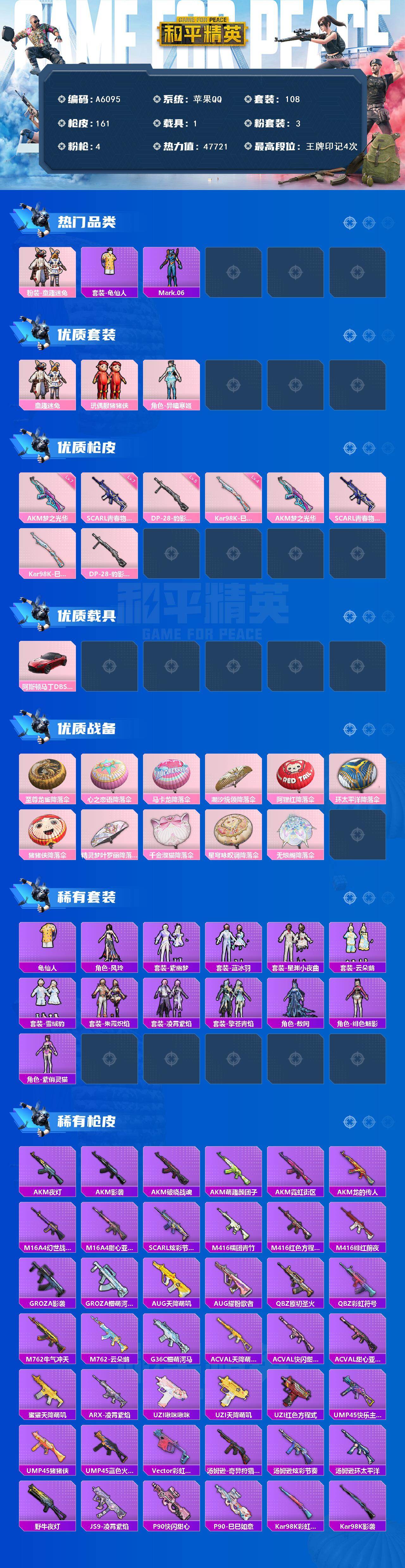[16664353]苹果 【男神号 童趣迷兔/mark.06/akm-梦之光华七级/scar-l-青春物语七级/阿斯顿马丁dbs(红)】手q-3粉装-4特效呛-1载具-1粉色飞行器-47721热力值-4王牌印记-108套装-161呛皮 【热门品类】:粉装-童趣迷兔,套装-龟仙人,角色-mark.06 【粉色套装】:粉装-童趣迷兔,玩偶服-猪猪侠,角色-异瞳寒姬 【粉色呛皮等级】:akm-梦之光华七级,scar-l-青春物语七级,kar98k-巳巳如意四级,dp-28-豹影疾电五级 【粉色载具】:阿斯顿马丁dbs(红) 【粉色呛皮】:akm-梦之光华,scar-l-青春物语,kar98k-巳巳如意,dp-28-豹影疾电 【粉色降落伞】:至尊龙雀降落伞,心之恋语降落伞,马卡龙降落伞,潮汐统领降落伞,阿狸红降落伞,环太平洋降落伞,猪猪侠降落伞,精灵梦叶罗丽降落伞,千金淑猫降落伞,星穹咏叹调降落伞,无垠阁降落伞,炫彩糖果降落伞 【稀有套装】:套装-龟仙人,套装-雪国风尚,套装-炫彩糖果,角色-风玲,套装-紫幽梦,套装-蓝冰羽,套装-星渊小夜曲,套装-云朵鹅,套装-雪绒豹,套装-朱霞炽焰,套装-凌霄紫焰,套装-擎苍青焰,角色-敖闰,角色-绯色魅影,角色-紫俏灵猫 【稀有呛皮】:akm-夜灯,akm-影袭,akm-破晓战魂,akm-萌趣颜团子,akm-霓虹街区,akm-龙的传人,m16a4-幻世战舞者,m16a4-甜心亚梦,scar-l-炫彩节奏,m416-糯团青竹,m416-红色方程式,m416-绯红前夜,groza-影袭,groza-懵萌河马,aug-天降萌叽,aug-耀粉歌者,q-原初圣火,q-彩虹符号,m762-牛气冲天,m762-云朵鹅,g36c-懵萌河马,ac-val-天降萌叽,ac-val-快闪甜心,ac-val-甜心亚梦,蜜獾-天降萌叽,arx-凌霄紫焰,uzi-啾咪啾咪,uzi-天降萌叽,uzi-红色方程式,ump45-快乐主宰,ump45-猪猪侠,ump45-蓝色火焰,vect-彩虹符号,汤姆逊-奇异狩猎者,汤姆逊-炫彩节奏,汤姆逊-环太平洋,野牛-夜灯,js9-凌霄紫焰,p90-快闪甜心,p90-巳巳如意,kar98k-彩虹符号,kar98k-影袭,m24-众神之王,sks-心之恋语,sks-炫彩节奏,vss-彩虹符号,vss-粉色回忆,