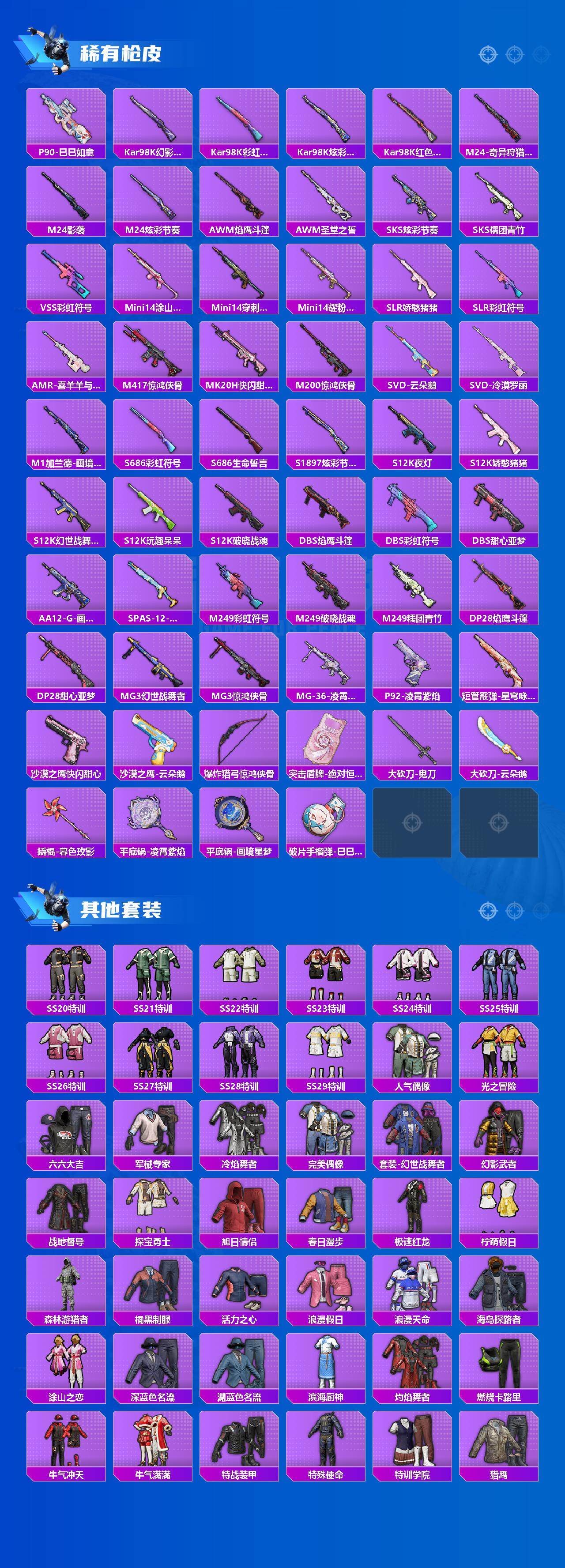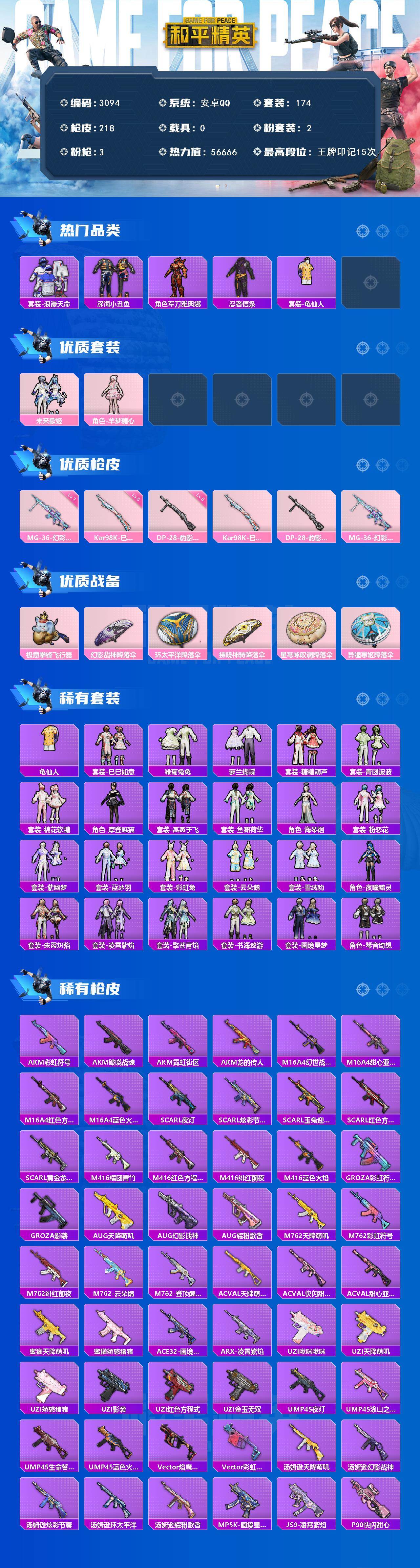 安卓 手q-2粉装-3特效呛-0载具-2粉色飞行器-56666热力值-15王牌印记-174套装-218呛皮 【热门品类】:套装-浪漫天命,套装-深海小丑鱼,角色-军刀雅典娜,套装-忍者信条,套装-龟仙人 【粉色套装】:粉装-未来歌姬,角色-羊梦糖心 【粉色呛皮等级】:kar98k-巳巳如意五级,dp-28-豹影疾电五级,mg-36-幻彩电音七级 【粉色呛皮】:kar98k-巳巳如意,dp-28-豹影疾电,mg-36-幻彩电音 【粉色飞行器】:极意拳锋飞行器 【粉色降落伞】:幻影战神降落伞,环太平洋降落伞,拂晓神骑降落伞,星穹咏叹调降落伞,异瞳寒姬降落伞,炫彩糖果降落伞 【稀有套装】:套装-龟仙人,套装-巳巳如意,套装-雪国风尚,套装-炫彩糖果,套装-雏菊兔兔,套装-萝兰蝴蝶,套装-糖糖葫芦,套装-青团波波,套装-棉花软糖,角色-摩登魅猫,套装-燕燕于飞,套装-鱼渊荷华,角色-海琴烟,套装-粉恋花,套装-紫幽梦,套装-蓝冰羽,套装-彩虹兔,套装-云朵鹅,套装-雪绒豹,角色-夜瞳黯灵,套装-朱霞炽焰,套装-凌霄紫焰,套装-擎苍青焰,套装-书海巡游,套装-画境星梦,套装-琴音绮想 【稀有呛皮】:aug-冰晶雪宝,akm-彩虹符号,akm-破晓战魂,akm-霓虹街区,akm-龙的传人,m16a4-幻世战舞者,m16a4-甜心亚梦,m16a4-红色方程式,m16a4-蓝色火焰,scar-l-夜灯,scar-l-炫彩节奏,scar-l-玉兔迎春,scar-l-红色方程式,scar-l-黄金龙骨,m416-糯团青竹,m416-红色方程式,m416-绯红前夜,m416-蓝色火焰,groza-彩虹符号,groza-影袭,aug-天降萌叽,aug-幻影战神,aug-耀粉歌者,m762-天降萌叽,m762-彩虹符号,m762-绯红前夜,m762-云朵鹅,m762-登顶巅峰,ac-val-天降萌叽,ac-val-快闪甜心,ac-val-甜心亚梦,蜜獾-天降萌叽,蜜獾-娇憨猪猪,ace32-画境星梦,arx-凌霄紫焰,uzi-啾咪啾咪,uzi-天降萌叽,uzi-娇憨猪猪,uzi-影袭,uzi-红色方程式,uzi-金玉无双,ump45-夜灯,ump45-涂山之恋,ump45-生命誓言,ump45-蓝色火焰,vect-焰鹰斗篷,vect-彩虹符号,汤姆逊-天降萌叽,汤姆逊-幻影战神,汤姆逊-炫彩节奏,汤姆逊-环太平洋,汤姆逊-耀粉歌者,mp5k-画境星梦,js9-凌霄紫焰,p90-快闪甜心,p90-巳巳如意,kar98k-幻影战神,kar98k-彩虹符号,kar98k-炫彩节奏,kar98k-红色方程式,m24-影袭,m24-炫彩节奏,m24-奇异狩猎者,awm-焰鹰斗篷,awm-圣堂之誓,sks-炫彩节奏,sks-糯团青竹,vss-彩虹符号,mini14-涂山之恋,mini14-穿刺龙虾,mini14-耀粉歌者,slr-娇憨猪猪,slr-彩虹符号,amr-喜羊羊与灰太狼,m417-惊鸿侠骨,mk20-h-快闪甜心,m200-惊鸿侠骨,svd-云朵鹅,svd-冷漠罗丽,m1加兰德-画境星梦,s686-彩虹符号,s686-生命誓言,s1897-炫彩节奏,s12k-玩趣呆呆,s12k-破晓战魂,s12k-夜灯,s12k-娇憨猪猪,s12k-幻世战舞者,dbs-焰鹰斗篷,dbs-彩虹符号,dbs-甜心亚梦,aa12-g-画境星梦,spas-12-云朵鹅,m249-彩虹符号,m249-破晓战魂,m249-糯团青竹,dp-28-焰鹰斗篷,dp-28-甜心亚梦,mg3-幻世战舞者,mg3-惊鸿侠骨,mg-36-凌霄紫焰,p92-凌霄紫焰,短管霰弹-星穹咏叹调,沙墨之鹦-快闪甜心,沙墨之鹦-云朵鹅,爆炸猎弓-惊鸿侠骨,突击盾牌-绝对恒星,大砍刀-云朵鹅,大砍刀-鬼刀,撬棍-暮色玫影,平底锅-凌霄紫焰,平底锅-画境星梦,破片手留单-巳巳如意 【其他套装】:套装-ss20特训,套装-ss21特训,套装-ss22特训,套装-ss23特训,套装-ss24特训,套装-ss25特训,套装-ss26特训,套装-ss27特训,套装-ss28特训,套装-ss29特训,套装-人气偶像,套装-光之冒险,套装-六六大吉,套装-军械专家,套装-冷焰舞者,套装-完美偶像,套装-幻世战舞者,套装-幻影武者,套装-战地督导,套装-探宝勇士,套装-旭日情侣,套装-春日漫步,套装-极速红龙,套装-柠萌假日,套装-森林游猎者,套装-橘黑制服,套装-活力之心,套装-浪漫假日,套装-浪漫天命,套装-海岛探路者,套装-涂山之恋,套装-深蓝色名流,套装-湖蓝色名流,套装-滨海厨神,套装-灼焰舞者,套装-燃烧卡路里,套装-牛气冲天,套装-牛气满满,套装-特战装甲,套装-特殊使命,套装-特训学院,套装-猎鹰,套装-猛禽,套装-玉兔迎春,套装-王牌教练,套装-白色伏地魔,套装-破晓战魂,套装-破蛋小黄鸡,套装-空岛之星,套装-竞技名士,套装-竞技达人朋克,套装-红色运动,套装-绮丽涂鸦,套装-绯格组合,套装-缤纷果语,套装-耀粉歌者,套装-荣耀,套装-萌黄之夏,套装-蓝彩潮人,套装-蓝色运动,套装-街头潮人,套装-超能勇士,套装-都市魅力,套装-酒红色名流,套装-野性战心,套装-长空猛禽,套装-雨林探路者,套装-霓虹街区,套装-青年教官,套装-青涩时光,套装-青玉碎影,套装-飞行日记,套装-魅力单车,套装-鹤鸣,套装-麻辣教官,套装-黄色伏地魔,套装-黄色名流,套装-黄色运动,套装-黑色伏地魔,套装-龙的传人,套装-龙腾端午,套装-龟仙人,套装-特战英豪,套装-鹰眼刺客,套装-冰冻风暴,套装-漫步者,套装-冷酷挑战者,套装-极地朋克,套装-清新柠檬,套装-深海小丑鱼,套装-呆萌铁蟹,套装-迅捷狂鲨,套装-弄潮海豚,套装-冰川特警,套装-坚韧舞者,套装-核芯基因,套装-黑色刀锋,套装-猎梦纪元,套装-甜心亚梦,套装-虚音幻奏,套装-竞技角斗士,套装-娇憨猪猪,套装-萌趣咩咩,套装-惊鸿侠骨,套装-锦衣飞扬,套装-快闪甜心,套装-春光漫游,套装-贝斯之夜,套装-焰鹰斗篷,套装-幻羽潜行,角色-银尘,套装-纯真浪花,套装-热情海星,套装-曼妙人鱼 【稀有头盔】:幻影战神头盔3级,深海小丑鱼头盔3级 【稀有背包】:幻影战神背包3级,幻影战神背包1级 【
