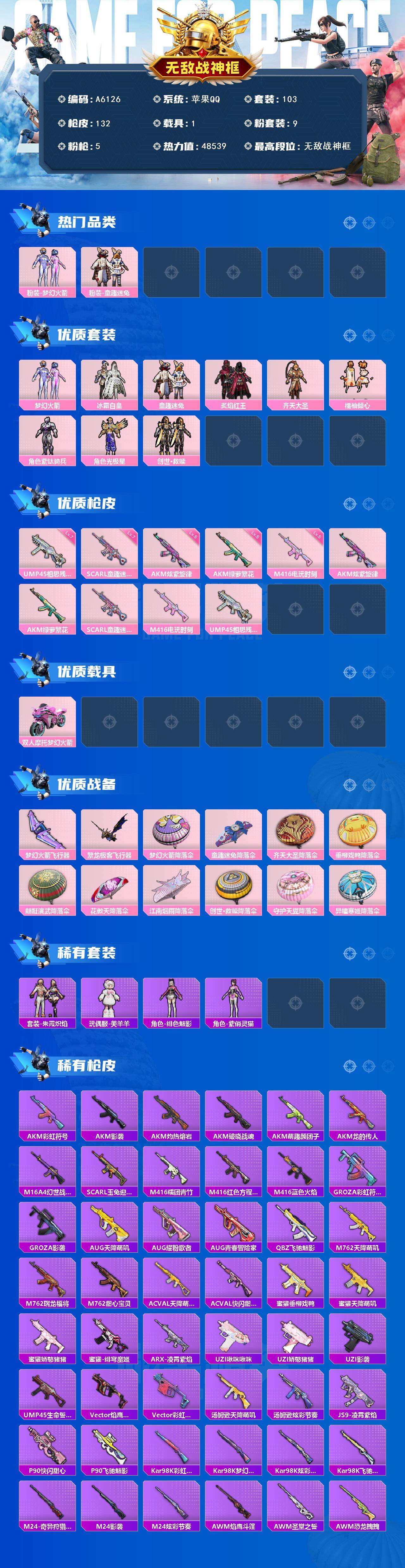 [16664892]苹果 【公主号 梦幻火箭/童趣迷兔/m416-电玩时刻五级/scar-l-童趣迷兔七级/双人摩托-梦幻火箭】手q-无敌战神框-9粉装-5特效呛-1载具-3粉色飞行器-48539热力值-8王牌印记-103套装-132呛皮 【热门品类】:粉装-梦幻火箭,粉装-童趣迷兔 【粉色套装】:粉装-梦幻火箭,粉装-冰霜白皇,粉装-童趣迷兔,粉装-炙焰红王,粉装-齐天大圣,粉装-橘柚倾心,角色-紫钛骑兵,角色-光极星,套装-创世·救赎 【粉色呛皮等级】:akm-炫紫旋律五级,akm-绿萝繁花五级,scar-l-童趣迷兔七级,m416-电玩时刻五级,ump45-相思残雪七级 【粉色载具】:双人摩托-梦幻火箭 【粉色呛皮】:akm-炫紫旋律,akm-绿萝繁花,scar-l-童趣迷兔,m416-电玩时刻,ump45-相思残雪 【粉色飞行器】:梦幻火箭飞行器,繁龙极客飞行器 【粉色降落伞】:梦幻火箭降落伞,童趣迷兔降落伞,齐天大圣降落伞,垂柳戏鸭降落伞,翩跹演武降落伞,花傲天降落伞,江南烟雨降落伞,创世·救赎降落伞,守护天翼降落伞,异瞳寒姬降落伞,炫彩糖果降落伞 【稀有套装】:套装-炫彩糖果,套装-朱霞炽焰,玩偶服-美羊羊,角色-绯色魅影,角色-紫俏灵猫 【稀有呛皮】:akm-彩虹符号,akm-影袭,akm-灼热熔岩,akm-破晓战魂,akm-萌趣颜团子,akm-龙的传人,m16a4-幻世战舞者,scar-l-玉兔迎春,m416-糯团青竹,m416-红色方程式,m416-蓝色火焰,groza-彩虹符号,groza-影袭,aug-天降萌叽,aug-耀粉歌者,aug-青春冒险家,q-飞驰魅影,m762-天降萌叽,m762-瑞龙福将,m762-甜心宝贝,ac-val-天降萌叽,ac-val-快闪甜心,蜜獾-垂柳戏鸭,蜜獾-天降萌叽,蜜獾-娇憨猪猪,蜜獾-绯穹魔姬,arx-凌霄紫焰,uzi-啾咪啾咪,uzi-娇憨猪猪,uzi-影袭,ump45-生命誓言,vect-焰鹰斗篷,vect-彩虹符号,汤姆逊-天降萌叽,汤姆逊-炫彩节奏,js9-凌霄紫焰,p90-快闪甜心,p90-飞驰魅影,kar98k-彩虹符号,kar98k-梦幻火箭,kar98k-炫彩节奏,kar98k-飞驰魅影,m24-影袭,m24-炫彩节奏,m24-奇异狩猎者,awm-焰鹰斗篷,awm-圣堂