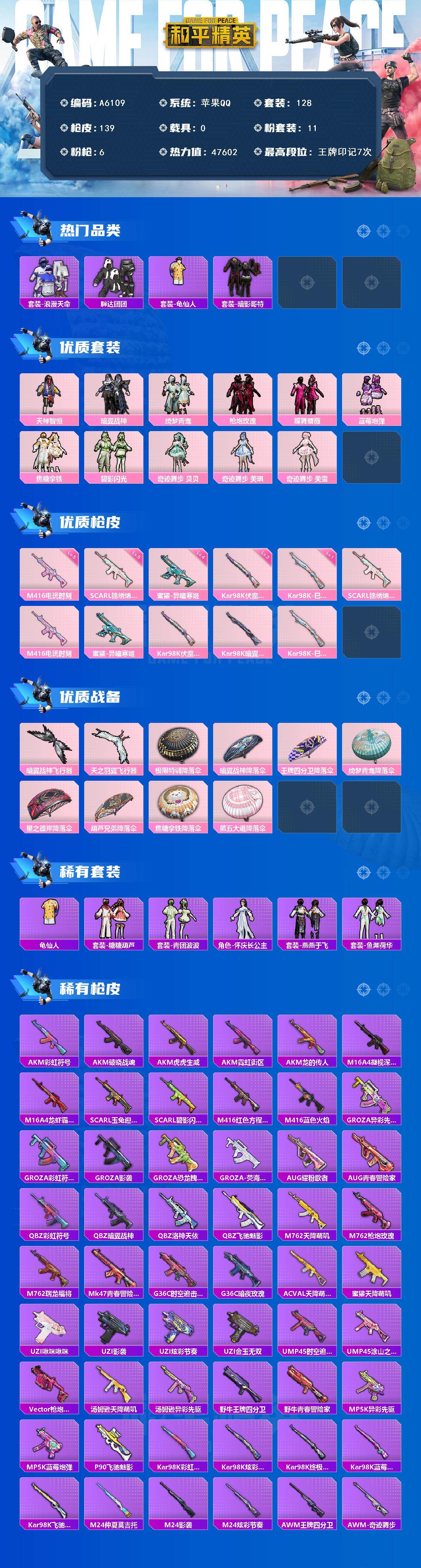[16665687]苹果 【男神号 浪漫天命/暗影哥特/龟仙人/胖达团团/scar-l-锦绣绵绵五级/m416-电玩时刻五级】手q-11粉装-6特效呛-0载具-3粉色飞行器-47602热力值-7王牌印记-128套装-139呛皮 【热门品类】:套装-浪漫天命,套装-胖达团团,套装-龟仙人,套装-暗影哥特 【粉色套装】:粉装-天禅智恒,粉装-暗翼战神,粉装-绮梦青鸾,粉装-呛炮玫瑰,粉装-蝶舞蔷薇,粉装-蓝莓炮弹,粉装-焦糖拿铁,粉装-碧影闪光,角色-奇迹舞步 贝贝,角色-奇迹舞步 美琪,角色-奇迹舞步 美雪 【粉色呛皮等级】:scar-l-锦绣绵绵五级,m416-电玩时刻五级,蜜獾-异瞳寒姬四级,kar98k-伏魔团三级,kar98k-巳巳如意一级 【粉色呛皮】:scar-l-锦绣绵绵,m416-电玩时刻,蜜獾-异瞳寒姬,kar98k-伏魔团,kar98k-暗翼战神,kar98k-巳巳如意 【粉色飞行器】:暗翼战神飞行器,天之羽翼飞行器 【粉色降落伞】:极限特训降落伞,暗翼战神降落伞,王牌四分卫降落伞,绮梦青鸾降落伞,星之彼岸降落伞,葫芦兄弟降落伞,焦糖拿铁降落伞,第五大道降落伞,炫彩糖果降落伞 【稀有套装】:套装-龟仙人,套装-雪国风尚,套装-炫彩糖果,套装-糖糖葫芦,套装-青团波波,角色-怀庆长公主,套装-燕燕于飞,套装-鱼渊荷华 【稀有呛皮】:akm-彩虹符号,akm-破晓战魂,akm-虎虎生威,akm-霓虹街区,akm-龙的传人,m16a4-凝视深渊,m16a4-龙虾霸霸,scar-l-玉兔迎春,scar-l-碧影闪光,m416-红色方程式,m416-蓝色火焰,groza-异彩先驱,groza-彩虹符号,groza-影袭,groza-恐龙拽拽,groza-荧海星豚,aug-耀粉歌者,aug-青春冒险家,q-彩虹符号,q-暗翼战神,q-洛神天依,q-飞驰魅影,m762-天降萌叽,m762-呛炮玫瑰,m762-瑞龙福将,mk47-青春冒险家,g36c-时空追击者,g36c-暗夜玫瑰,ac-val-天降萌叽,蜜獾-天降萌叽,uzi-啾咪啾咪,uzi-影袭,uzi-炫彩节奏,uzi-金玉无双,ump45-时空追击者,ump45-涂山之恋,vect-呛炮玫瑰,汤姆逊-天降萌叽,汤姆逊-异彩先驱,野牛-王牌四分卫,野牛-青春冒险家,mp5k-