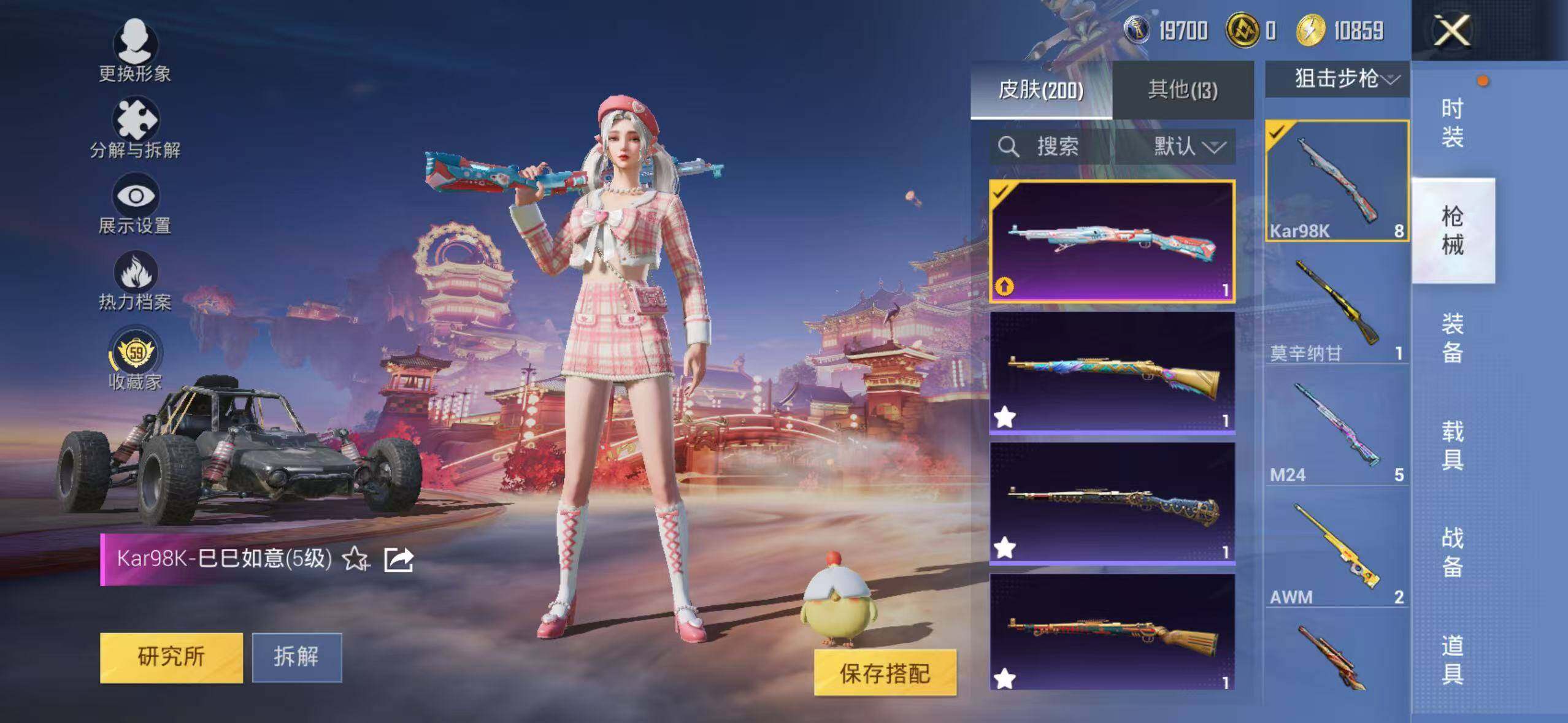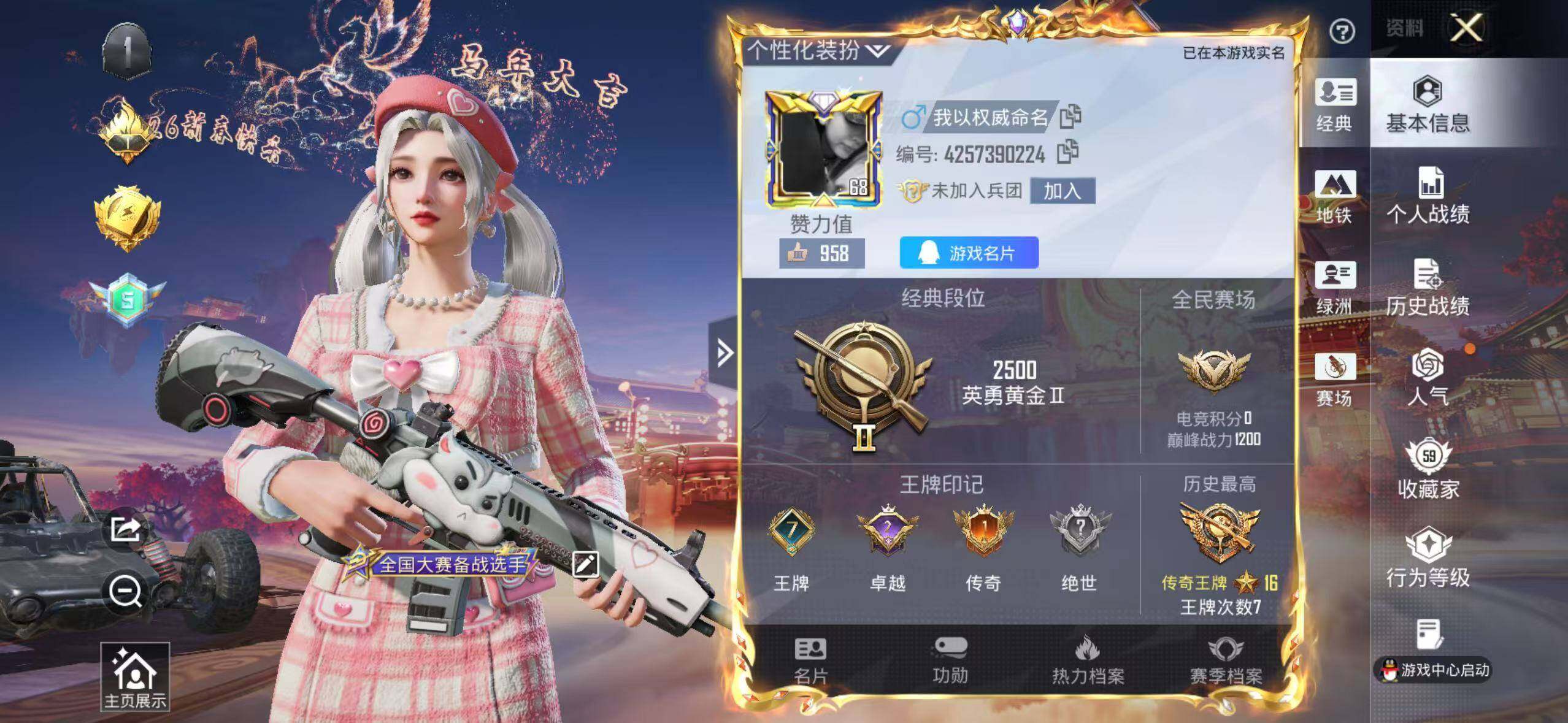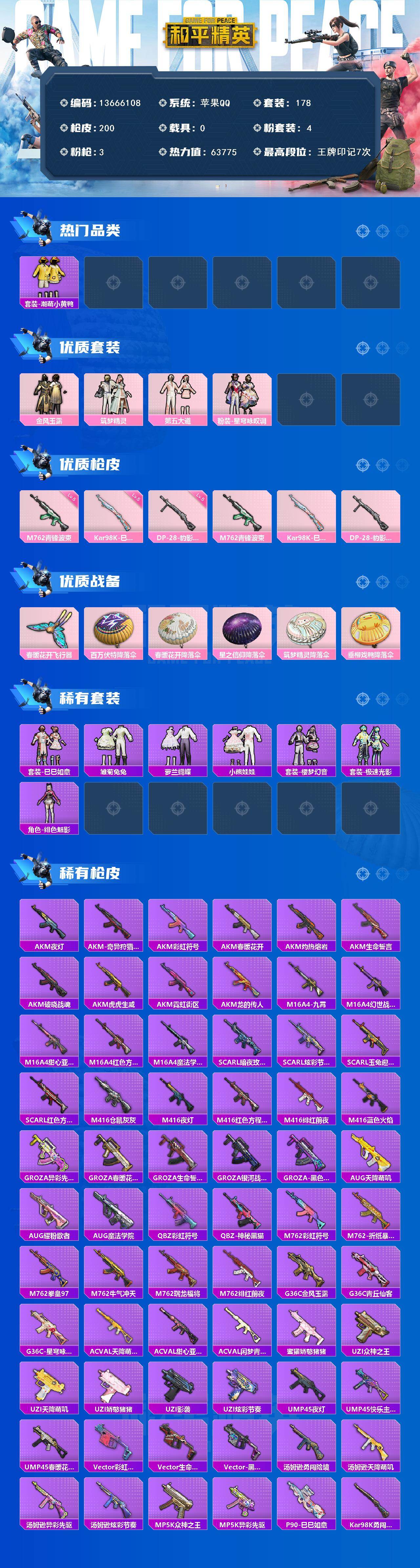 6519【雪山精英4粉装3特效呛1粉色飞行器63775热力值7王牌印记178套装200呛皮】 【热门品类】:套装-潮萌小黄鸭 【粉色套装】:粉装-金风玉露,粉装-筑梦精灵,粉装-第五大道,粉装-星穹咏叹调 【粉色呛皮等级】:m762-青锋波束五级 【粉色呛皮】:m762-青锋波束,kar98k-巳巳如意,dp-28-豹影疾电 【粉色飞行器】:春暖花开飞行器 【粉色降落伞】:百万伏特降落