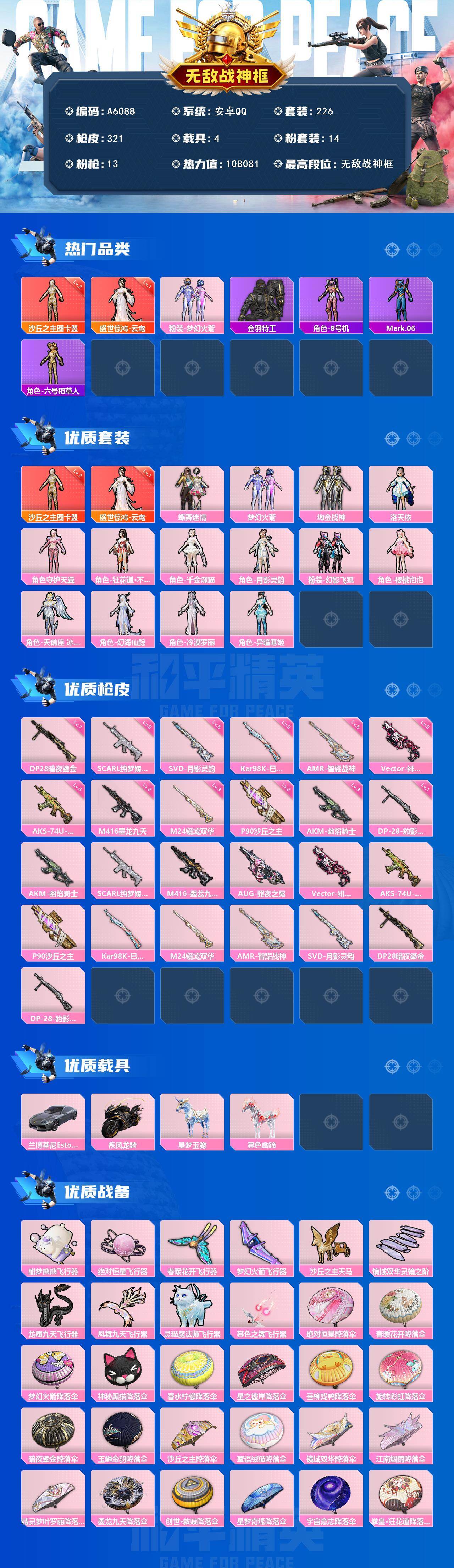 [16665969]安卓 【神装号 无敌战神框/沙丘之主-图卡盟二级/盛世惊鸿-云鸾一级/梦幻火箭/mark.06/m416-墨龙九天三级/p90-沙丘之主三级/兰博基尼estoque(银翼灰)】手q-无敌战神框-2神装-14粉装-13特效呛-4载具-12粉色飞行器-108081热力值-19王牌印记-226套装-321呛皮 【红色神装等级】:盛世惊鸿-云鸾一级,沙丘之主-图卡盟二级 【红色角色神装】:盛世惊鸿-云鸾,沙丘之主-图卡盟 【热门品类】:粉装-梦幻火箭,套装-金羽特工,角色-8号机,角色-mark.06,角色-六号稻草人 【粉色套装】:粉装-蝶舞迷情,粉装-梦幻火箭,粉装-绚金战神,角色-洛天依,角色-守护天翼,角色-狂花道·不知火舞,角色-千金淑猫,角色-月影灵韵,粉装-幻影飞狐,角色-樱桃泡泡,角色-天鹅座 冰河,角色-幻海仙踪,角色-冷漠罗丽,角色-异瞳寒姬 【粉色呛皮等级】:akm-幽焰骑士三级,scar-l-纯梦嫁纱五级,m416-墨龙九天三级,vect-绯穹魔姬五级,aks-74u-森灵之息五级,p90-沙丘之主三级,kar98k-巳巳如意五级,m24-镜域双华三级,amr-智耀战神五级,svd-月影灵韵五级,dp-28-暗夜鎏金七级,dp-28-豹影疾电一级 【粉色载具】:兰博基尼estoque(银翼灰),疾风龙骑,星梦玉骢,暮色幽蹄 【粉色呛皮】:akm-幽焰骑士,scar-l-纯梦嫁纱,m416-墨龙九天,aug-罪夜之冕,vect-绯穹魔姬,aks-74u-森灵之息,p90-沙丘之主,kar98k-巳巳如意,m24-镜域双华,amr-智耀战神,svd-月影灵韵,dp-28-暗夜鎏金,dp-28-豹影疾电 【粉色飞行器】:酣梦熊熊飞行器,绝对恒星飞行器,春暖花开飞行器,梦幻火箭飞行器,沙丘之主天马,镜域双华-灵镜之阶,龙翔九天飞行器,凤舞九天飞行器,灵猫魔法师飞行器,暮色之舞飞行器 【粉色降落伞】:绝对恒星降落伞,春暖花开降落伞,梦幻火箭降落伞,神秘黑猫降落伞,香水柠檬降落伞,星之彼岸降落伞,垂柳戏鸭降落伞,旋转彩虹降落伞,暗夜鎏金降落伞,玉鳞金羽降落伞,沙丘之主降落伞,蜜语绒猫降落伞,镜域双华降落伞,江南烟雨降落伞,精灵梦叶罗丽降落伞,墨龙九天降落伞,创世·救赎降落伞,星梦奇