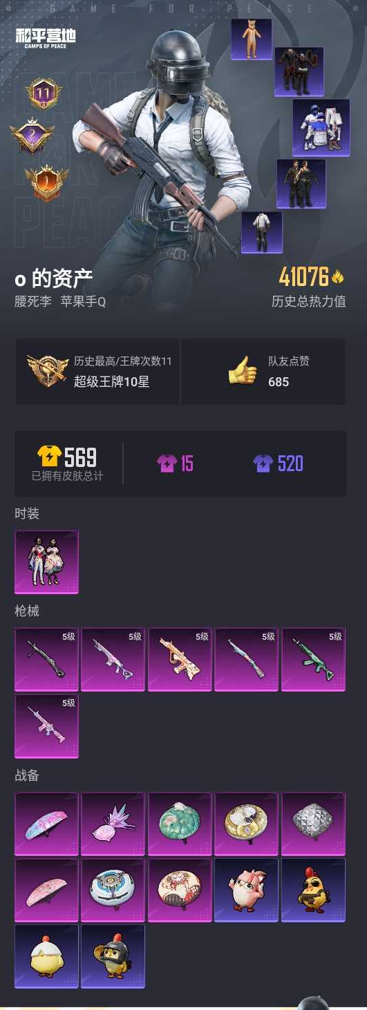 【和平精英】【lyhp20704】1粉装,6特效呛,0载具,历史最高段位:超级王牌10星 王牌印记11次 热力值:41076,107套装,161呛械,188装备,94战备;套装:套装-星穹咏叹调,套装-特训学院,套装-橘黑制服,套装-红色运动,套装-黄色运动,套装-蓝色运动,套装-黄色伏地魔,套装-白色伏地魔,套装-黑色伏地魔,套装-竞技名士,套装-湖蓝色名流,套装-黄色名流,套装-猛禽,套装-长空猛禽,套装-黎明保卫者,套装-海岛探路者,套装-浪漫天命,套装-特战装甲,套装-战地督导,套装-特殊使命,套装-春日漫步,套装-燃烧卡路里,套装-冰冻风暴,套装-人气偶像,套装-蓝彩潮人,套装-千禧之恋,套装-魅力单车,套装-绮丽涂鸦,套装-竞技达人朋克,套装-超能勇士,套装-森林游猎者,套装-暗影哥特,套装-夏日倾情,套装-青涩时光,套装-缤纷果语,套装-龙魂突击队,套装-元素星魂,套装-天网终结者,套装-萌神柯基,套装-破蛋小黄鸡,套装-疯狂小兔子,套装-鹤鸣,套装-霓虹街区,套装-白糯汤圆,套装-战术大师,套装-耀粉歌者,套装-竞技角斗士,套装-光之冒险,套装-王牌教练,套装-龟仙人,套装-冰河战士,套装-ss26特训,套装-漫游都市,套装-空岛之星,套装-焰鹰斗篷,套装-幽夜迷踪,套装-幻羽潜行,套装-ss27特训,套装-恋语绒绒,套装-老实芭蕉,套装-ss28特训,角色-白光莹,套装-街头风暴,套装-海盐绵绵冰,套装-蝶变,套装-小熊娃娃,套装-ss29特训,套装-雏菊兔兔,套装-萝兰蝴蝶,套装-火种守卫者,套装-异域银装,套装-星途旅人,角色-怀庆长公主,套装-ss30特训,套装-青团波波,角色-光矢逐梦,角色-夜瞳黯灵,套装-糖糖葫芦,套装-梦域神使,套装-小鸟芋圆,套装-ss31特训,套装-鱼渊荷华,套装-燕燕于飞,套装-智谋强哥,套装-紫幽梦,套装-粉恋花,套装-ss33特训,套装-云朵鹅,套装-巳巳如意,套装-ss32特训,套装-青翼流星,套装-蓝冰羽,套装-顶瓜瓜,套装-雪绒豹,套装-狂鲨锋刃,套装-大橘大利,套装-星渊小夜曲,套装-炫彩糖果,套装-元气之梦,套装-ss34特训,套装-朱霞炽焰,套装-凌霄紫焰,套装-薄荷星砂,套装-ss35特训,套装-ss36特训,套装-雪国风尚,套装-萌鸡速递;呛皮:scar-l-红色方程式,scar-l-星途旅人,scar-l-海盐豹豹,蜜獾-天降萌叽,蜜獾-糖糖葫芦,蜜獾-鸡智如我,蜜獾-绿洲时空,蜜獾-乌木金纹,5级aug-暖羊咩咩,aug-终结者,aug-耀粉歌者,aug-异域银装,aug-冰晶雪宝,aug-紫晶流影,akm-影袭,akm-破晓战魂,akm-霓虹街区,akm-涂鸦街区,akm-棋盘冕主,akm-霓彩脉冲,akm-绿洲时空,5级m416-电玩时刻,m416-蓝色火焰,m416-红色方程式,m416-糯团青竹,m416-极冰使者,ace32-冰晶雪宝,arx-凌霄紫焰,groza-影袭,groza-暴走疾风,famas-突变脉冲,famas-霓彩脉冲,famas-乌木金纹,m16a4-蓝色火焰,m16a4-红色方程式,m16a4-冰河战士,5级m762-青锋波束,m762-天降萌叽,m762-雏菊兔兔,m762-云朵鹅,ac-val-六号稻草人,q-彩虹符号,5级kar98k-巳巳如意,kar98k-彩虹符号,kar98k-顶峰精英,svd-云朵鹅,m200-乌木金纹,awm-黄金龙骨,awm-天降萌叽,awm-焰鹰斗篷,win94-乌木金纹,amr-鸡智如我,amr-乌木金纹,5级mk14-甜梦熊击,mk14-冰河战士,mk14-紫幽梦,mk14-薄荷星砂,mk14-紫晶流影,mk12-乌木金纹,mini14-耀粉歌者,mini14-香桃花海,mini14-雏菊兔兔,mini14-绯穹魔姬,mini14-鸡智如我,vss-星之彼岸,vss-香桃花海,mk20-h-星途旅人,mk20-h-糖糖葫芦,mk20-h-狂鲨锋刃,mk20-h-乌木金纹,sks-炫彩节奏,sks-bearbrick,uzi-红色方程式,uzi-幻影战神,uzi-冰河战士,uzi-啾咪啾咪,uzi-炫彩糖果,uzi-绿洲时空,aks-74u-辉羽雀灵,aks-74u-乌木金纹,ump45-夜灯,ump45-蓝色火焰,ump45-海盐豹豹,ump45-糖糖葫芦,ump45-极意拳锋,ump45-绿洲时空,汤姆逊-幻影战神,汤姆逊-耀粉歌者,汤姆逊-天降萌叽,汤姆逊-幻星舰长,vect-焰鹰斗篷,vect-燕燕于飞,野牛-雏菊兔兔,野牛-燕燕于飞,js9-凌霄紫焰,p90-巳巳如意,mp5k-乌木金纹,s686-红色方程式,s686-生命誓言,s686-终结者,s686-千金淑猫,s686-雪月幻音,s686-巳巳如意,s1897-紫幽梦,s1897-糯团青竹,dbs-彩虹符号,dbs-焰鹰斗篷,dbs-幻彩电音,dbs-乌木金纹,s12k-幻影战神,s12k-霓彩脉冲,spas-12-燕燕于飞,spas-12-狂鲨锋刃,spas-12-云朵鹅,spas-12-罪夜之冕,spas-12-乌木金纹,mg3-智耀战神,mg3-霓彩脉冲,mg-36-凌霄紫焰,mg-36-薄荷星砂,pkm-紫幽梦,5级dp-28-豹影疾电,dp-28-彩虹符号,dp-28-焰鹰斗篷,m249-破晓战魂,m249-无面战甲,tmp-9-江南烟雨,r1895-雏菊兔兔,沙墨之鹦-未来领航者,沙墨之鹦-圣穹绘梦,沙墨之鹦-云朵鹅,p92-紫幽梦,p92-凌霄紫焰,信号呛-异瞳寒姬,蝎式手呛-燕燕于飞,p18c-糖糖葫芦,大砍刀-云朵鹅,平底锅-终结者,平底锅-空岛之星,平底锅-焰鹰斗篷,平底锅-雏菊兔兔,平底锅-糖糖葫芦,平底锅-许七安,平底锅-紫幽梦,平底锅-属我最6,平底锅-凌霄紫焰,撬棍-戏水时光,撬棍-信仰神谕,撬棍-冰晶雪宝,破片手留单-呆爆全场,破片手留单-星途旅人,破片手留单-海盐豹豹,破片手留单-拽到爆炸,破片手留单-巳巳如意,爆炸猎弓-喜羊羊与灰太狼,燃烧瓶-甜梦桃焰,铝热弹-炫彩糖果,十子怒-异瞳寒姬,十子怒-燕燕于飞,十子怒-异域银装,盐雾蛋-冰氧夏日;降落伞:炫彩糖果飞行器,空岛之星尾迹,异域银装飞行器,顶峰精英尾迹,狂鲨锋刃飞行器,鸡智如我飞行器; 详情看图地铁满天赋 附赠1钻璀璨苏尔南手呛 1粉6特效呛 天网终结者 天命哥特 多满级呛型