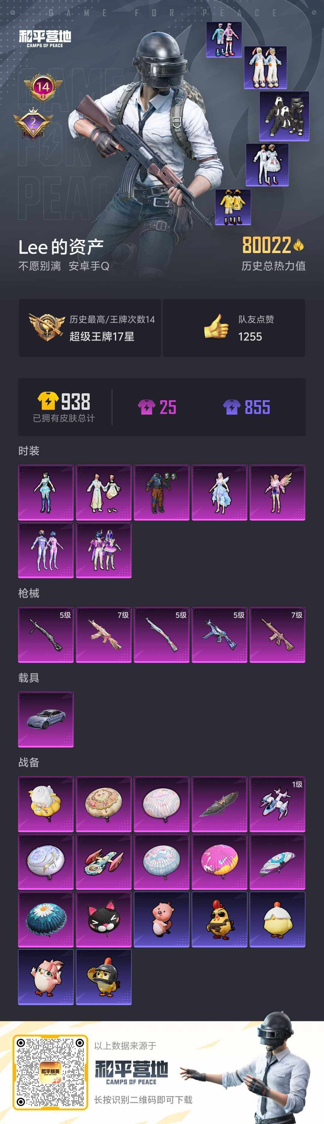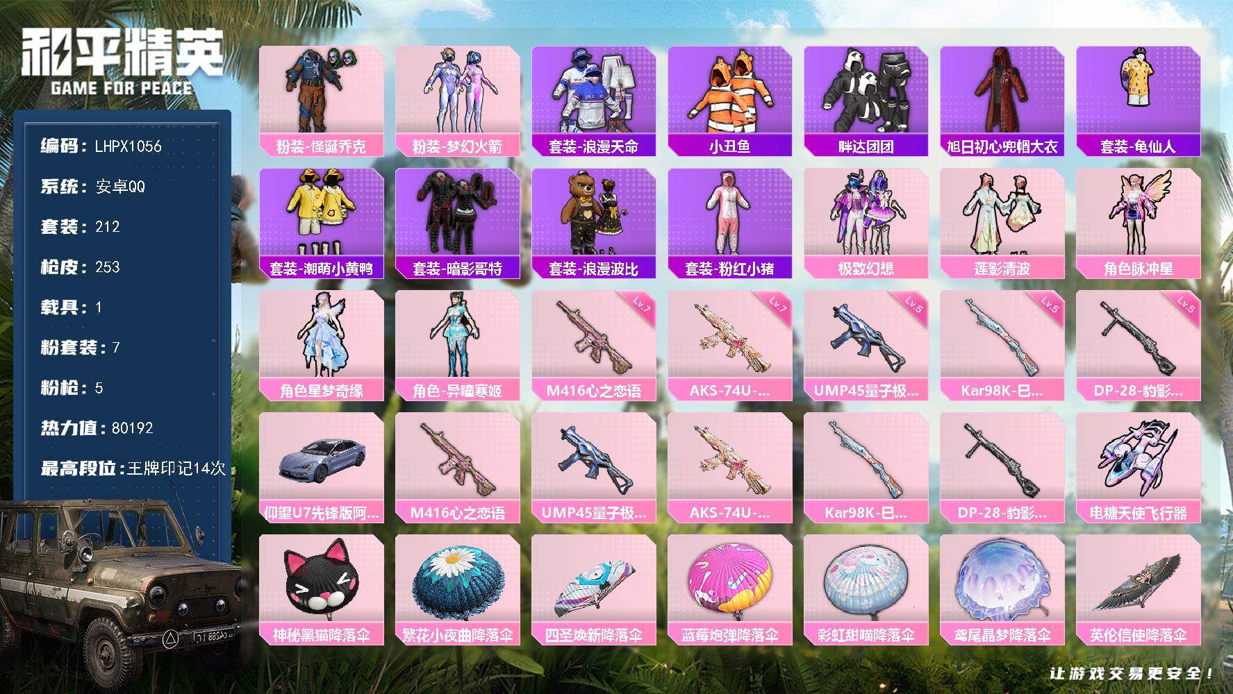 [16667839]自带点卷1000 活跃礼包里面没有领取【特价出售/店主推荐】安卓 手q-7粉装-5特效呛-1载具-2粉色飞行器-80192热力值-14王牌印记-212套装-253呛皮【热门品类】:粉装-怪诞乔克,粉装-梦幻火箭,套装-浪漫天命,套装-小丑鱼,套装-胖达团团,旭日初心兜帽大衣,套装-龟仙人,套装-潮萌小黄鸭,套装-暗影哥特,套装-浪漫波比套装-粉红小猪【粉色套装】:粉装-怪诞乔克,粉装-梦幻火箭,粉装-极致幻想,粉装-莲影清波,角色-脉冲星,角色-星梦奇缘,角色-异瞳寒姬【粉色呛皮等级】:m416-心之恋语七级,ump45-量子极限五级,aks-74u-星穹咏叹调七级,kar98k-巳巳如意五级,dp-28-豹影疾电五级【粉色载具】:仰望u7(阿盖尔紫)【粉色呛皮】:m416-心之恋语,ump45-量子极限,aks-74u-星穹咏叹调,kar98k-巳巳如意,dp-28-豹影疾电【粉色飞行器】:电糖天使飞行器