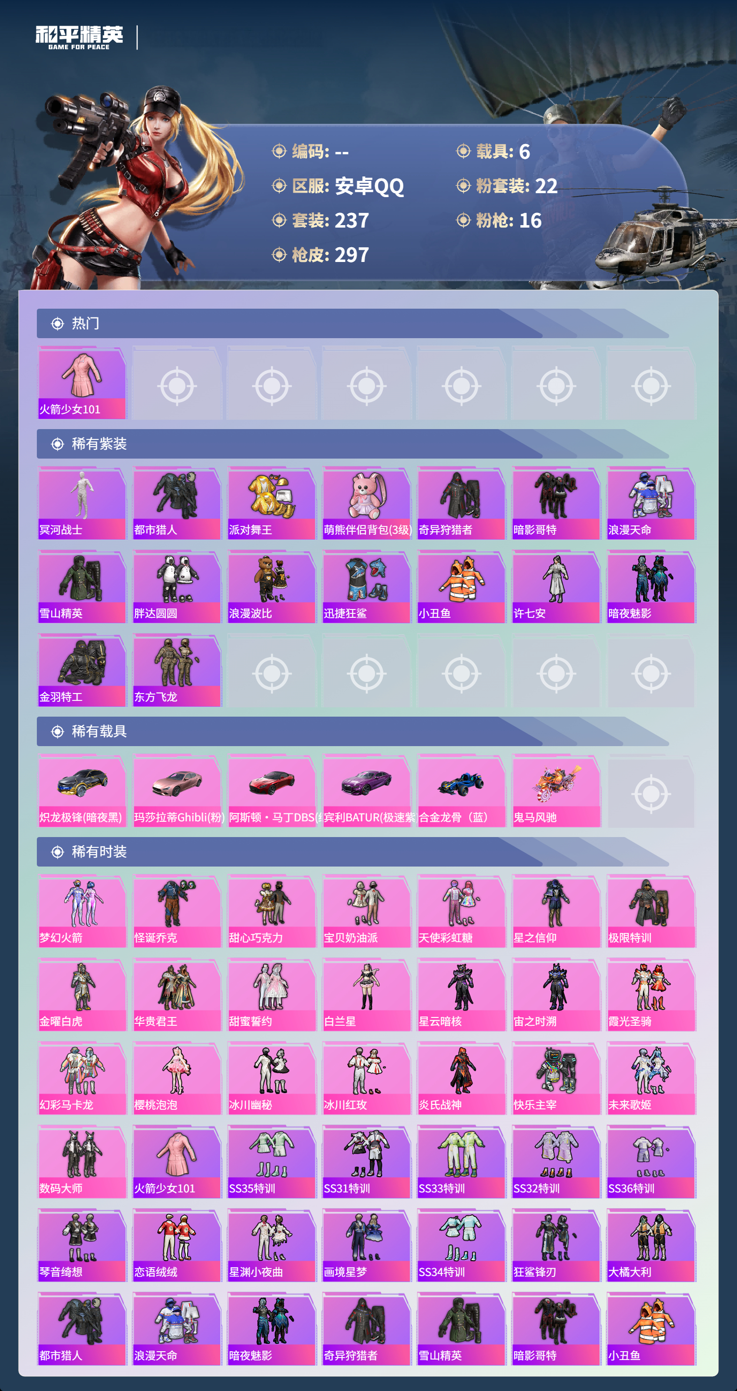 hs60641安卓手q-21王牌印记-有战神框-22粉装-16特效呛-6载具-热力值-237套装-297呛皮-4卓越印记-1传奇印记【22粉装】套装-炎氏战神角色-星云暗核套装-金曜白虎角色-白兰星套装-梦幻火箭套装-冰川红玫套装-快乐主宰套装-未来歌姬角色-宙之时溯套装-霞光圣骑套装-天使彩虹糖套装-星之信仰套装-数码大师套装-极限特训套装-幻彩马卡龙