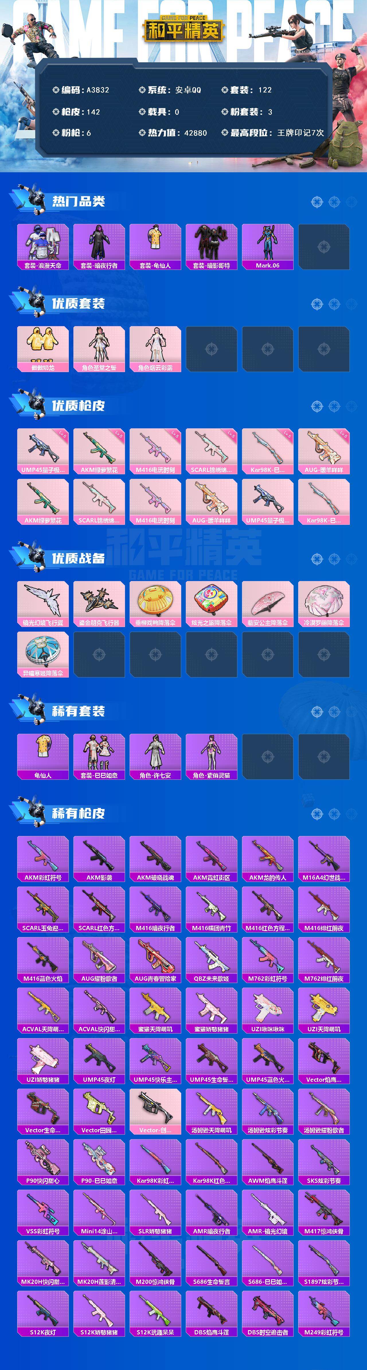 [16670651]安卓【小号 套装-暗影哥特/角色-mark.06/aug-暖羊咩咩五级/ump45-量子极限五级/scar-l-锦绣绵绵五级/kar98k-巳巳如意五级】 手q-3粉装-6特效呛-0载具-3粉色飞行器-42880热力值-7王牌印记-122套装-142呛皮 【热门品类】:套装-浪漫天命,套装-暗夜行者,套装-龟仙人,套装-暗影哥特,角色-mark.06 【粉色套装】:粉装-傲傲奶龙,角色-圣堂之誓,角色-烟云彩露 【粉色呛皮等级】:akm-绿萝繁花五级,scar-l-锦绣绵绵五级,m416-电玩时刻五级,aug-暖羊咩咩五级,ump45-量子极限五级,kar98k-巳巳如意五级 【粉色呛皮】:akm-绿萝繁花,scar-l-锦绣绵绵,m416-电玩时刻,aug-暖羊咩咩,ump45-量子极限,kar98k-巳巳如意 【粉色飞行器】:镜光幻境飞行翼,鎏金朋克飞行器 【粉色降落伞】:垂柳戏鸭降落伞,炫光之旅降落伞,临安公主降落伞,冷漠罗丽降落伞,异瞳寒姬降落伞,炫彩糖果降落伞 【稀有套装】:套装-龟仙人,套装-巳巳如意,套装-雪国风尚,角色-许七安,角色-紫俏灵猫,套装-炫彩糖果 【稀有呛皮】:aug-冰晶雪宝,akm-彩虹符号,akm-影袭,akm-破晓战魂,akm-霓虹街区,akm-龙的传人,m16a4-幻世战舞者,scar-l-玉兔迎春,scar-l-红色方程式,m416-暗夜行者,m416-糯团青竹,m416-红色方程式,m416-绯红前夜,m416-蓝色火焰,aug-耀粉歌者,aug-青春冒险家,q-未来歌姬,m762-彩虹符号,m762-绯红前夜,ac-val-天降萌叽,ac-val-快闪甜心,蜜獾-天降萌叽,蜜獾-娇憨猪猪,uzi-啾咪啾咪,uzi-天降萌叽,uzi-娇憨猪猪,ump45-夜灯,ump45-快乐主宰,ump45-生命誓言,ump45-蓝色火焰,vect-焰鹰斗篷,vect-生命誓言,vect-田园牧歌,vect-创世·救赎,汤姆逊-天降萌叽,汤姆逊-炫彩节奏,汤姆逊-耀粉歌者,p90-快闪甜心,p90-巳巳如意,kar98k-彩虹符号,kar98k-红色方程式,awm-焰鹰斗篷,sks-炫彩节奏,vss-彩虹符号,mini14-涂山之恋,slr-娇憨猪猪,amr-暗夜行者,amr-