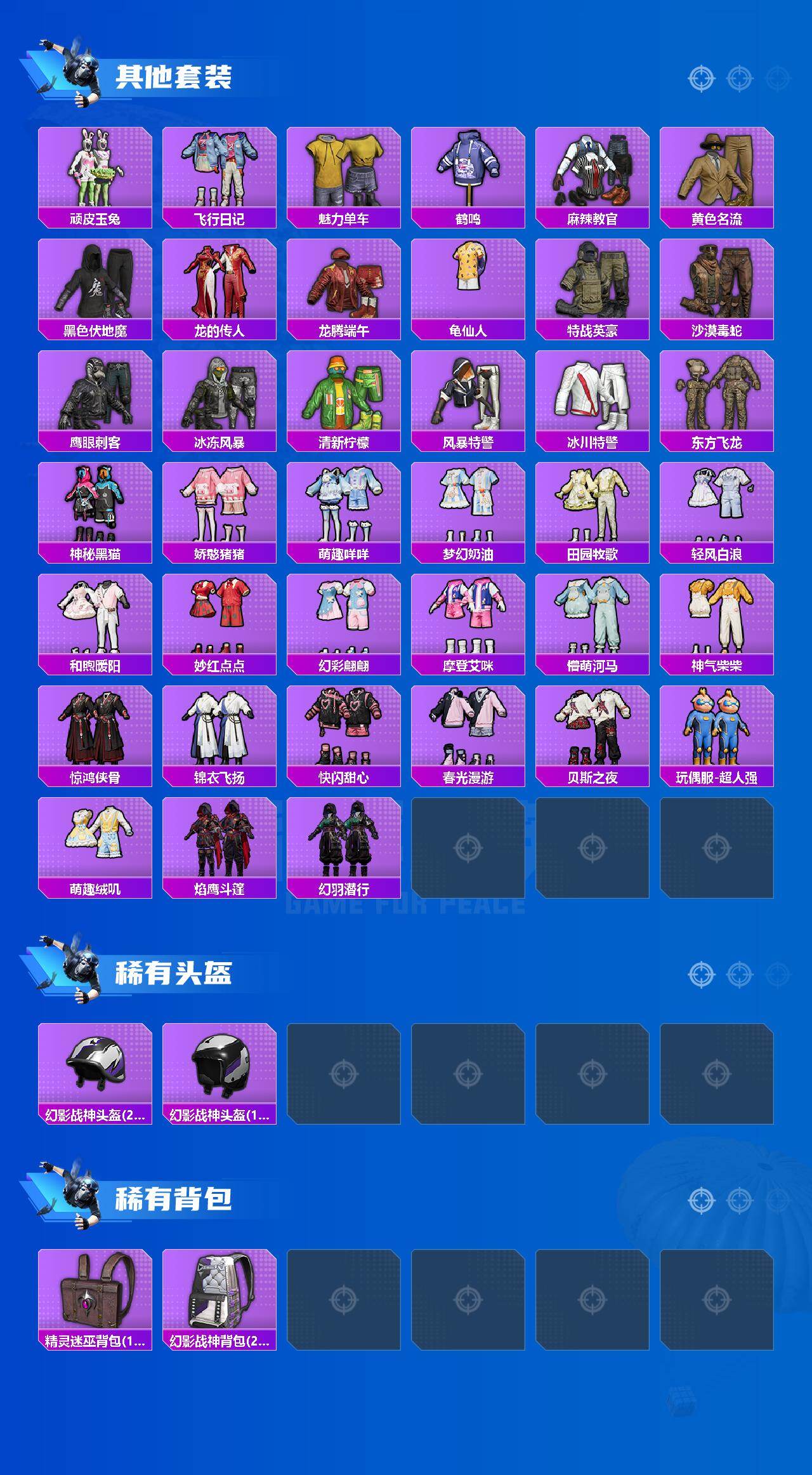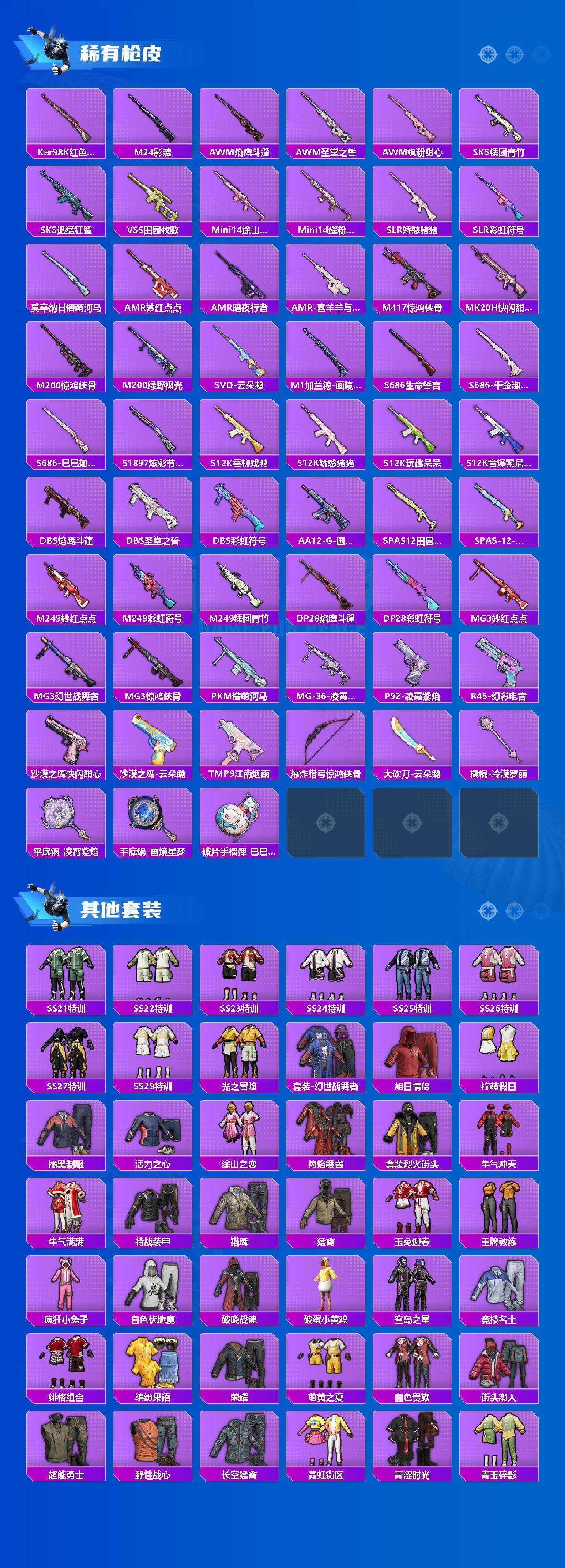 0载具-129套装-181呛皮-129套装/呛械3/装备214/战备132/王牌印记15/热力值51891/五级kar98k-巳巳如意/七级mk12-雪月幻音/五级dp-28-豹影疾电/套装-龟仙人/幻影战神/未来歌姬/粉装-未来领航者/kar98k-巳巳如意/mk12-雪月幻音/dp-28-豹影疾电/音爆索尼克降落伞/天星战神降落伞/闲梦青缨降落伞/蜜语绒猫降落伞/未来领航者降落伞/千金淑猫降落伞/临安公主降落伞/冷漠罗丽