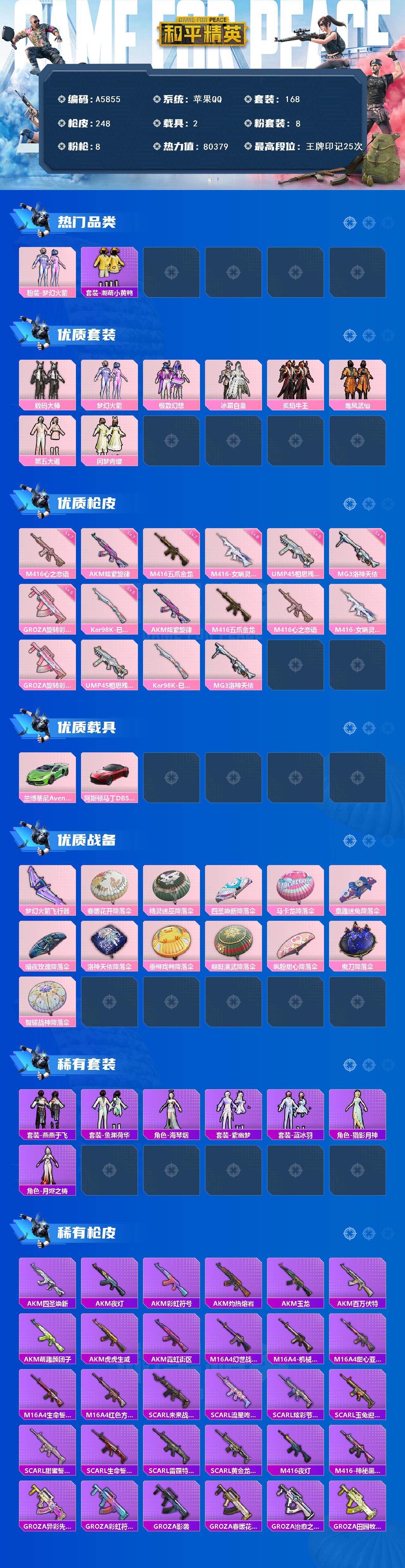 [16672025]苹果【男神号 粉装-梦幻火箭/m416-五爪金龙七级/m416-心之恋语七级/m416-女娲灵识六级/兰博基尼aventad svj(翡翠绿)/阿斯顿马丁dbs(红)】 手q-8粉装-8特效呛-2载具-1粉色飞行器-80379热力值-25王牌印记-168套装-248呛皮 【热门品类】:粉装-梦幻火箭,套装-潮萌小黄鸭 【粉色套装】:粉装-数码大师,粉装-梦幻火箭,粉装-极致幻想,粉装-冰霜白皇,粉装-炙焰牛王,粉装-鸾凤武仙,粉装-第五大道,粉装-闲梦青缨 【粉色呛皮等级】:akm-炫紫旋律七级,m416-五爪金龙七级,m416-心之恋语七级,m416-女娲灵识六级,groza-旋转彩虹五级,ump45-相思残雪五级,kar98k-巳巳如意五级,mg3-洛神天依五级 【粉色载具】:兰博基尼aventad svj(翡翠绿),阿斯顿马丁dbs(红) 【粉色呛皮】:akm-炫紫旋律,m416-五爪金龙,m416-心之恋语,m416-女娲灵识,groza-旋转彩虹,ump45-相思残雪,kar98k-巳巳如意,mg3-洛神天依 【粉色飞行器】:梦幻火箭飞行器 【粉色降落伞】:春暖花开降落伞,精灵迷巫降落伞,四圣焕新降落伞,马卡龙降落伞,童趣迷兔降落伞,暗夜玫瑰降落伞,洛神天依降落伞,垂柳戏鸭降落伞,翩跹演武降落伞,飒粉甜心降落伞,鬼刀降落伞,智耀战神降落伞 【稀有套装】:套装-燕燕于飞,套装-鱼渊荷华,角色-海琴烟,套装-紫幽梦,套装-蓝冰羽,角色-猎影月神,角色-月烬之祷 【稀有呛皮】:akm-四圣焕新,akm-夜灯,akm-彩虹符号,akm-灼热熔岩,akm-玉龙,akm-百万伏特,akm-萌趣颜团子,akm-虎虎生威,akm-霓虹街区,m16a4-幻世战舞者,m16a4-机械英豪,m16a4-甜心亚梦,m16a4-生命誓言,m16a4-红色方程式,scar-l-未来战士,scar-l-流星咚咚,scar-l-炫彩节奏,scar-l-玉兔迎春,scar-l-甜蜜誓约,scar-l-生命誓言,scar-l-雷霆特警,scar-l-黄金龙骨,m416-夜灯,m416-神秘黑猫,groza-异彩先驱,groza-彩虹符号,groza-影袭,groza-春暖花开,groza-治愈之星,groza-田园牧歌,groza-雷霆特