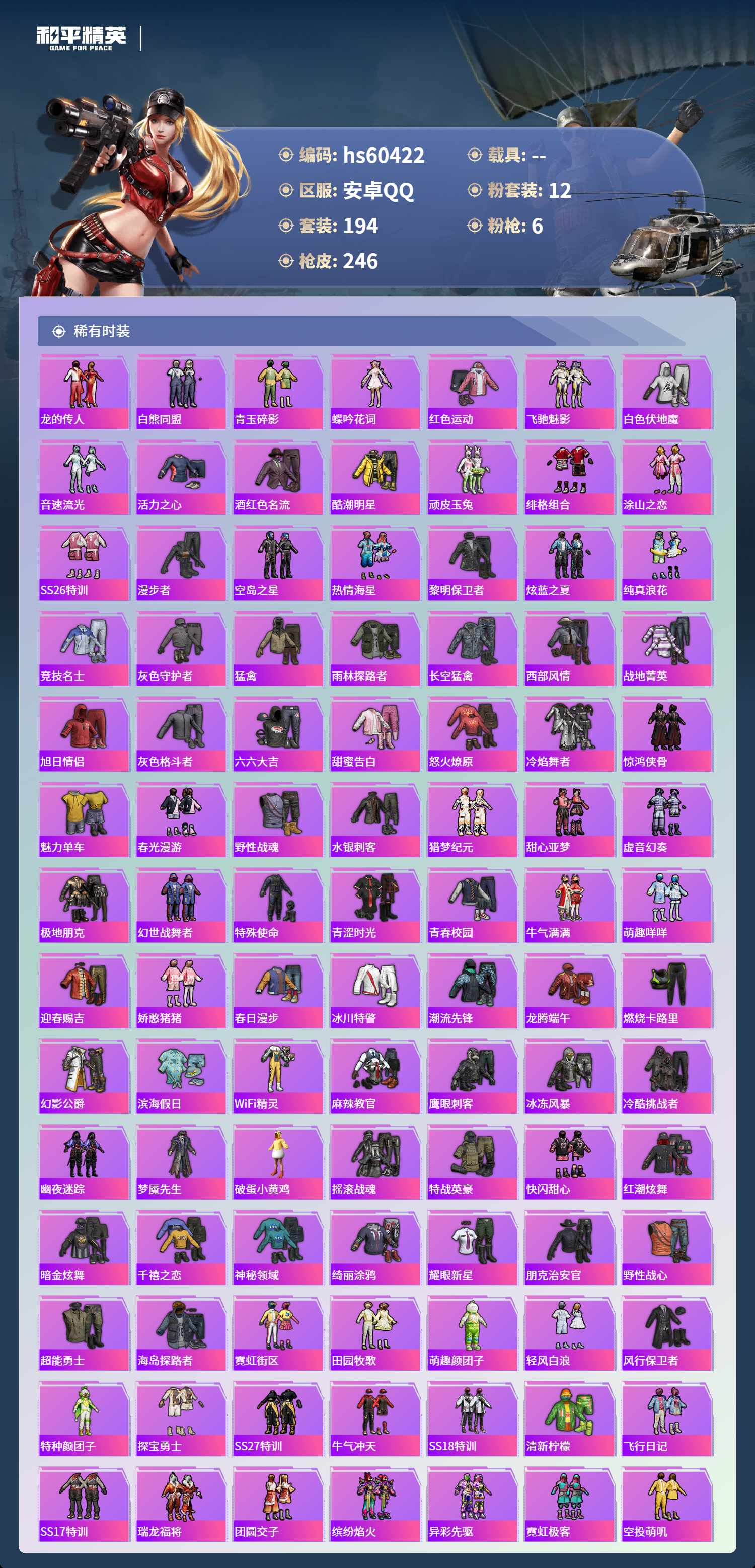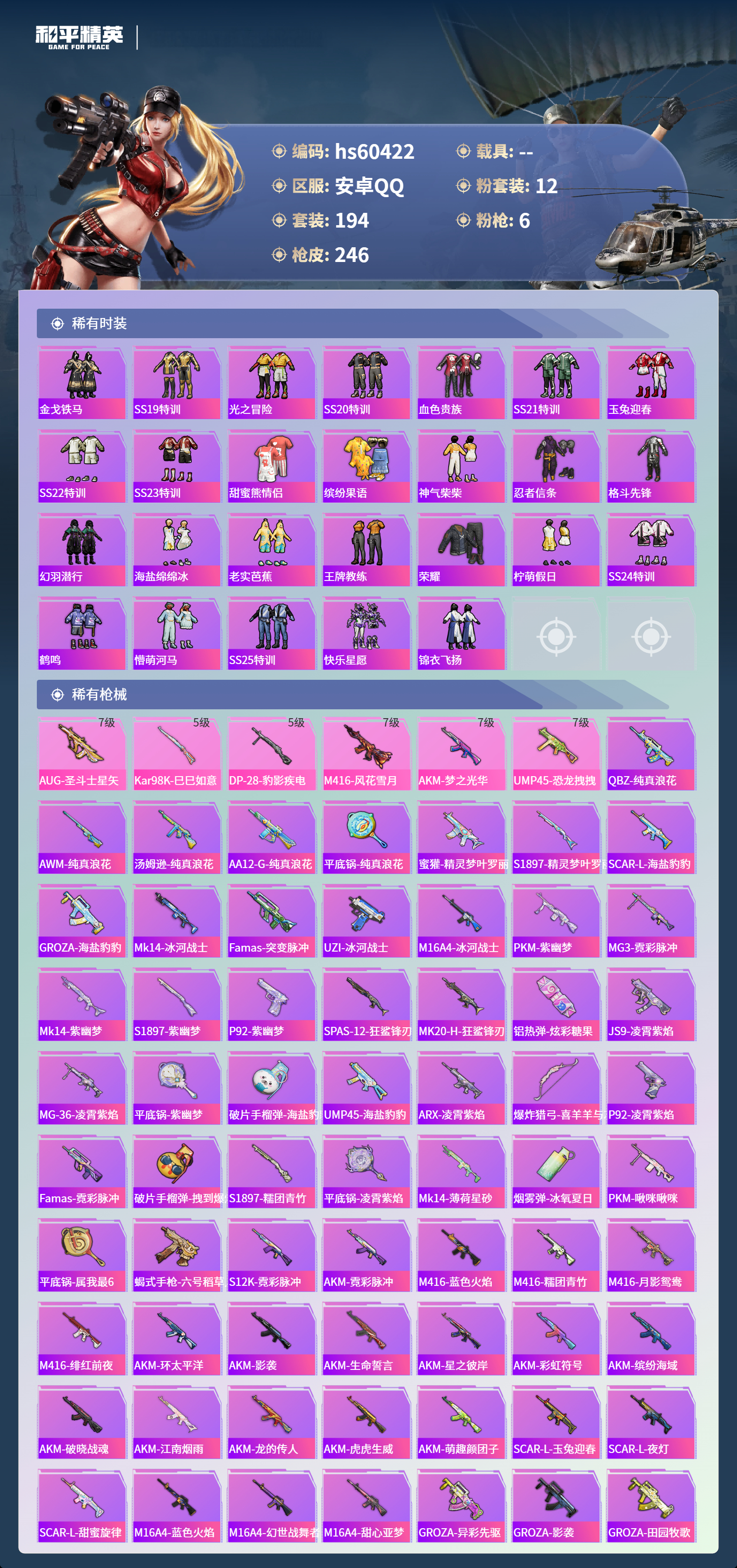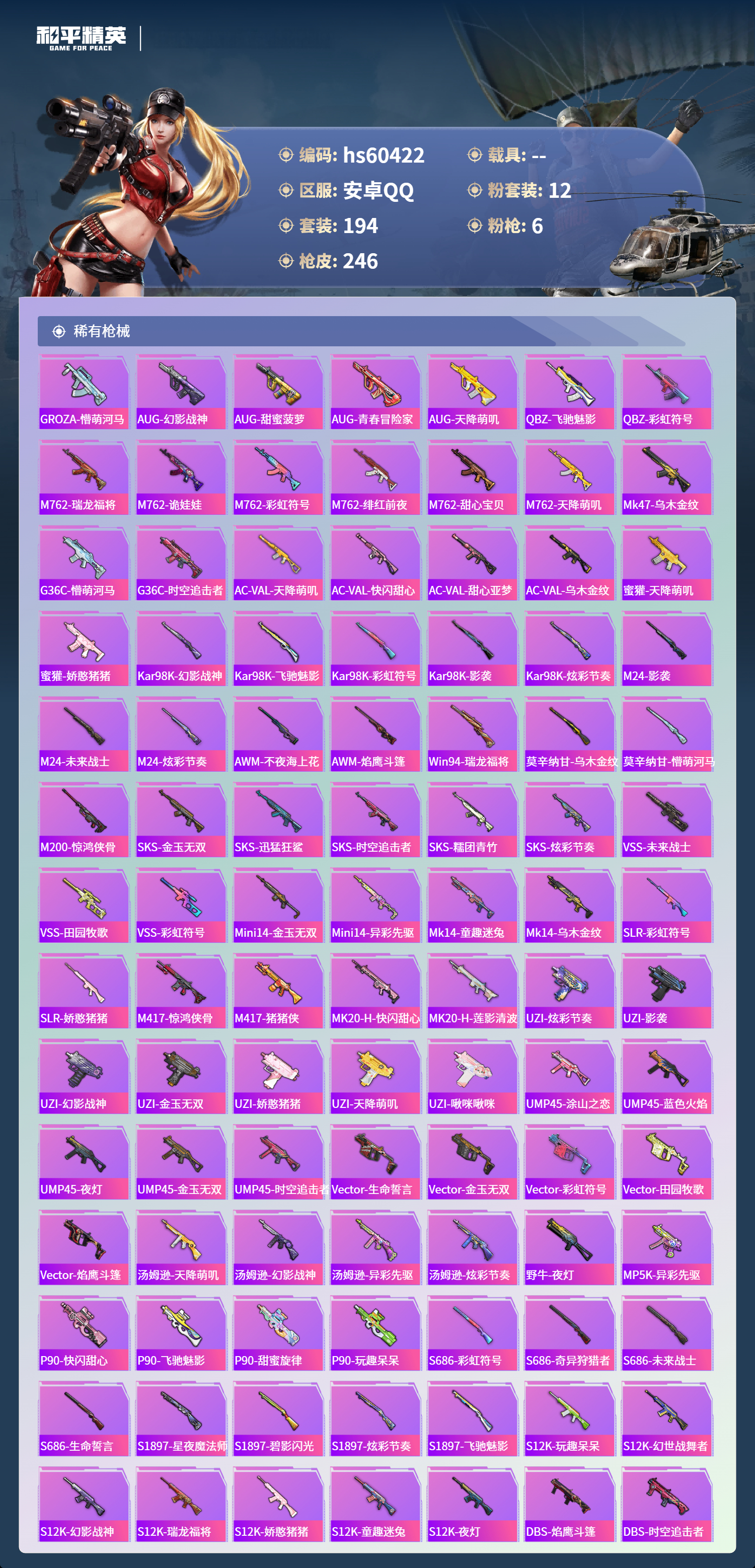 hs60422 安卓手q-19王牌印记-12粉装-6特效呛-79593热力值-194套装-246呛皮-1卓越印记【12粉装】套装-天使彩虹糖角色-樱桃泡泡套装-幻影战神角色-洛天依套装-宝贝奶油派套装-绚金战神套装-甜心巧克力套装-极限特训套装-未来战士套装-智能音符角色-凤凰座 一辉角色-猩猩队长【6特效呛】dp-28-豹影疾电/5级akm-梦之光华/7级kar98