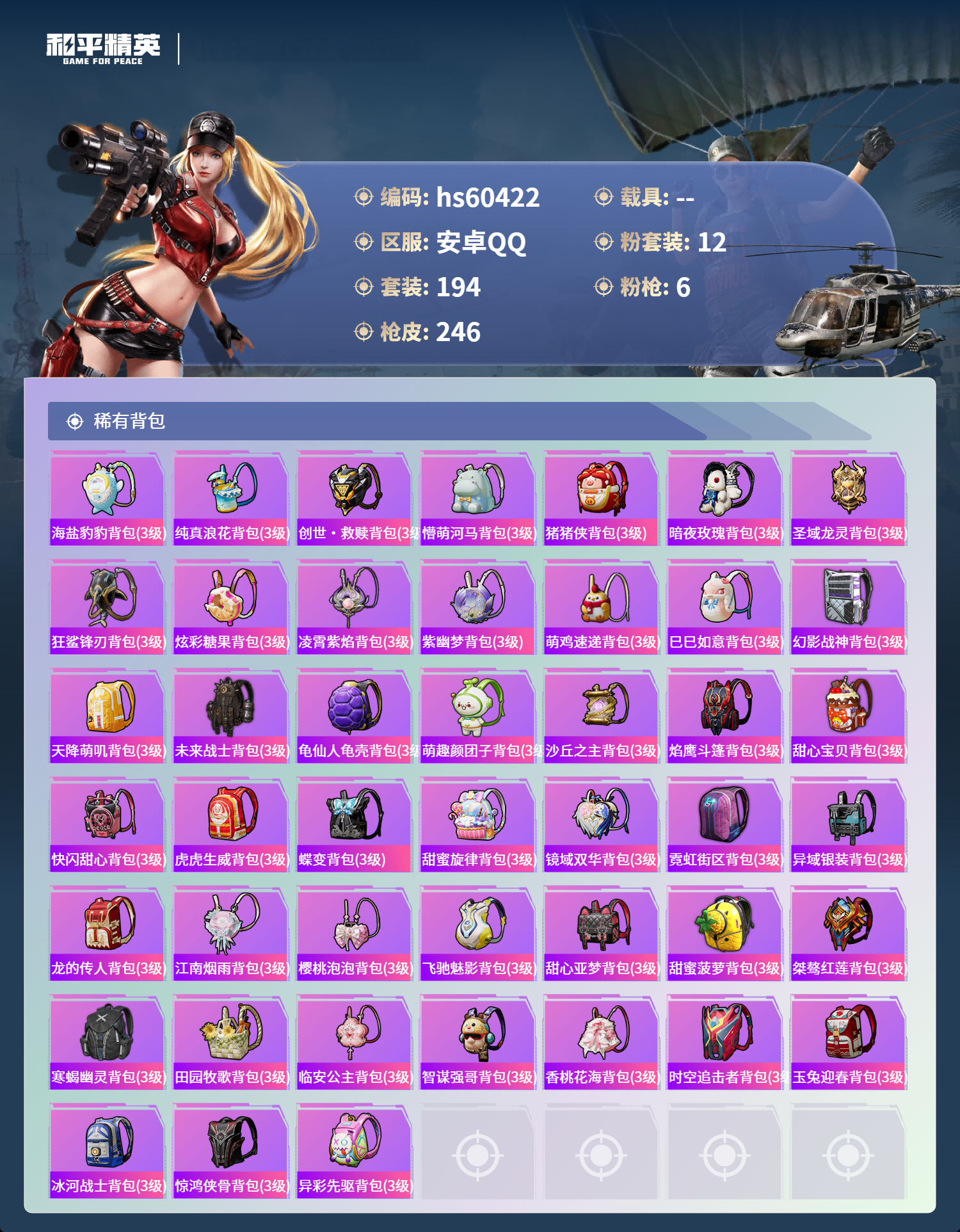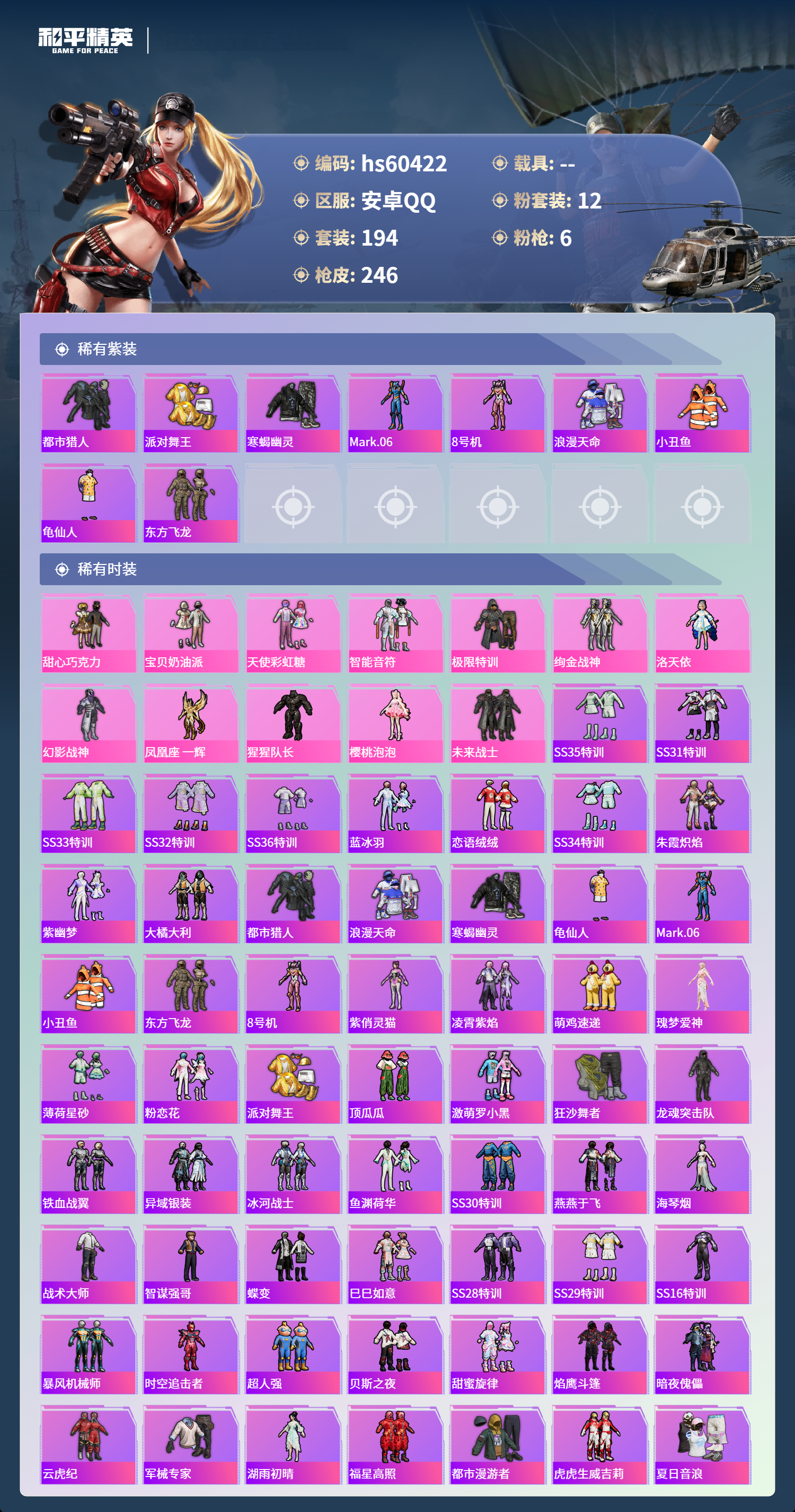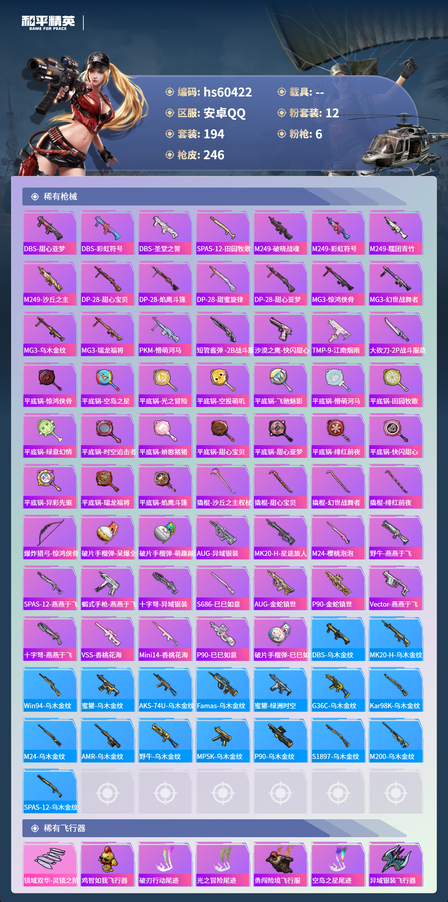hs60422 安卓手q-19王牌印记-12粉装-6特效呛-79593热力值-194套装-246呛皮-1卓越印记【12粉装】套装-天使彩虹糖角色-樱桃泡泡套装-幻影战神角色-洛天依套装-宝贝奶油派套装-绚金战神套装-甜心巧克力套装-极限特训套装-未来战士套装-智能音符角色-凤凰座 一辉角色-猩猩队长【6特效呛】dp-28-豹影疾电/5级akm-梦之光华/7级kar98