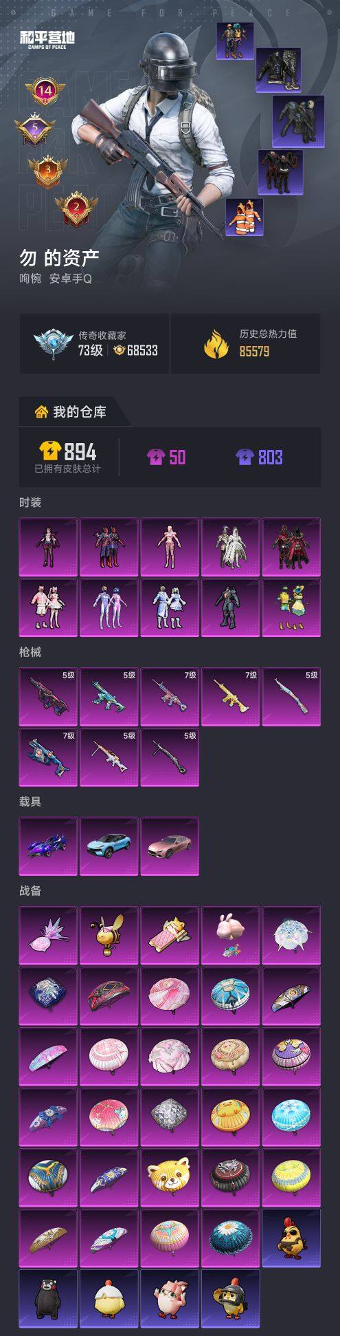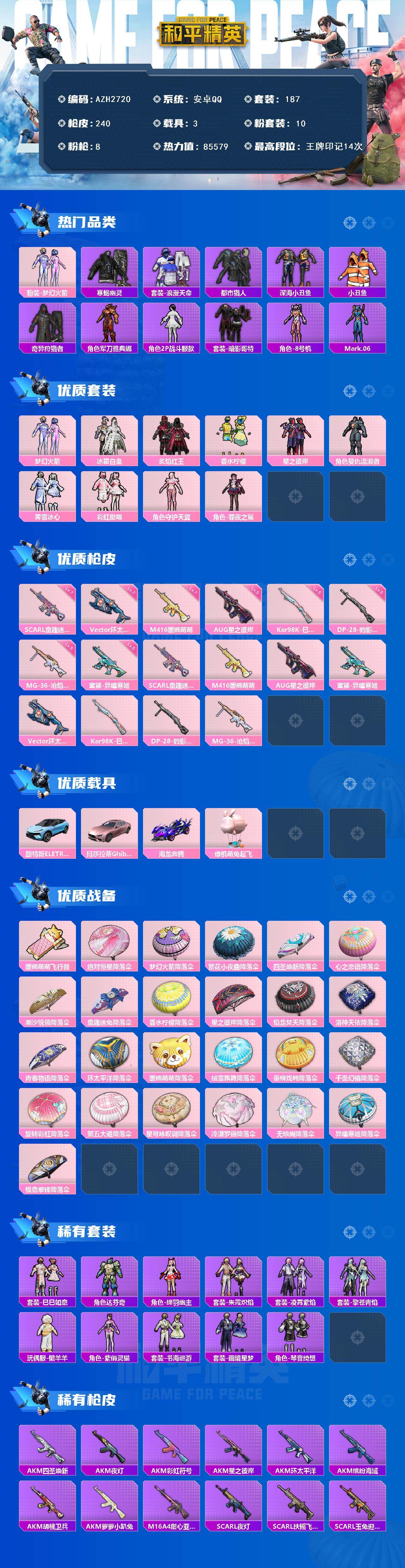安卓 手q【都市寒蝎 梦幻火箭彩虹甜喵 深海小丑鱼暗影哥特 满级童趣迷兔scar-l 满级暖熊萌萌m416 满级环太平洋vect 3载具1僚机】10粉装-8特效呛-3载具-3粉色飞行器-85579热力值-14王牌印记-187套装-240呛皮 【热门品类】:粉装-梦幻火箭,套装-寒蝎幽灵,套装-浪漫天命,套装-都市猎人,套装-深海小丑鱼,套装-小丑鱼,套装-奇异狩猎者,角色-军刀雅典娜,角色