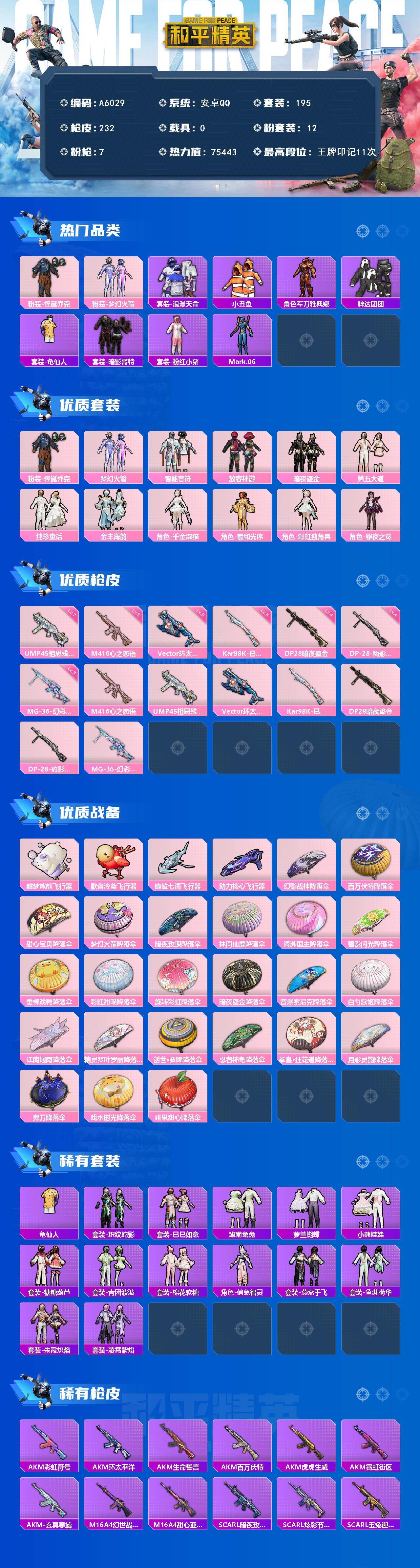 [16674993]安卓 【素材号 怪诞乔克/梦幻火箭/浪漫天命/小丑鱼/暗影哥特/龟仙人/mark.06/放客神游/m416-心之恋语五级/vect-环太平洋五级】手q-12粉装-7特效呛-0载具-5粉色飞行器-75443热力值-11王牌印记-195套装-232呛皮 【热门品类】:粉装-怪诞乔克,粉装-梦幻火箭,套装-浪漫天命,套装-小丑鱼,角色-军刀雅典娜,套装-胖达团团,套装-龟仙人,套装-暗影哥特,套装-粉红小猪,角色-mark.06 【粉色套装】:粉装-怪诞乔克,粉装-梦幻火箭,粉装-智能音符,粉装-放客神游,粉装-暗夜鎏金,粉装-第五大道,粉装-纯珍童话,粉装-金丰海韵,角色-千金淑猫,角色-羲和光序,角色-彩虹独角兽,角色-罪夜之冕 【粉色呛皮等级】:m416-心之恋语五级,ump45-相思残雪七级,vect-环太平洋五级,kar98k-巳巳如意五级,dp-28-暗夜鎏金四级,dp-28-豹影疾电四级,mg-36-幻彩电音三级 【粉色呛皮】:m416-心之恋语,ump45-相思残雪,vect-环太平洋,kar98k-巳巳如意,dp-28-暗夜鎏金,dp-28-豹影疾电,mg-36-幻彩电音 【粉色飞行器】:酣梦熊熊飞行器,歌者泠鸢飞行器,脆鲨七海飞行器,动力核心飞行器 【粉色降落伞】:幻影战神降落伞,百万伏特降落伞,甜心宝贝降落伞,梦幻火箭降落伞,暗夜玫瑰降落伞,林间仙鹿降落伞,海渊国主降落伞,碧影闪光降落伞,垂柳戏鸭降落伞,彩虹甜喵降落伞,旋转彩虹降落伞,暗夜鎏金降落伞,音爆索尼克降落伞,白勺歌姬降落伞,江南烟雨降落伞,精灵梦叶罗丽降落伞,创世·救赎降落伞,忍者神龟降落伞,拳皇·狂花道降落伞,月影灵韵降落伞,鬼刀降落伞,戏水时光降落伞,绯果甜心降落伞,炫彩糖果降落伞 【稀有套装】:套装-龟仙人,套装-炽纹蛇影,套装-巳巳如意,套装-雏菊兔兔,套装-萝兰蝴蝶,套装-小熊娃娃,套装-糖糖葫芦,套装-青团波波,套装-棉花软糖,角色-俏兔智灵,套装-燕燕于飞,套装-鱼渊荷华,套装-朱霞炽焰,套装-凌霄紫焰 【稀有呛皮】:akm-彩虹符号,akm-环太平洋,akm-生命誓言,akm-百万伏特,akm-虎虎生威,akm-霓虹街区,akm-玄冥寒域,m16a4-幻世战舞者,m16a4-甜心亚梦,scar-l-暗夜玫瑰,scar-l-炫
