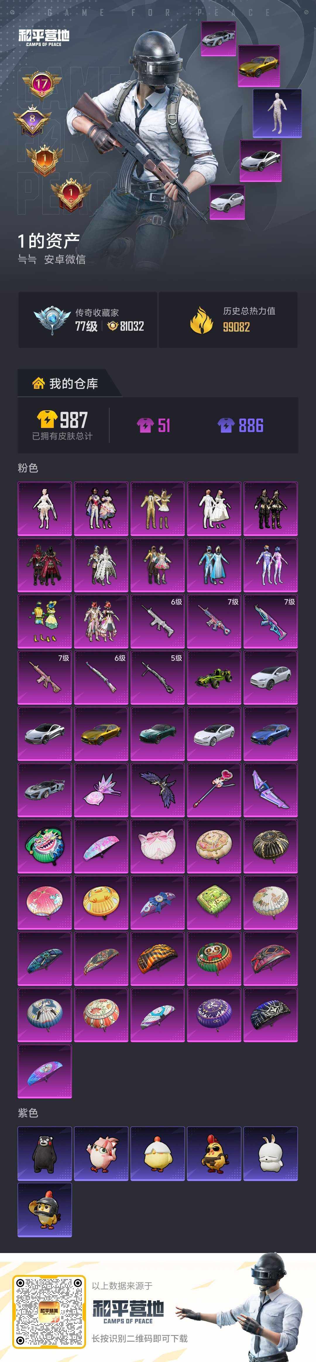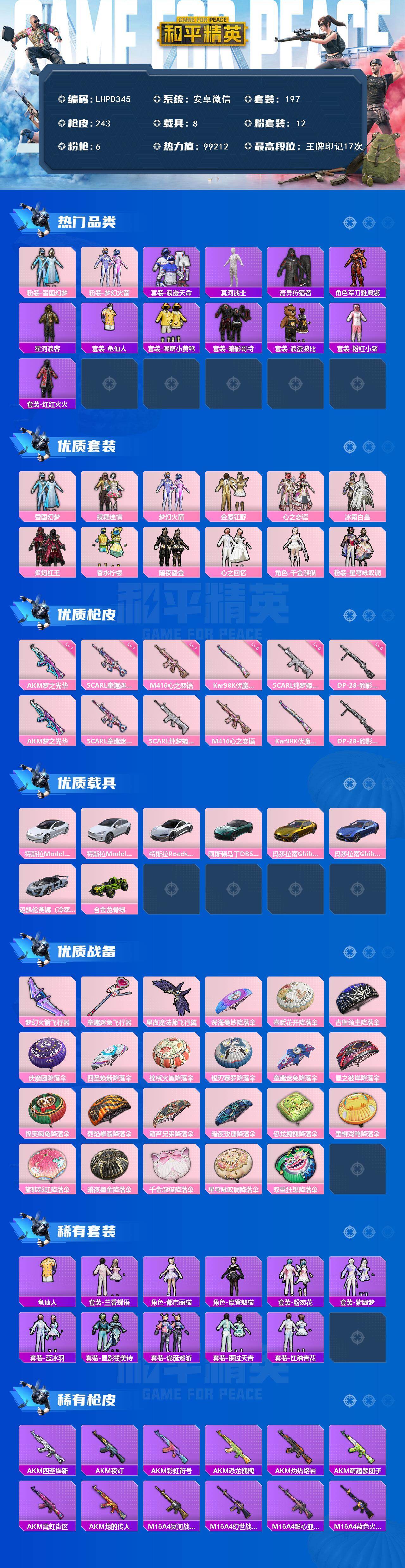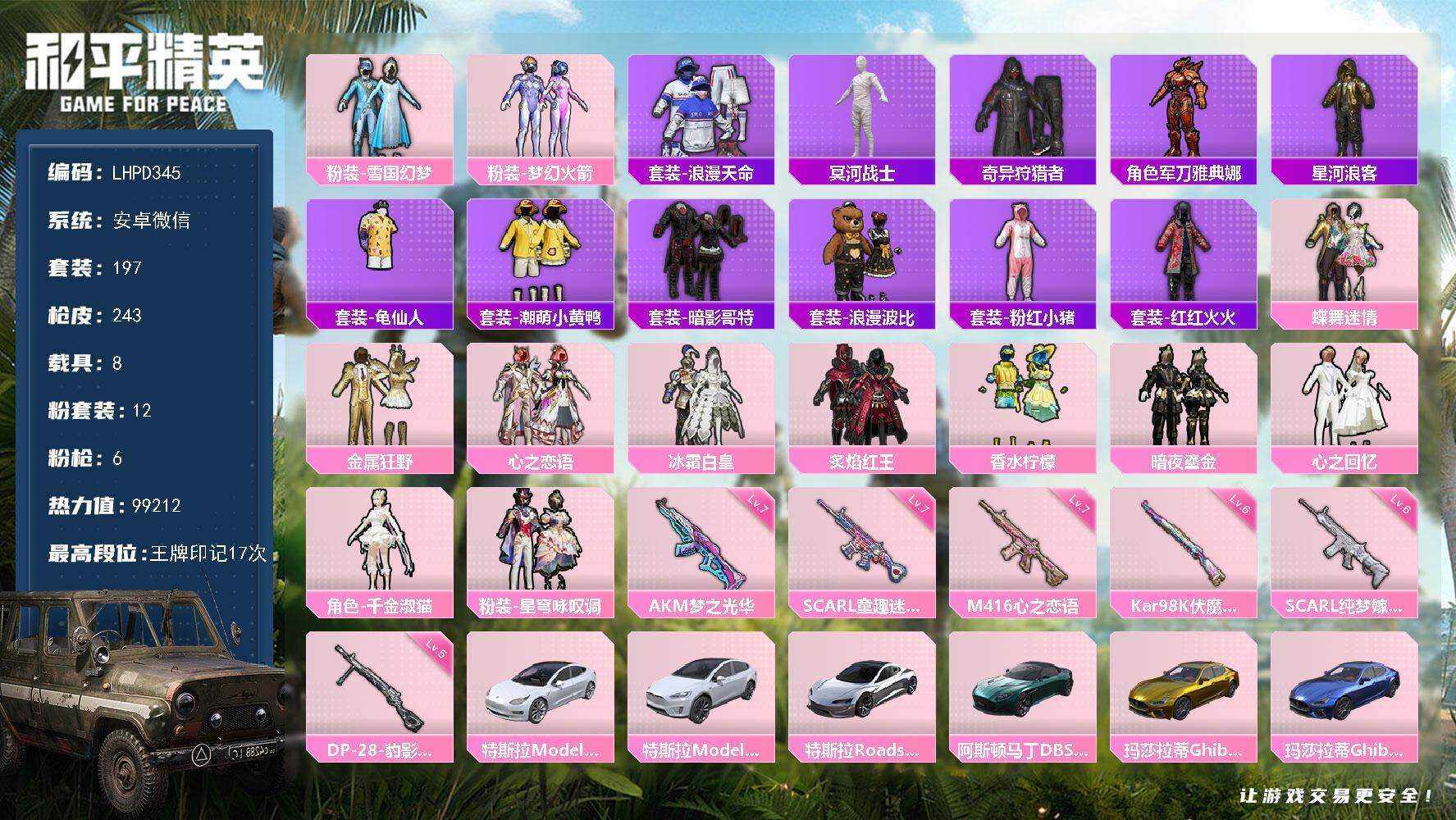 8载具-197套装-243呛皮-【店主推荐捡漏号!可直接换绑】安卓 微信-12粉装-6特效呛-8载具-4粉色飞行器-99212热力值-17王牌印记-197套装-243呛皮【热门品类】:粉装-雪国幻梦,粉装-梦幻火箭,套装-浪漫天命,套装-冥河战士,套装-奇异狩猎者,角色-军刀雅典娜,套装-星河浪客,套装-龟仙人,套装-潮萌小黄鸭,