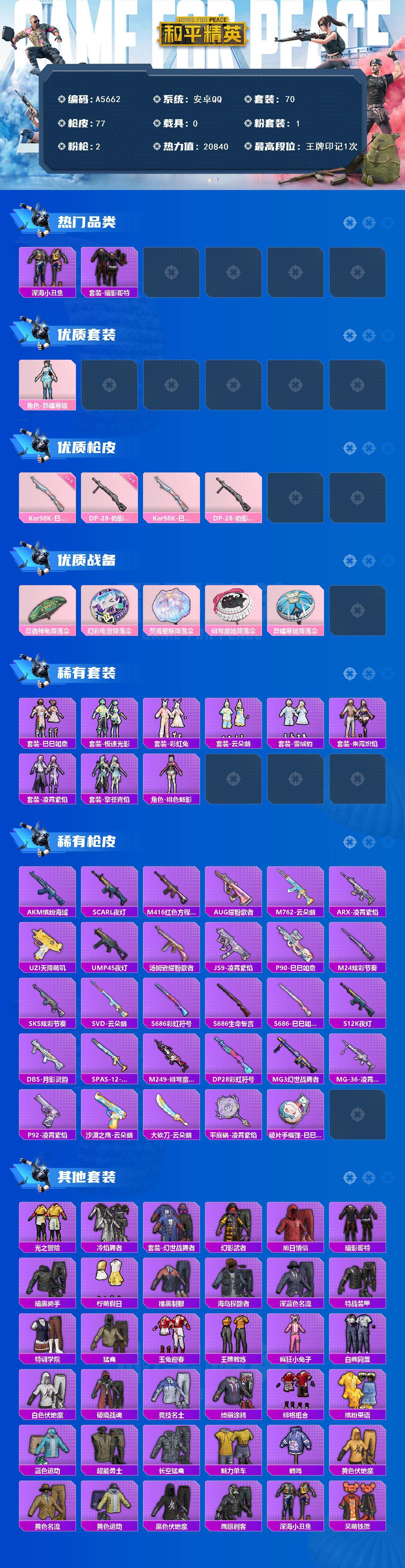 [16506949]安卓 【小号 深海小丑鱼/暗影哥特】手q-1粉装-2特效呛-0载具-1粉色飞行器-20840热力值-1王牌印记-70套装-77呛皮 【热门品类】:套装-深海小丑鱼,套装-暗影哥特 【粉色套装】:角色-异瞳寒姬 【粉色呛皮等级】:kar98k-巳巳如意五级,dp-28-豹影疾电五级 【粉色呛皮】:kar98k-巳巳如意,dp-28-豹影疾电 【粉色降落伞】:忍者神龟降落伞,幻彩电音降落伞,荧海星豚降落伞,绯穹魔姬降落伞,异瞳寒姬降落伞,炫彩糖果降落伞 【稀有套装】:套装-巳巳如意,套装-极速光影,套装-彩虹兔,套装-云朵鹅,套装-雪绒豹,套装-朱霞炽焰,套装-凌霄紫焰,套装-擎苍青焰,角色-绯色魅影 【稀有呛皮】:akm-缤纷海域,scar-l-夜灯,m416-红色方程式,aug-耀粉歌者,m762-云朵鹅,arx-凌霄紫焰,uzi-天降萌叽,ump45-夜灯,汤姆逊-耀粉歌者,js9-凌霄紫焰,p90-巳巳如意,m24-炫彩节奏,sks-炫彩节奏,svd-云朵鹅,s686-彩虹符号,s686-生命誓言,s686-巳巳如意,s12k-夜灯,dbs-月影灵韵,spas-12-云朵鹅,m249-绯穹魔姬,dp-28-彩虹符号,mg3-幻世战舞者,mg-36-凌霄紫焰,p92-凌霄紫焰,沙墨之鹦-云朵鹅,大砍刀-云朵鹅,平底锅-凌霄紫焰,破片手留单-巳巳如意 【其他套装】:套装-光之冒险,套装-冷焰舞者,套装-幻世战舞者,套装-幻影武者,套装-旭日情侣,套装-暗影哥特,套装-暗黑骑手,套装-柠萌假日,套装-橘黑制服,套装-海岛探路者,套装-深蓝色名流,套装-特战装甲,套装-特训学院,套装-猛禽,套装-玉兔迎春,套装-王牌教练,套装-疯狂小兔子,套装-白熊同盟,套装-白色伏地魔,套装-破晓战魂,套装-竞技名士,套装-绮丽涂鸦,套装-绯格组合,套装-缤纷果语,套装-蓝色运动,套装-超能勇士,套装-长空猛禽,套装-魅力单车,套装-鹤鸣,套装-黄色伏地魔,套装-黄色名流,套装-黄色运动,套装-黑色伏地魔,套装-鹰眼刺客,套装-深海小丑鱼,套装-呆萌铁蟹,套装-弄潮海豚 【稀有头盔】:深海小丑鱼头盔2级,深海小丑鱼头盔1级 【稀有背包】:深海小丑鱼背包2级,深海小丑鱼背包1级 【营地id】:978409562