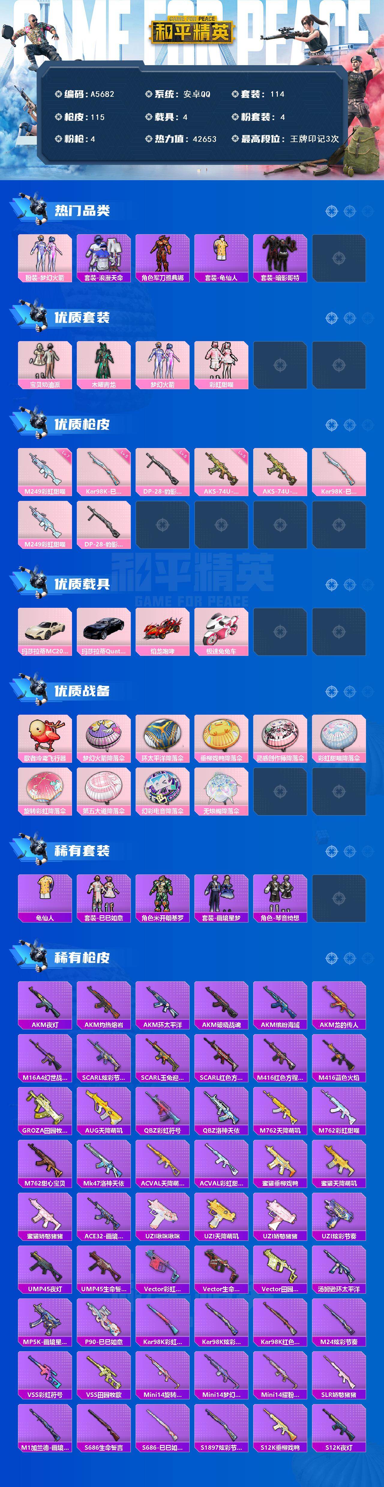 [16445827]安卓【男神号 粉装-梦幻火箭/套装-暗影哥特/套装-浪漫天命/m249-彩虹甜喵七级/aks-74u-森灵之息五级/玛莎拉蒂mc20(星石白)/玛莎拉蒂quattropte(夜幕蓝)】 手q-4粉装-4特效呛-4载具-1粉色飞行器-42653热力值-3王牌印记-114套装-115呛皮 【热门品类】:粉装-梦幻火箭,套装-浪漫天命,角色-军刀雅典娜,套装-龟仙人,套装-暗影哥特 【粉色套装】:粉装-宝贝奶油派,粉装-木曜青龙,粉装-梦幻火箭,粉装-彩虹甜喵 【粉色呛皮等级】:aks-74u-森灵之息五级,kar98k-巳巳如意五级,m249-彩虹甜喵七级,dp-28-豹影疾电五级 【粉色载具】:玛莎拉蒂mc20(星石白),玛莎拉蒂quattropte(夜幕蓝),焰龙咆哮,极速兔兔车 【粉色呛皮】:aks-74u-森灵之息,kar98k-巳巳如意,m249-彩虹甜喵,dp-28-豹影疾电 【粉色飞行器】:歌者泠鸢飞行器 【粉色降落伞】:梦幻火箭降落伞,环太平洋降落伞,垂柳戏鸭降落伞,灵感创作师降落伞,彩虹甜喵降落伞,旋转彩虹降落伞,第五大道降落伞,幻彩电音降落伞,无垠阁降落伞,炫彩糖果降落伞 【稀有套装】:套装-龟仙人,套装-巳巳如意,角色-米开朗基罗,套装-画境星梦,套装-琴音绮想 【稀有呛皮】:akm-夜灯,akm-灼热熔岩,akm-环太平洋,akm-破晓战魂,akm-缤纷海域,akm-龙的传人,m16a4-幻世战舞者,scar-l-炫彩节奏,scar-l-玉兔迎春,scar-l-红色方程式,m416-红色方程式,m416-蓝色火焰,groza-田园牧歌,aug-天降萌叽,q-彩虹符号,q-洛神天依,m762-天降萌叽,m762-彩虹甜喵,m762-甜心宝贝,mk47-洛神天依,ac-val-天降萌叽,ac-val-彩虹甜喵,蜜獾-垂柳戏鸭,蜜獾-天降萌叽,蜜獾-娇憨猪猪,ace32-画境星梦,uzi-啾咪啾咪,uzi-天降萌叽,uzi-娇憨猪猪,uzi-炫彩节奏,ump45-夜灯,ump45-生命誓言,vect-彩虹符号,vect-生命誓言,vect-田园牧歌,汤姆逊-环太平洋,mp5k-画境星梦,p90-巳巳如意,kar98k-彩虹符号,kar98k-炫彩节奏,kar98k-红色方程式,m24-炫彩节奏,vs