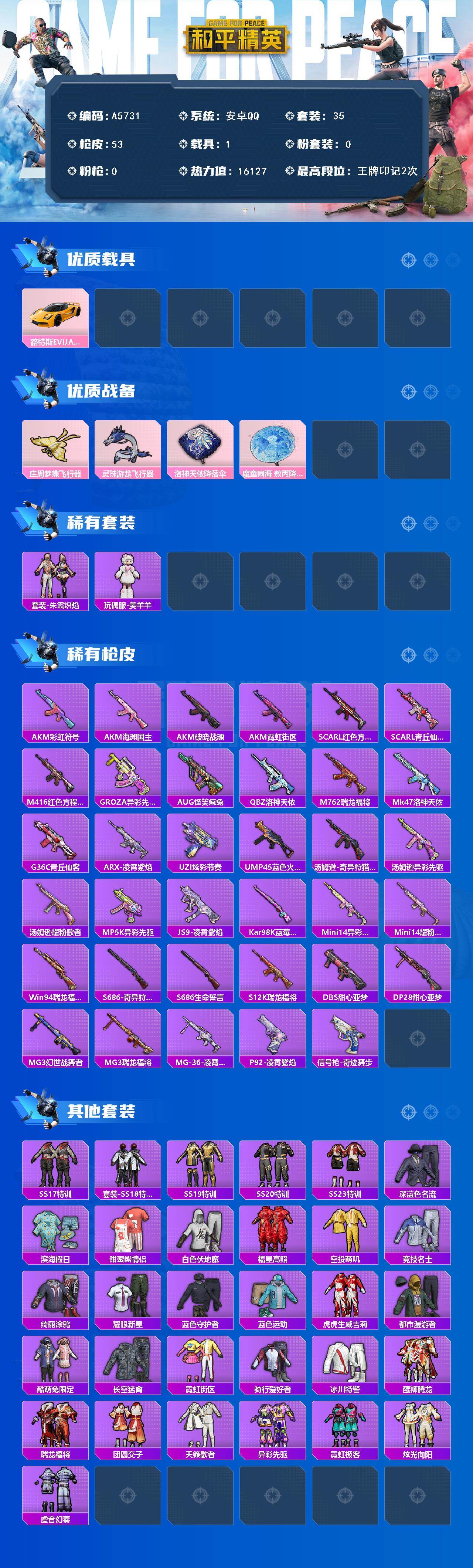 [16449046]安卓 【小号 路特斯evija(星际黄)】手q-0粉装-0特效呛-1载具-2粉色飞行器-16127热力值-2王牌印记-35套装-53呛皮 【粉色载具】:路特斯evija(星际黄) 【粉色飞行器】:庄周梦蝶飞行器,灵珠游龙飞行器 【粉色降落伞】:洛神天依降落伞,魔童闹海 敖丙降落伞,炫彩糖果降落伞 【稀有套装】:套装-朱霞炽焰,玩偶服-美羊羊 【稀有呛皮】:akm-彩虹符号,akm-海渊国主,akm-破晓战魂,akm-霓虹街区,scar-l-红色方程式,scar-l-青丘仙客,m416-红色方程式,groza-异彩先驱,aug-怪笑疯兔,q-洛神天依,m762-瑞龙福将,mk47-洛神天依,g36c-青丘仙客,arx-凌霄紫焰,uzi-炫彩节奏,ump45-蓝色火焰,汤姆逊-奇异狩猎者,汤姆逊-异彩先驱,汤姆逊-耀粉歌者,mp5k-异彩先驱,js9-凌霄紫焰,kar98k-蓝莓炮弹,mini14-异彩先驱,mini14-耀粉歌者,win94-瑞龙福将,s686-奇异狩猎者,s686-生命誓言,s12k-瑞龙福将,dbs-甜心亚梦,dp-28-甜心亚梦,mg3-幻世战舞者,mg3-瑞龙福将,mg-36-凌霄紫焰,p92-凌霄紫焰,信号呛-奇迹舞步 【其他套装】:套装-ss17特训,套装-ss18特训,套装-ss19特训,套装-ss20特训,套装-ss23特训,套装-深蓝色名流,套装-滨海假日,套装-甜蜜熊情侣,套装-白色伏地魔,套装-福星高照,套装-空投萌叽,套装-竞技名士,套装-绮丽涂鸦,套装-耀眼新星,套装-蓝色守护者,套装-蓝色运动,套装-虎虎生威吉莉,套装-都市漫游者,套装-酷萌兔限定,套装-长空猛禽,套装-霓虹街区,套装-骑行爱好者,套装-冰川特警,套装-醒狮腾龙,套装-瑞龙福将,套装-团圆交子,套装-天籁歌者,套装-异彩先驱,套装-霓虹极客,套装-炫光向阳,套装-虚音幻奏 【营地id】:787930409
