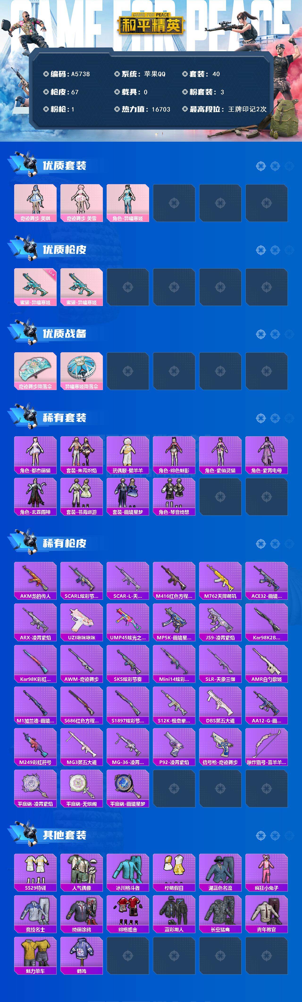 [16448867]苹果 【小号 奇迹舞步 美琪/奇迹舞步 美雪】手q-3粉装-1特效呛-0载具-1粉色飞行器-16703热力值-2王牌印记-40套装-67呛皮 【粉色套装】:角色-奇迹舞步 美琪,角色-奇迹舞步 美雪,角色-异瞳寒姬 【粉色呛皮等级】:蜜獾-异瞳寒姬四级 【粉色呛皮】:蜜獾-异瞳寒姬 【粉色降落伞】:奇迹舞步降落伞,异瞳寒姬降落伞,炫彩糖果降落伞 【稀有套装】:套装-炫彩糖果,角色-都市丽猫,套装-朱霞炽焰,玩偶服-懒羊羊,角色-绯色魅影,角色-紫俏灵猫,角色-紫霄电母,角色-玄霖雨神,套装-书海巡游,套装-画境星梦,套装-琴音绮想 【稀有呛皮】:aug-冰晶雪宝,akm-龙的传人,scar-l-炫彩节奏,scar-l-天象三御,m416-红色方程式,m762-天降萌叽,ace32-画境星梦,arx-凌霄紫焰,uzi-啾咪啾咪,ump45-炫光之旅,mp5k-画境星梦,js9-凌霄紫焰,kar98k-2b战斗服款,kar98k-彩虹符号,awm-奇迹舞步,sks-炫彩节奏,mini14-炫彩节奏,slr-天象三御,amr-白勺歌姬,m1加兰德-画境星梦,s686-红色方程式,s1897-炫彩节奏,s12k-极意拳锋,dbs-第五大道,aa12-g-画境星梦,m249-彩虹符号,mg3-第五大道,mg-36-凌霄紫焰,p92-凌霄紫焰,信号呛-奇迹舞步,爆炸猎弓-喜羊羊与灰太狼,平底锅-凌霄紫焰,平底锅-无垠阁,平底锅-画境星梦 【其他套装】:套装-ss29特训,套装-人气偶像,套装-冰川格斗者,套装-柠萌假日,套装-湖蓝色名流,套装-疯狂小兔子,套装-竞技名士,套装-绮丽涂鸦,套装-绯格组合,套装-蓝彩潮人,套装-长空猛禽,套装-青年教官,套装-魅力单车,套装-鹤鸣 【营地id】:971686943