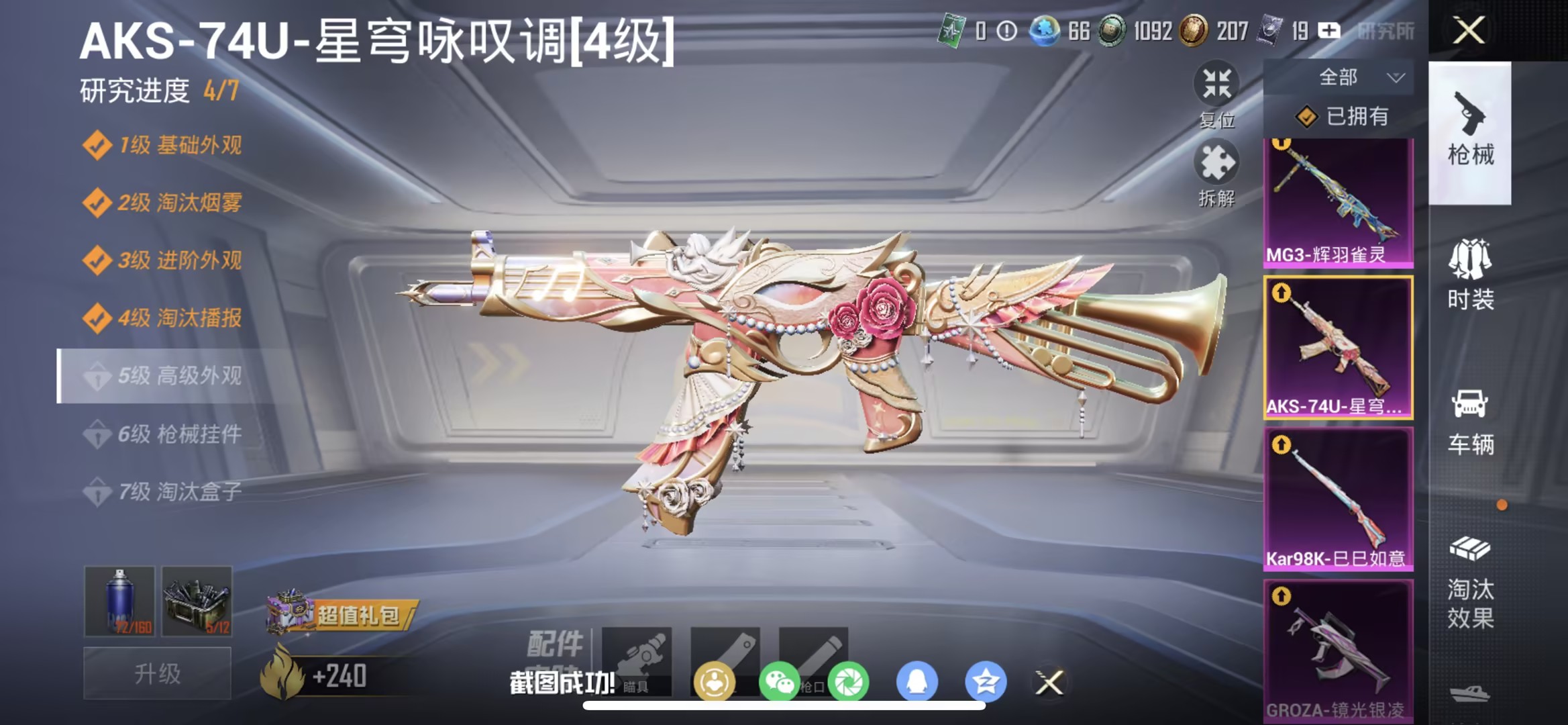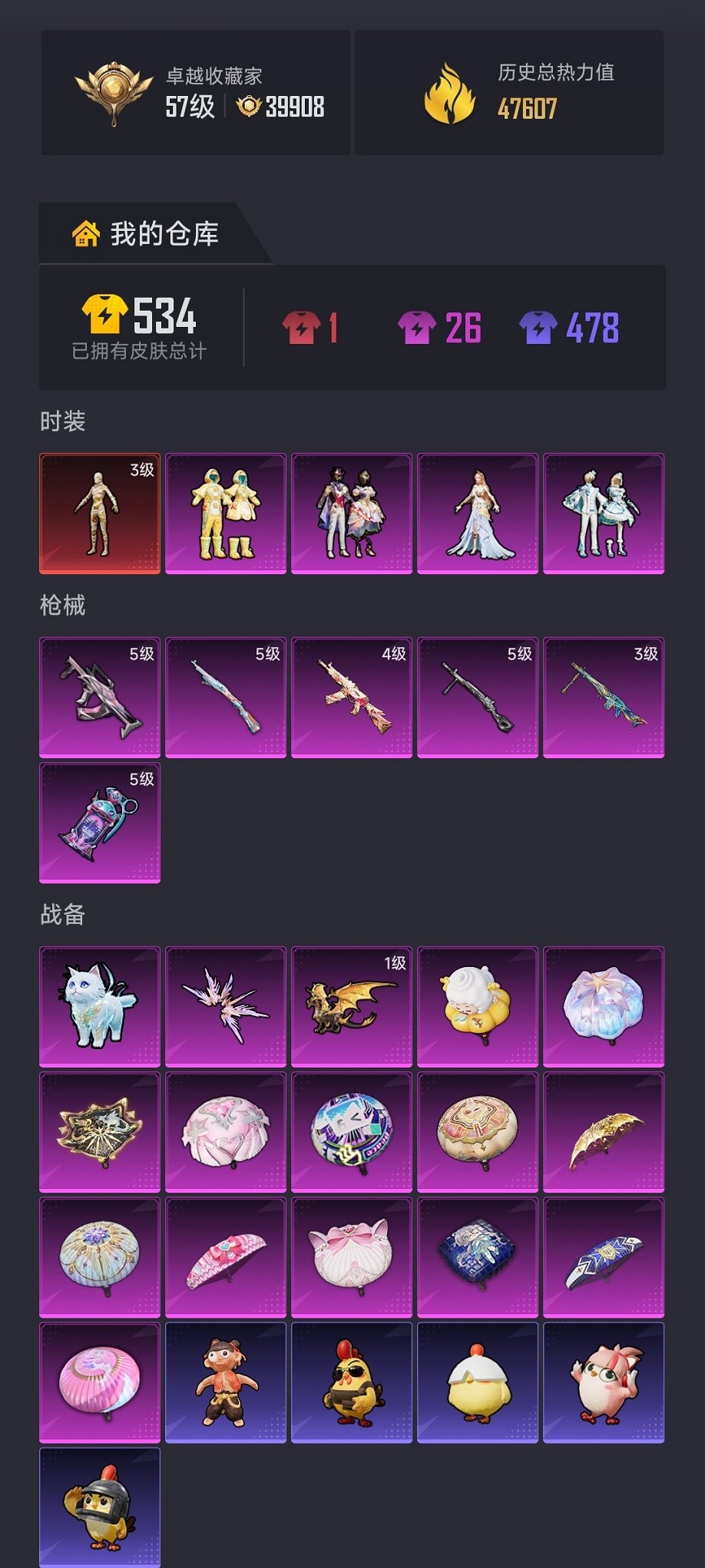 0载具-99套装-147呛皮-【3级图卡盟6特效呛4粉装 秒换绑不用等】 苹果q区-47607热力值-9印记-99套装-147呛皮 【1红装】 沙丘之主-图卡盟3级【1稀有】 奇异狩猎者【4粉装】 垂柳戏鸭 雪月幻音 角色-智耀战神 星穹咏叹调【6特效呛】 mg3-辉羽雀灵3级 盐雾蛋-电雾迷城5级 kar98k-巳巳如意5级 aks-74u-星穹咏叹调4级 groza-镜光银凌5级