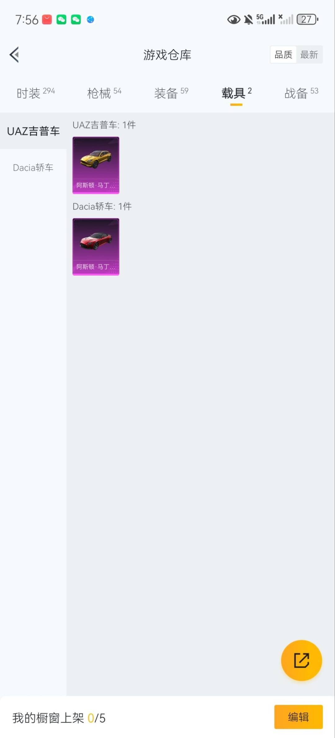 1粉装 2特效呛 2载具 可二次 可修改实名 【热门装扮】香水柠檬 【载具】阿斯顿·马丁dbx金阿斯顿·马丁dbs红 【稀有呛皮】m416心之恋语m762甜蜜誓约 【五级特效呛】五级m416-心之恋语 【四级特效呛】四级m762-甜蜜誓约 【紫色装扮】ss2特训ss3特训ss5特训