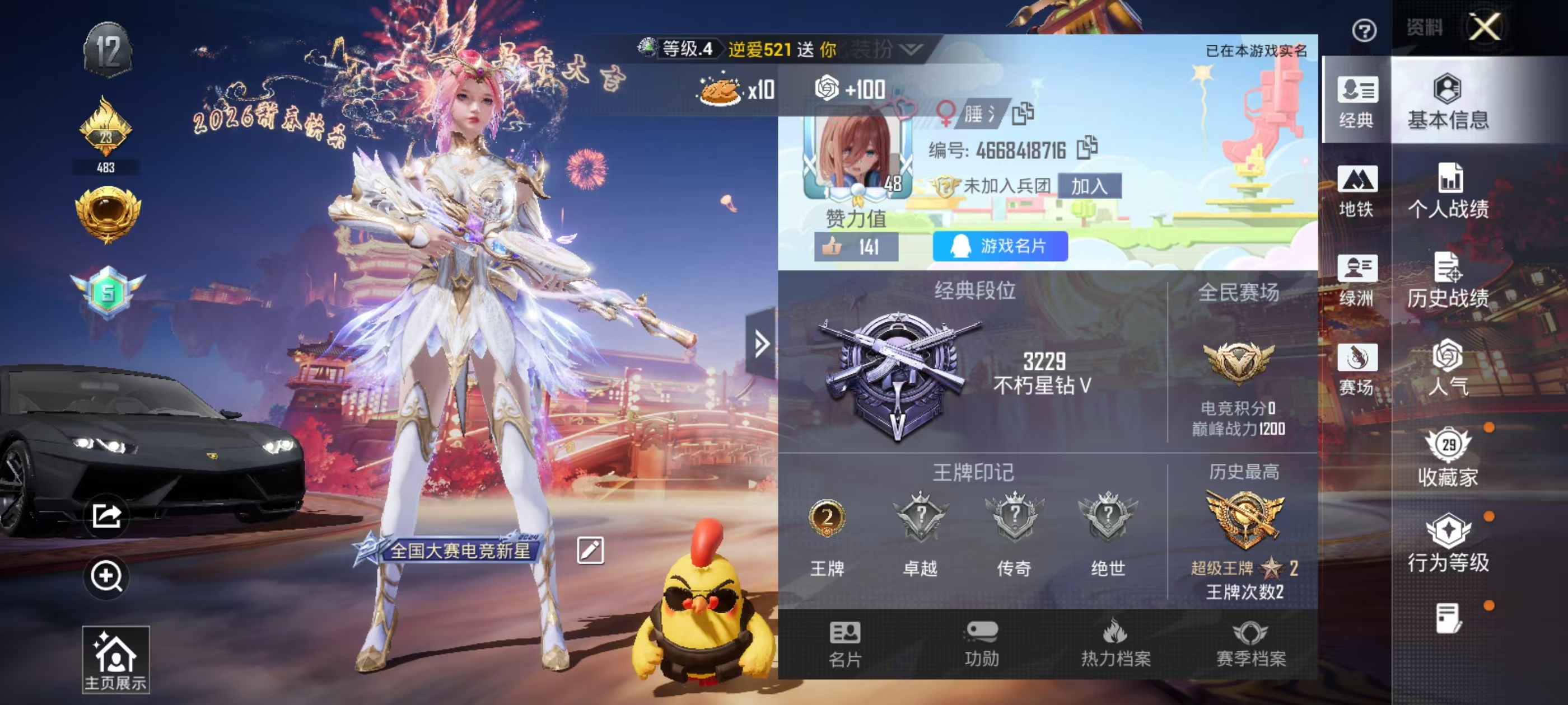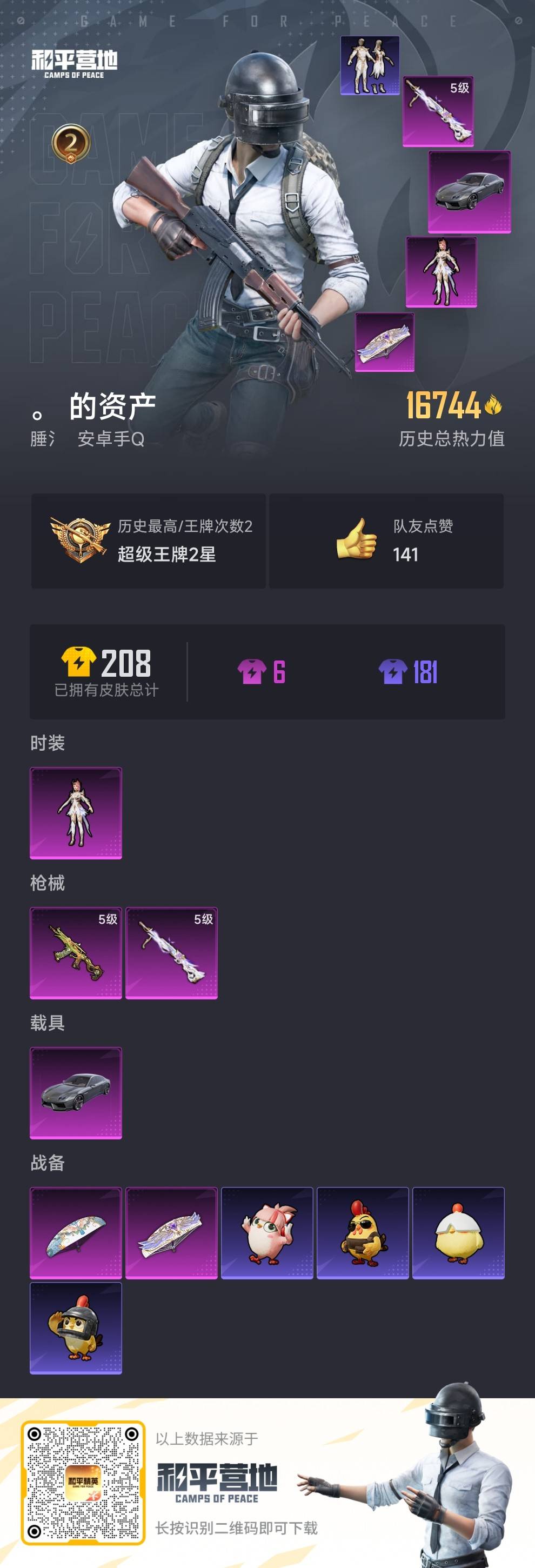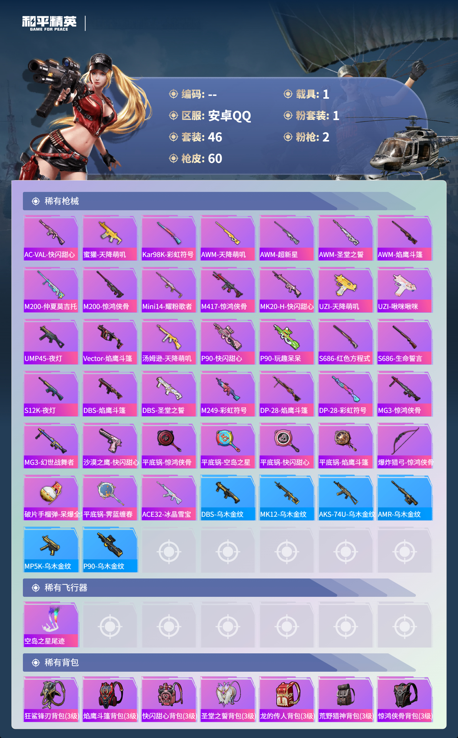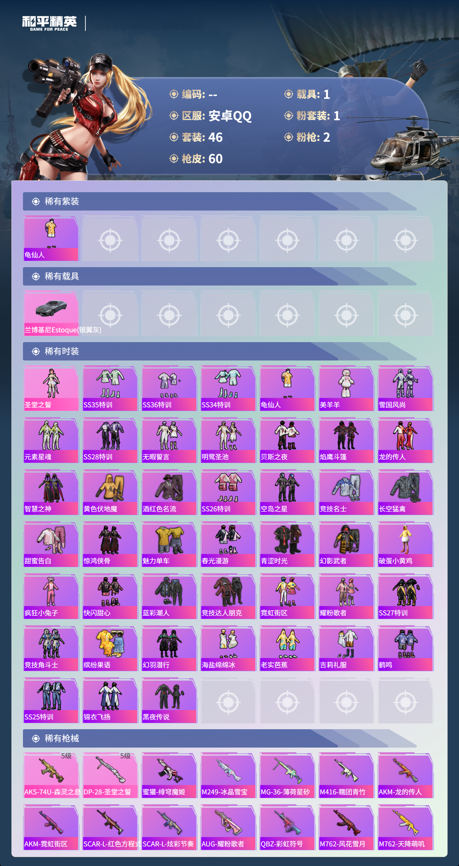 1载具-46套装-60呛皮-hs60774 安卓手q-2王牌印记-1粉装-2特效呛-1载具-16832热力值-46套装-60呛皮 【1粉装】角色-圣堂之誓 【2特效呛】aks-74u-森灵之息/5级dp-28-圣堂之誓/5级 【1稀有紫装】龟仙人 【1稀有载具】兰博基尼estoque银翼灰 【45稀有时装】ss35特训ss36特训ss34特训龟仙人美羊羊雪国风尚圣堂之誓元素星魂ss28特训无暇誓言明