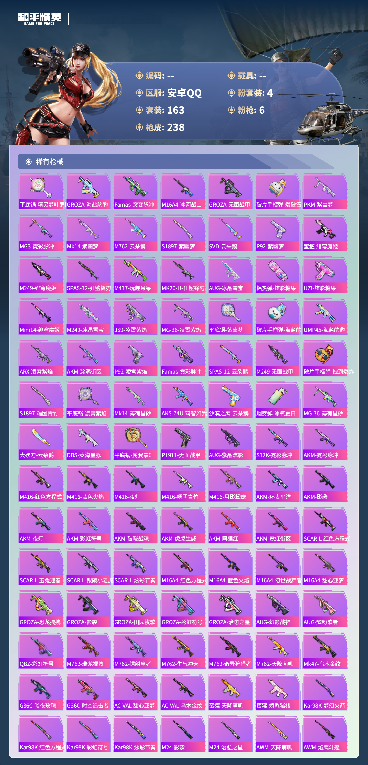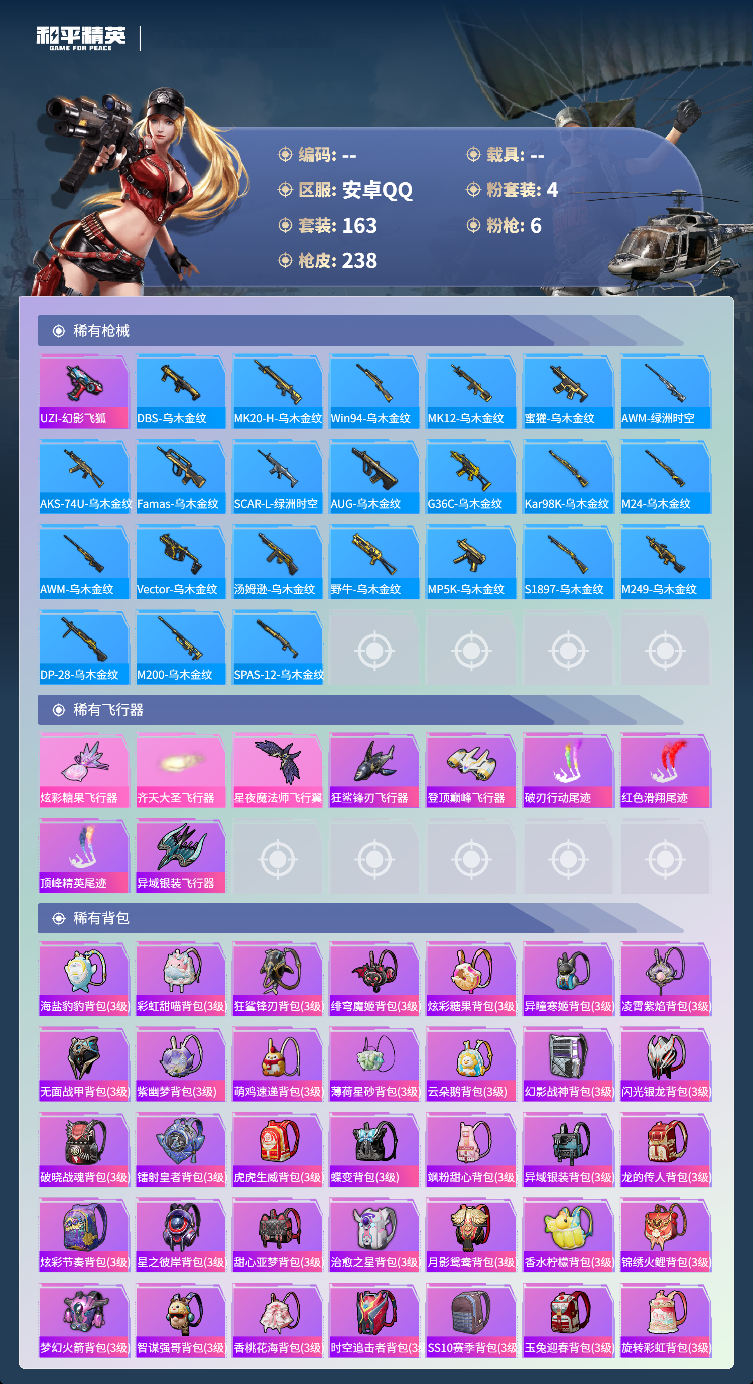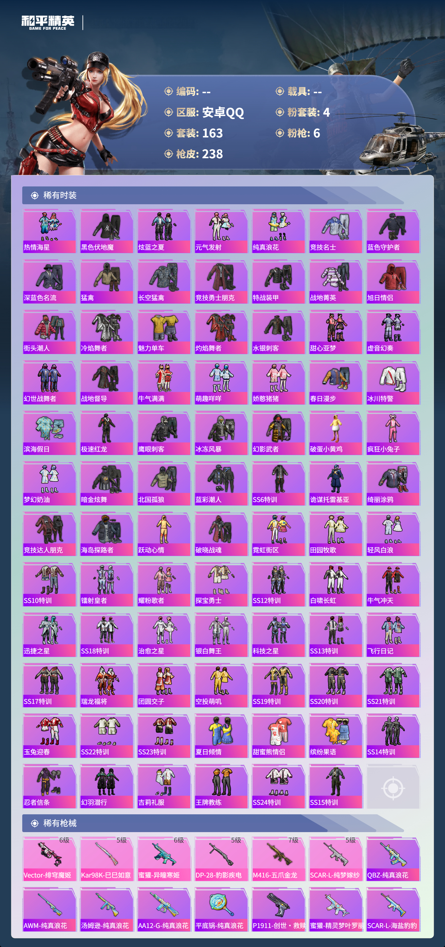 0载具-163套装-238呛皮-hs60801 安卓手q-6王牌印记-4粉装-6特效呛-69188热力值-163套装-238呛皮-2卓越印记-2传奇印记 【4粉装】套装-第五大道套装-沙场疾风套装-创世·救赎角色-复仇流浪者 【6特效呛】蜜獾-异瞳寒姬/6级m416-五爪金龙/7级scar-l-纯梦嫁纱/5级kar98k-巳巳如意/5级dp-28-豹影疾电/5级vect-绯穹魔姬/6级 【4稀有紫装】奇异狩猎