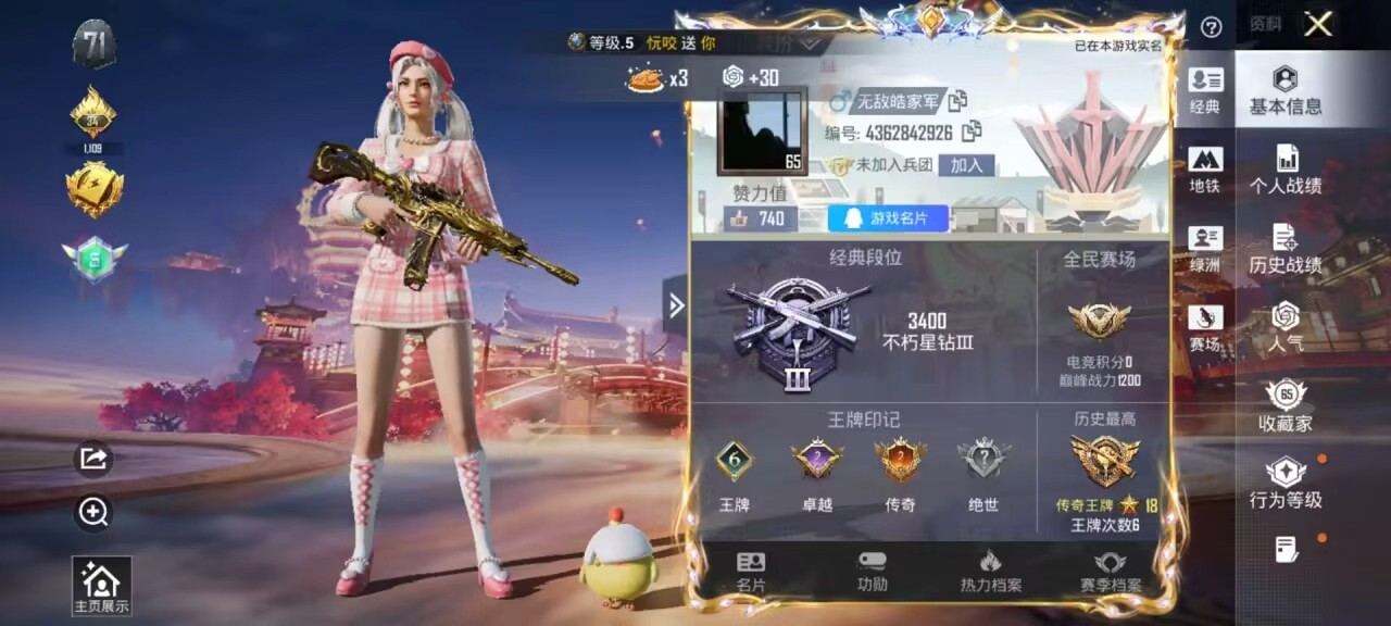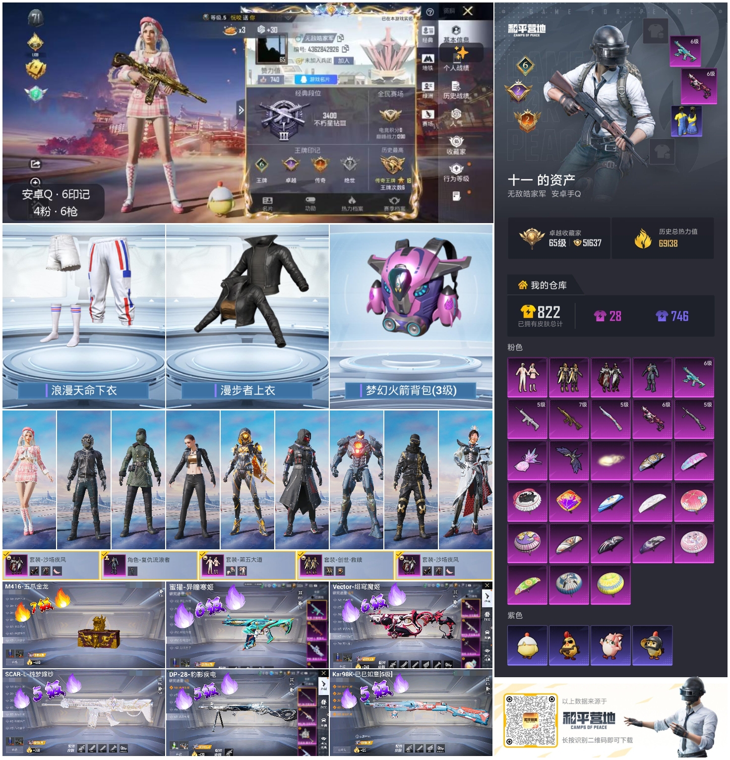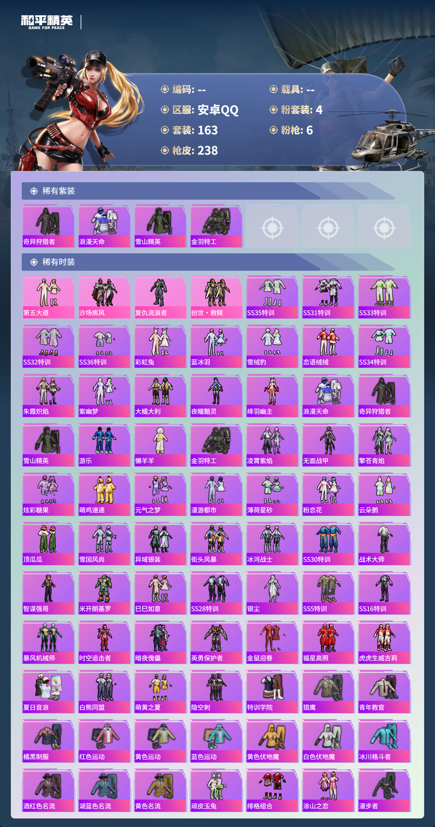 0载具-163套装-238呛皮-hs60801 安卓手q-6王牌印记-4粉装-6特效呛-69188热力值-163套装-238呛皮-2卓越印记-2传奇印记 【4粉装】套装-第五大道套装-沙场疾风套装-创世·救赎角色-复仇流浪者 【6特效呛】蜜獾-异瞳寒姬/6级m416-五爪金龙/7级scar-l-纯梦嫁纱/5级kar98k-巳巳如意/5级dp-28-豹影疾电/5级vect-绯穹魔姬/6级 【4稀有紫装】奇异狩猎