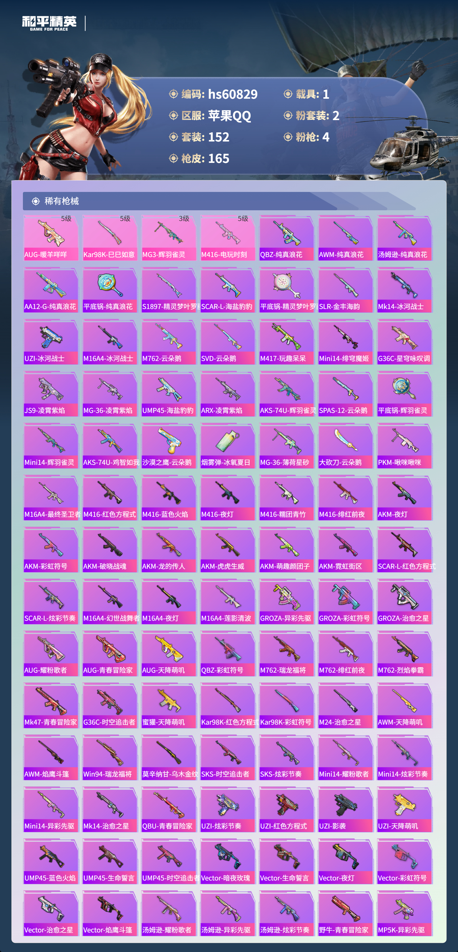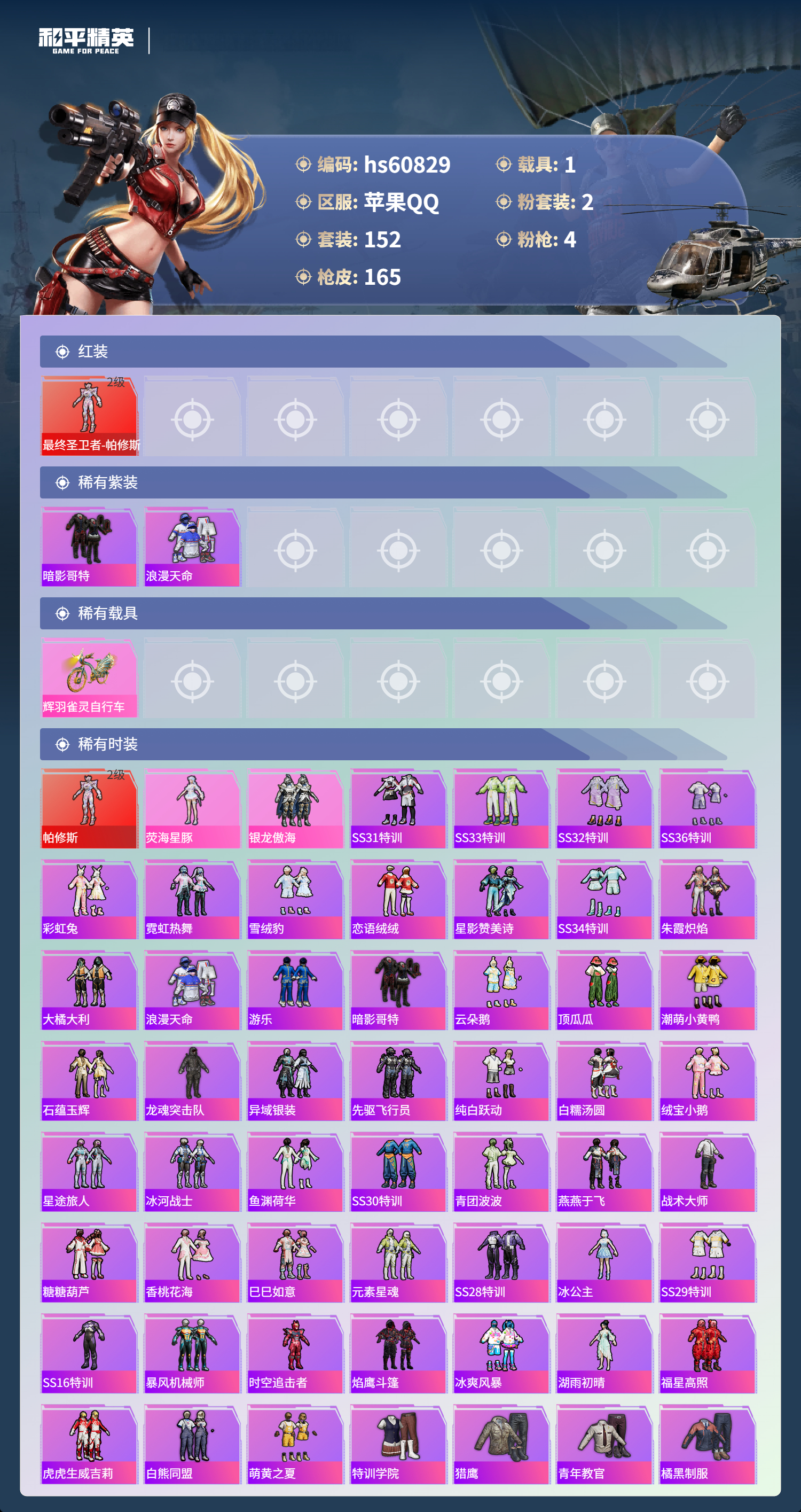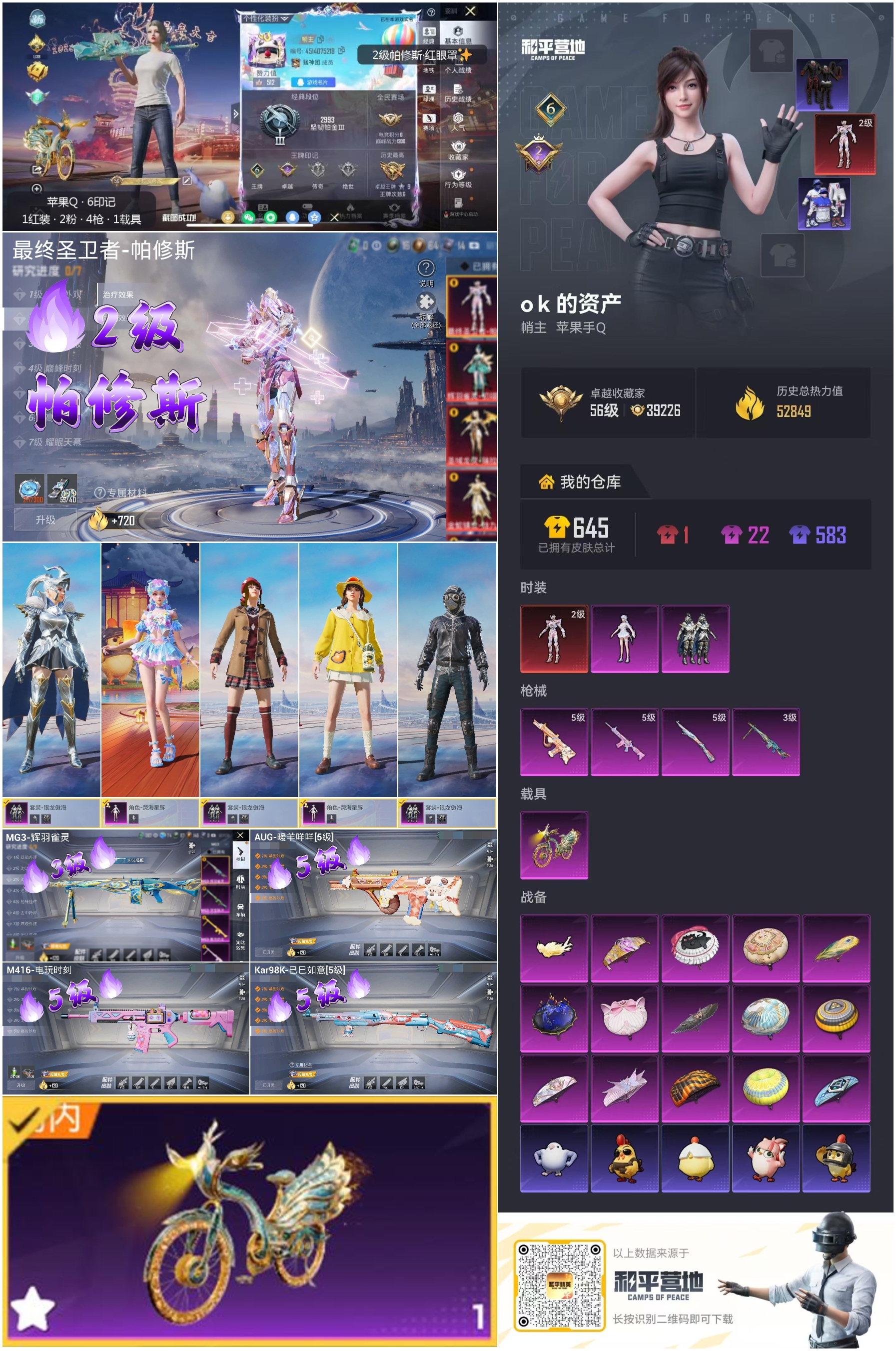 hs60829 苹果手q-6王牌印记-1红装-2粉装-4特效呛-1载具-52849热力值-152套装-165呛皮-2卓越印记 【1红装】最终圣卫者-帕修斯/2级 【2粉装】角色-荧海星豚套装-银龙傲海 【4特效呛】m416-电玩时刻/5级aug-暖羊咩咩/5级mg3-辉羽雀灵/3级kar98k-巳巳如意/5级 【2稀有紫装】暗影哥特浪漫天命 【1稀有载具】辉羽雀灵自行车 【149稀有时装