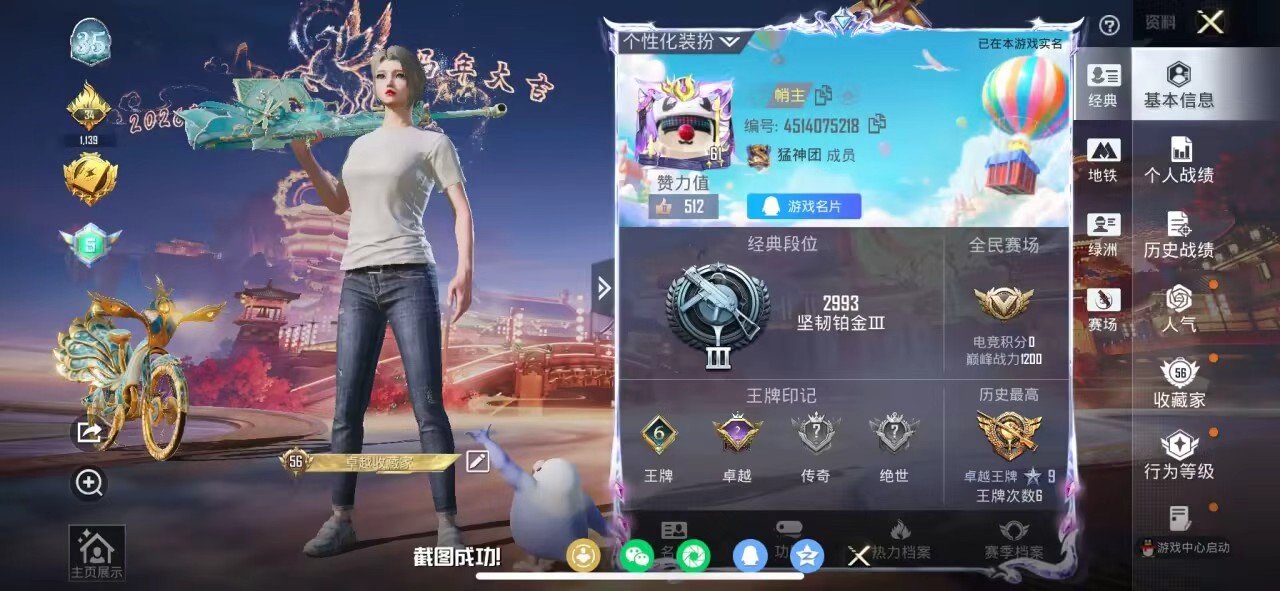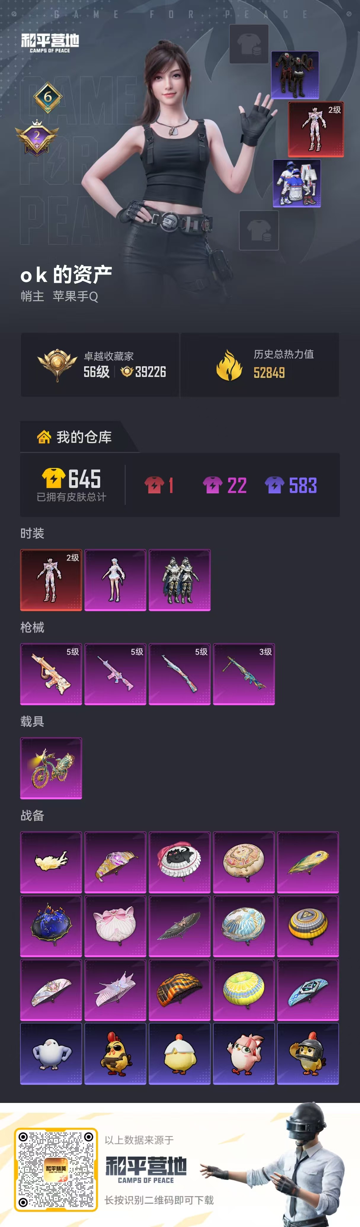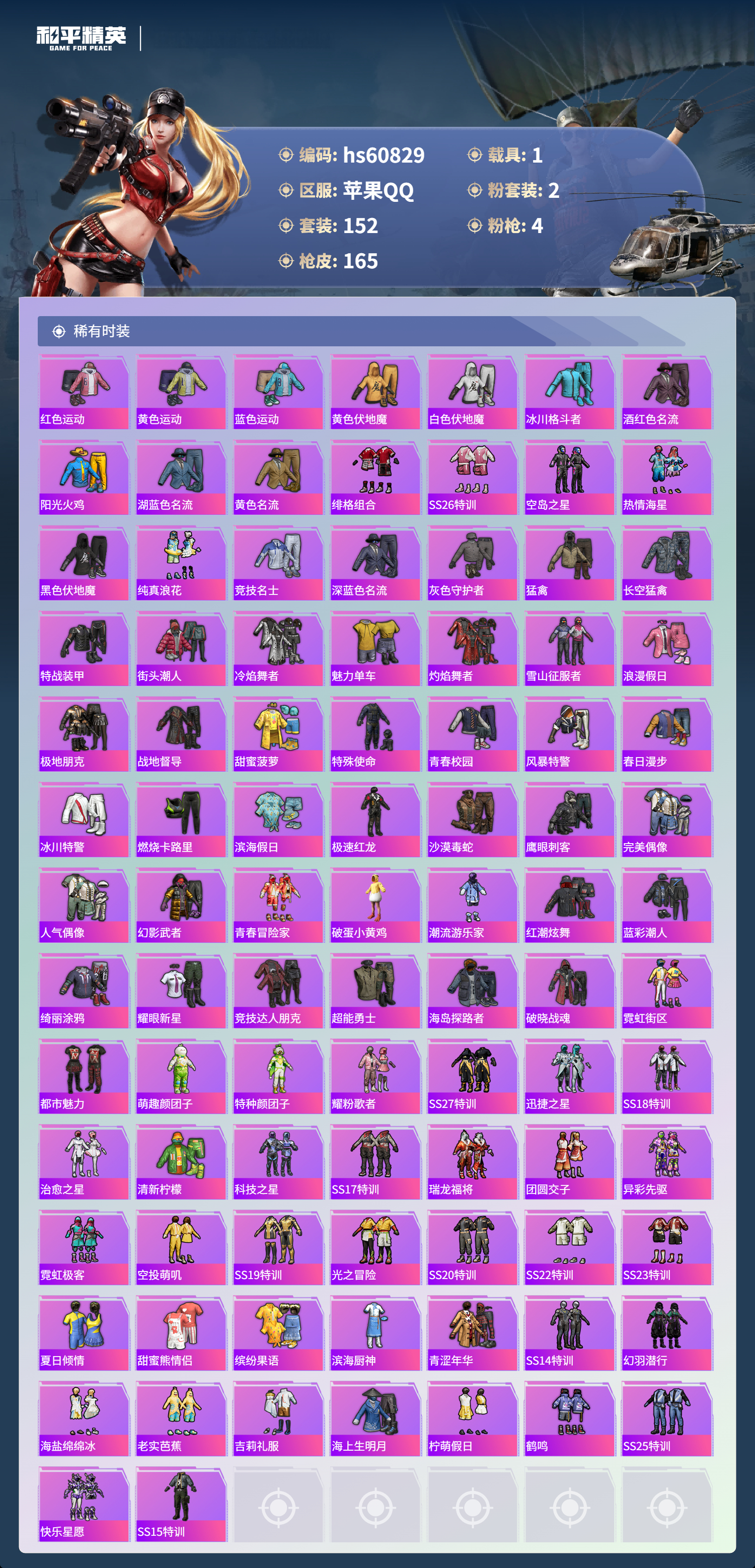 hs60829 苹果手q-6王牌印记-1红装-2粉装-4特效呛-1载具-52849热力值-152套装-165呛皮-2卓越印记 【1红装】最终圣卫者-帕修斯/2级 【2粉装】角色-荧海星豚套装-银龙傲海 【4特效呛】m416-电玩时刻/5级aug-暖羊咩咩/5级mg3-辉羽雀灵/3级kar98k-巳巳如意/5级 【2稀有紫装】暗影哥特浪漫天命 【1稀有载具】辉羽雀灵自行车 【149稀有时装