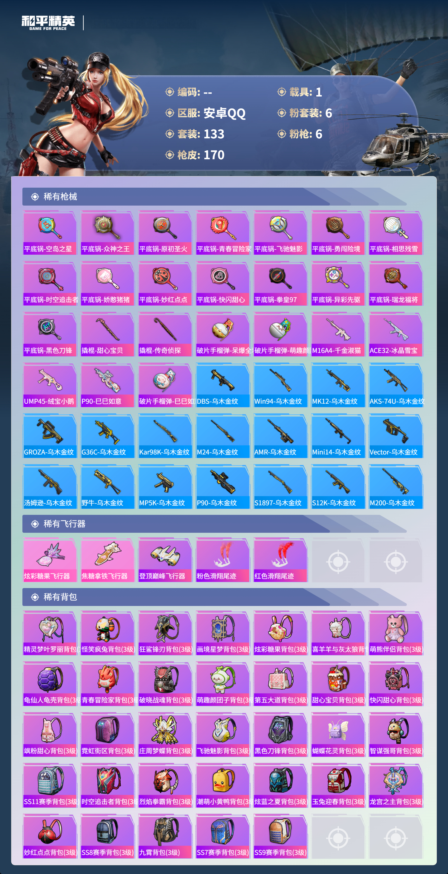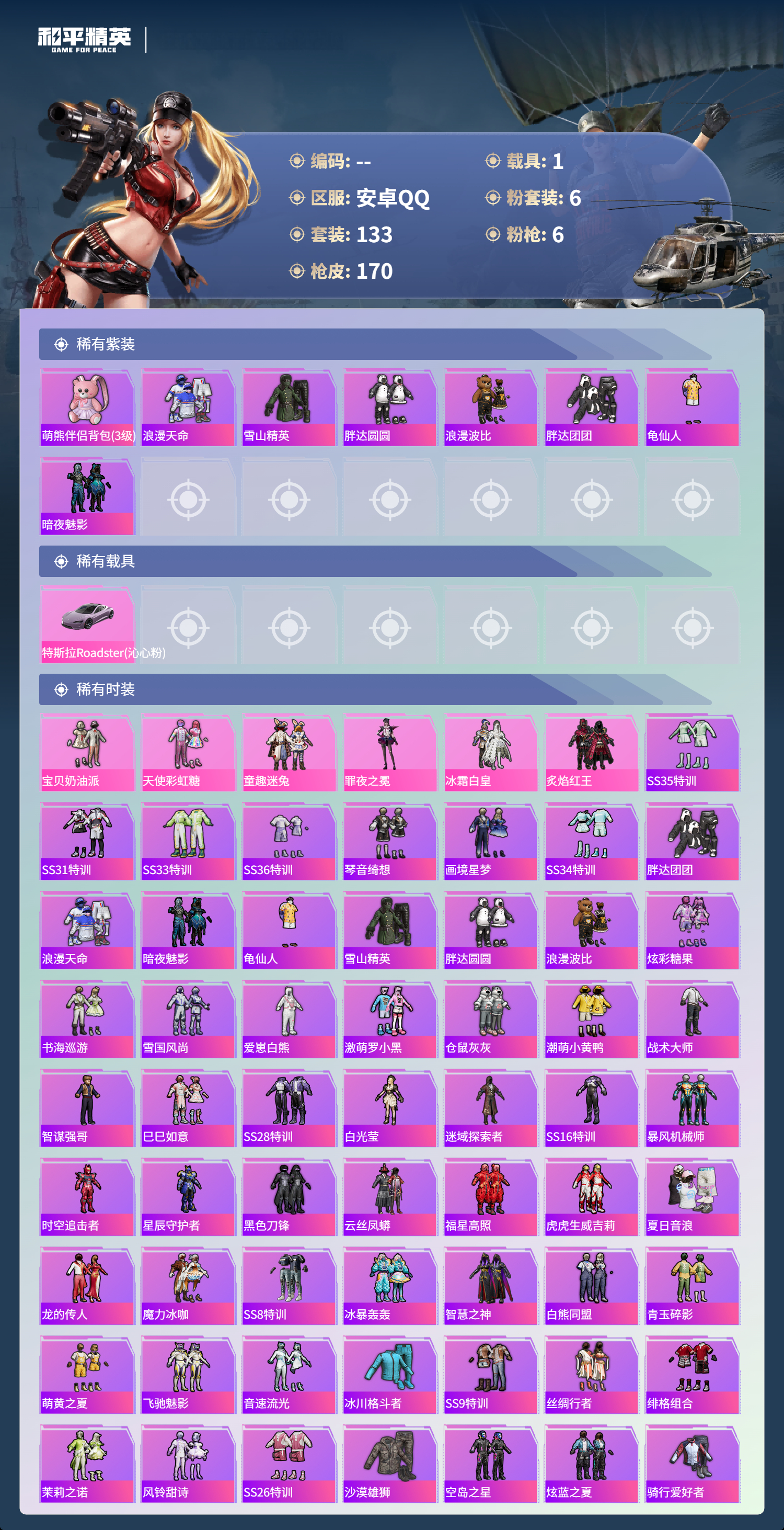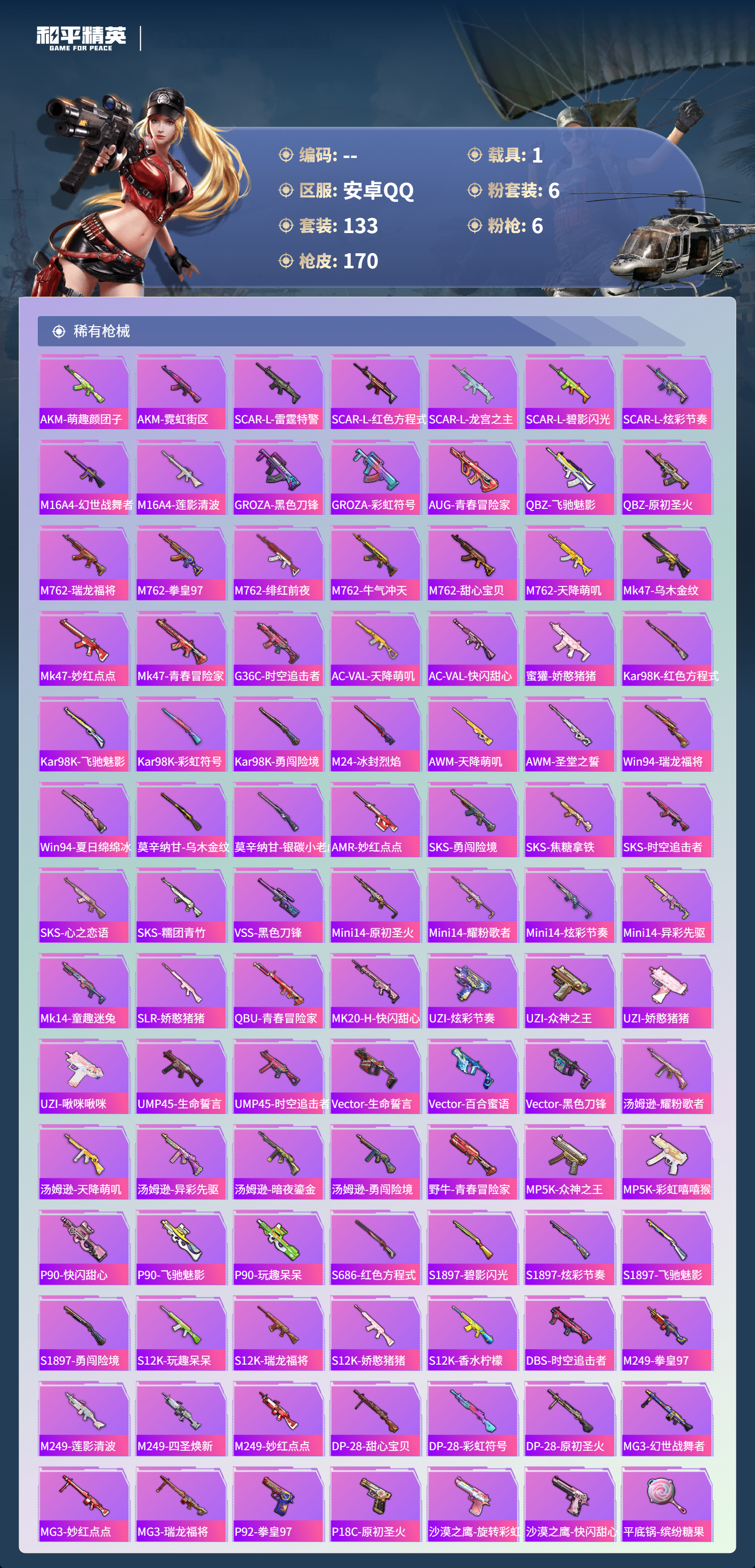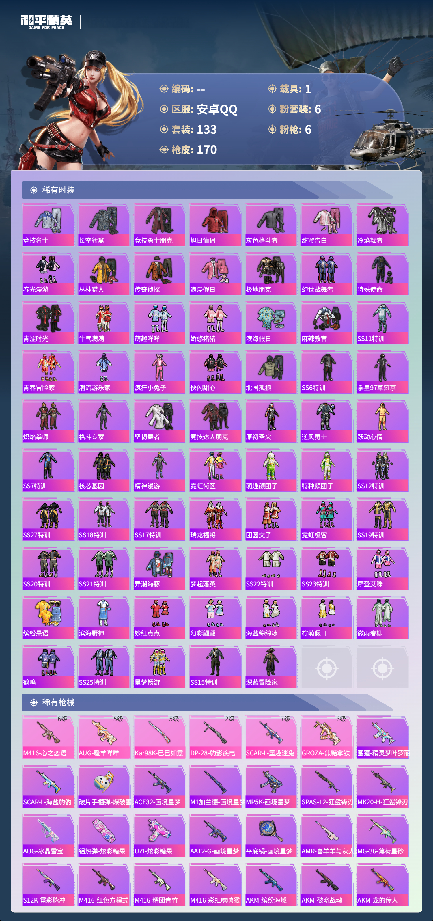 1载具-133套装-170呛皮-hs60778安卓手q-7王牌印记-6粉装-6特效呛-1载具-56727热力值-133套装-170呛皮-2卓越印记 【6粉装】角色-罪夜之冕套装-炙焰红王套装-童趣迷兔套装-宝贝奶油派套装-冰霜白皇套装-天使彩虹糖 【6特效呛】m416-心之恋语/6级aug-暖羊咩咩/5级groza-焦糖拿铁/6级scar-l-童趣迷兔/7级kar98k-巳巳如意/5级dp-28-豹影疾电/2