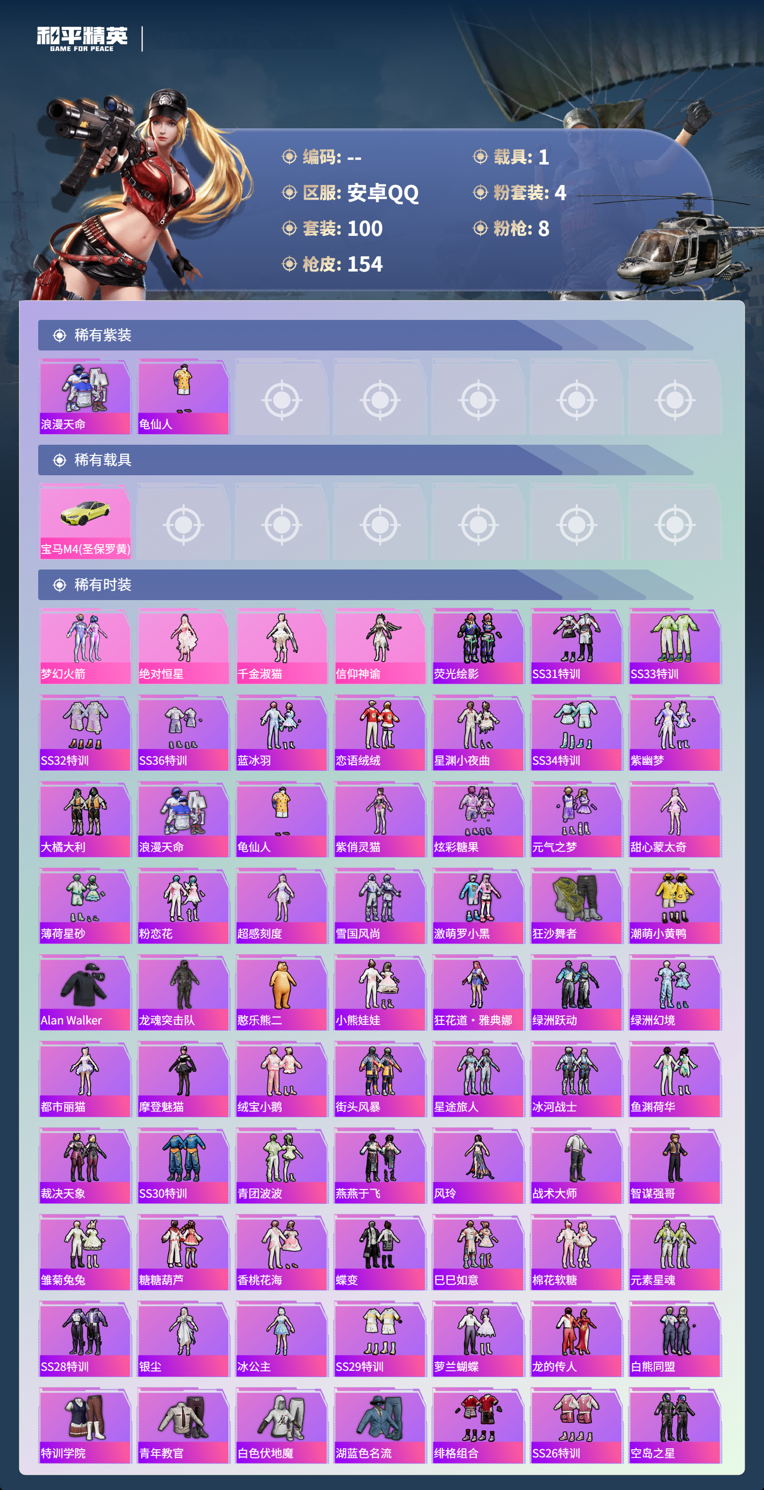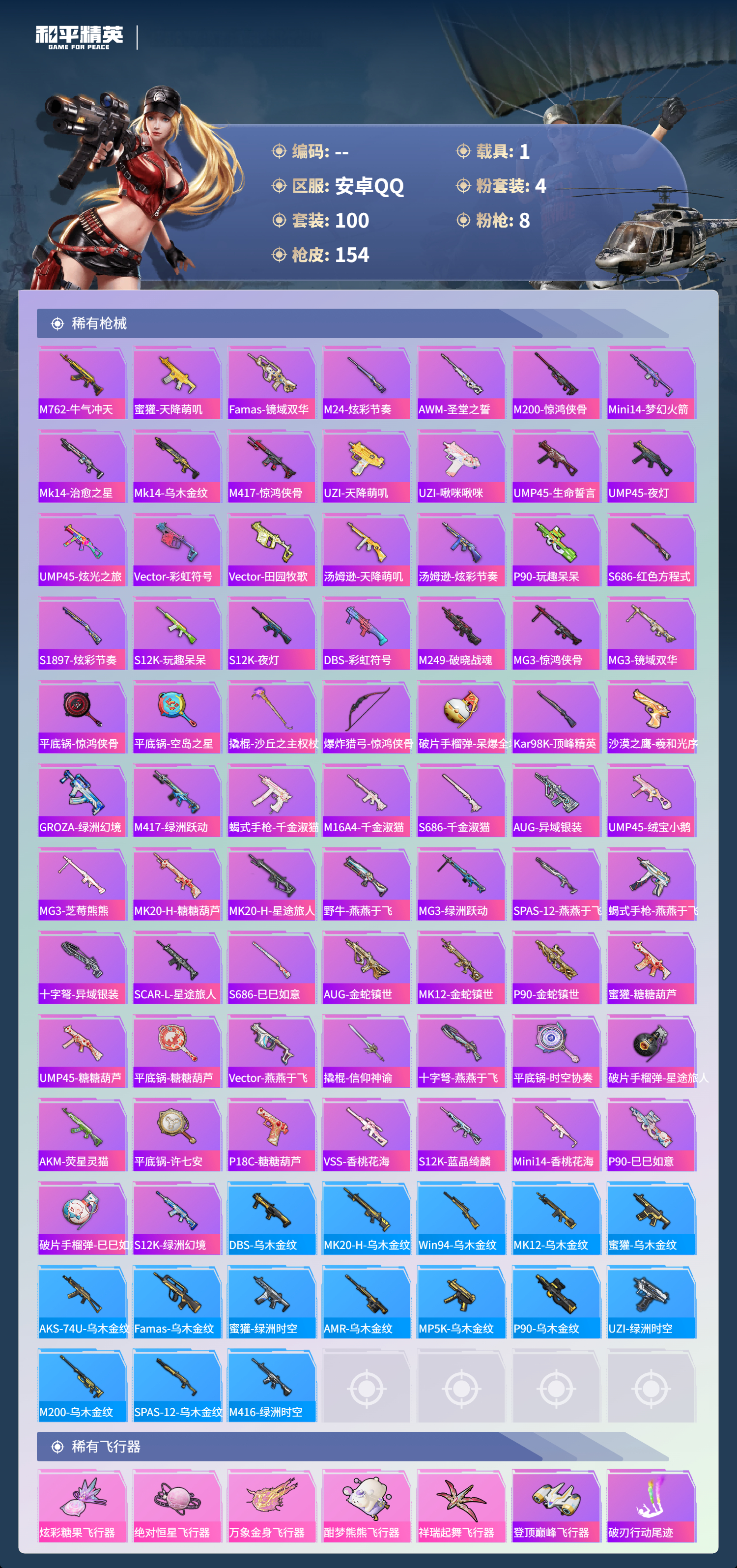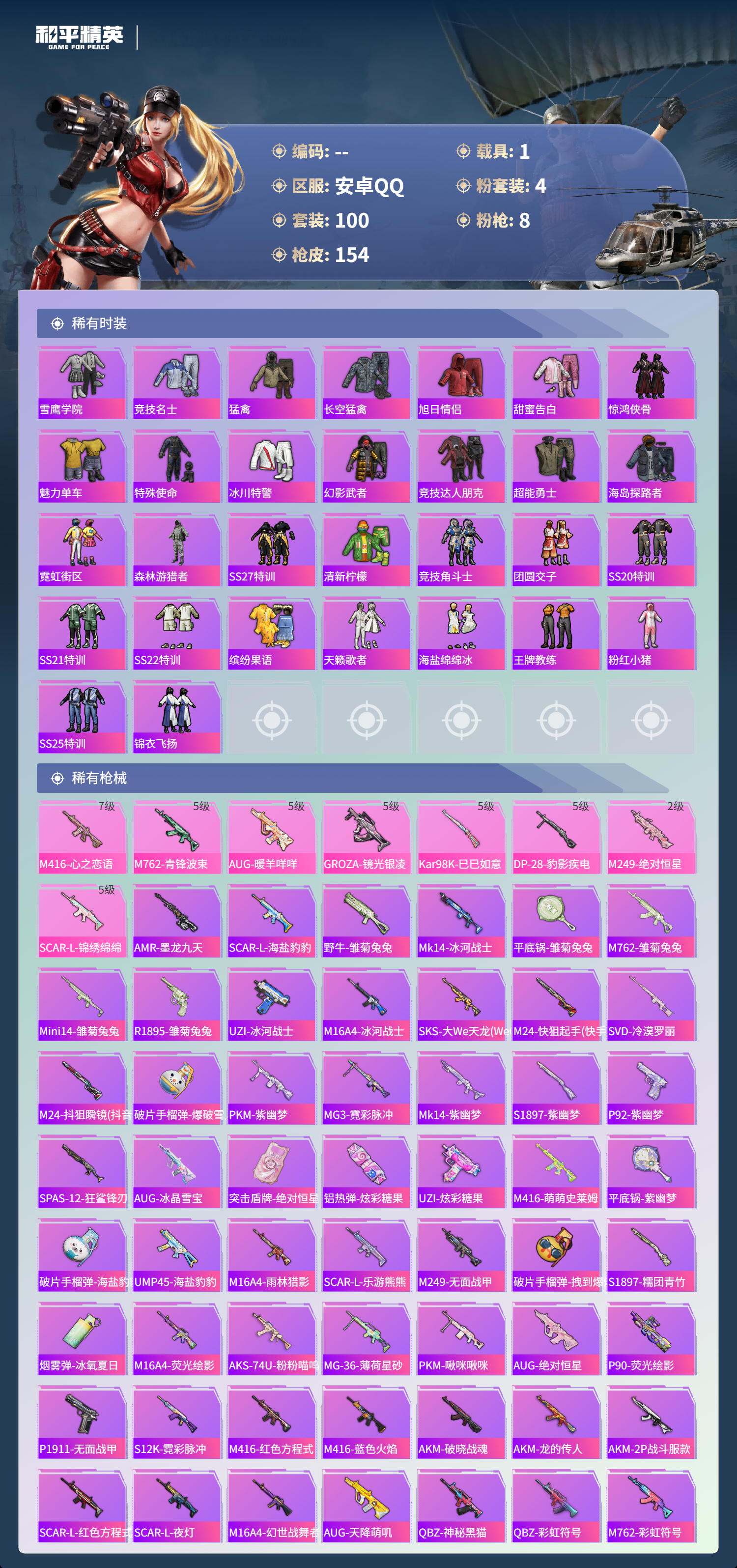 1载具-100套装-154呛皮-hs60821 安卓手q-4王牌印记-4粉装-8特效呛-1载具-47472热力值-100套装-154呛皮-2卓越印记 【4粉装】角色-绝对恒星角色-信仰神谕套装-梦幻火箭角色-千金淑猫 【8特效呛】scar-l-锦绣绵绵/5级dp-28-豹影疾电/5级m762-青锋波束/5级groza-镜光银凌/5级aug-暖羊咩咩/5级m416-心之恋语/7级kar98k-巳巳如意/5级m2