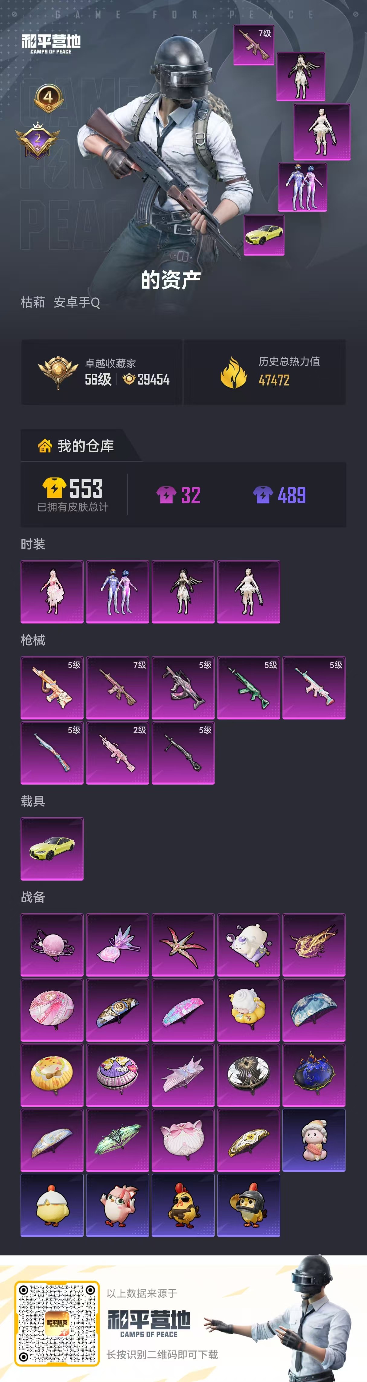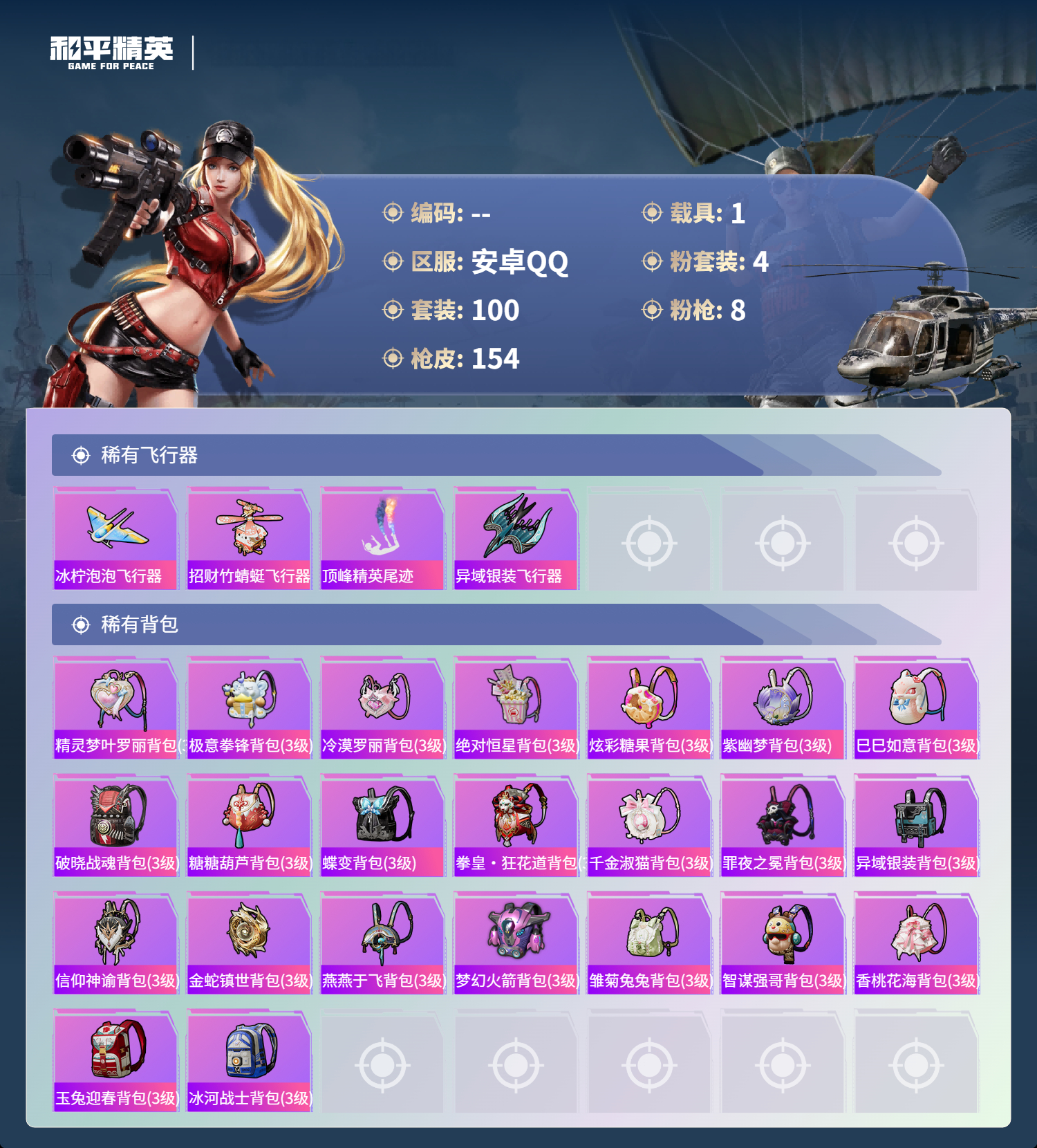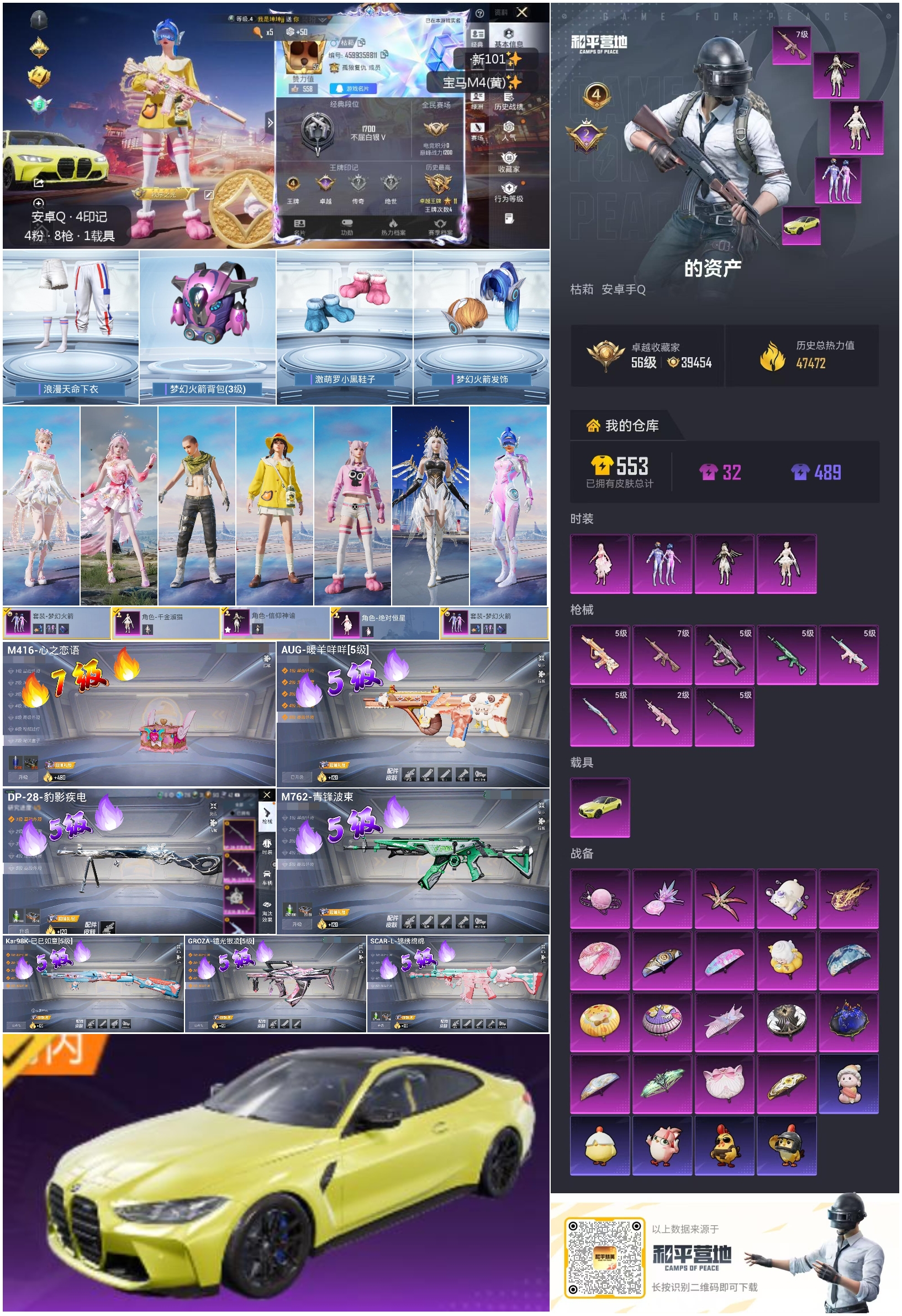 1载具-100套装-154呛皮-hs60821 安卓手q-4王牌印记-4粉装-8特效呛-1载具-47472热力值-100套装-154呛皮-2卓越印记 【4粉装】角色-绝对恒星角色-信仰神谕套装-梦幻火箭角色-千金淑猫 【8特效呛】scar-l-锦绣绵绵/5级dp-28-豹影疾电/5级m762-青锋波束/5级groza-镜光银凌/5级aug-暖羊咩咩/5级m416-心之恋语/7级kar98k-巳巳如意/5级m2