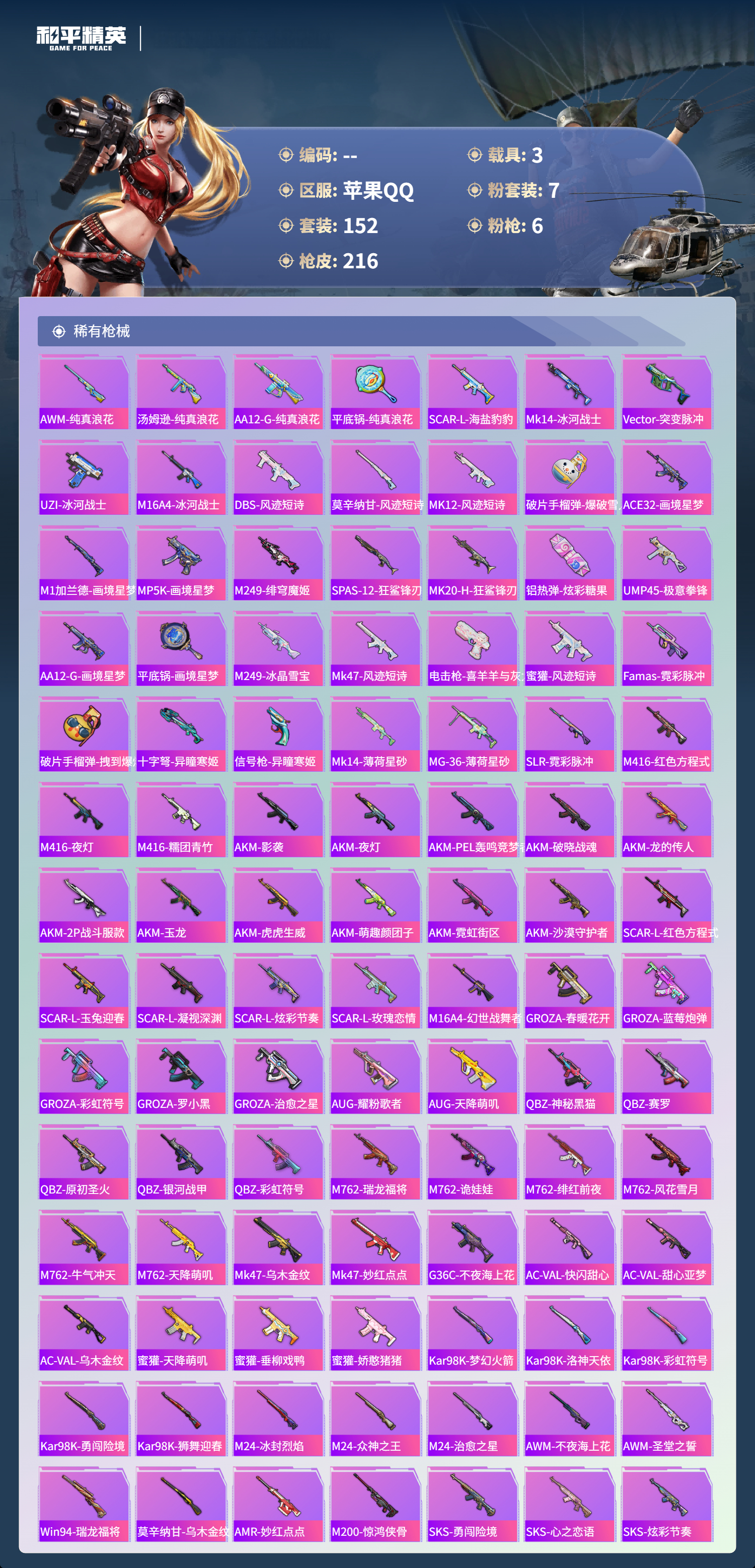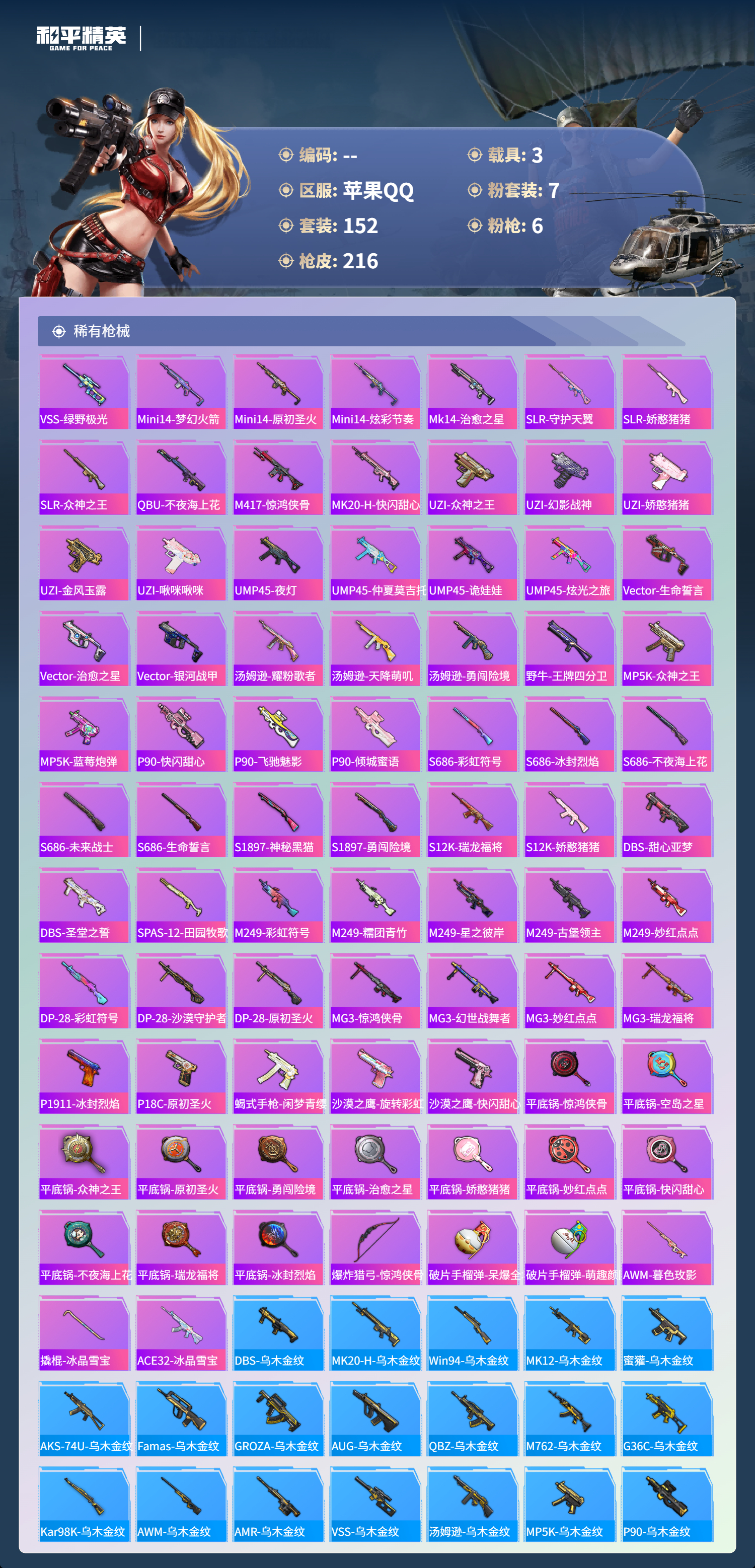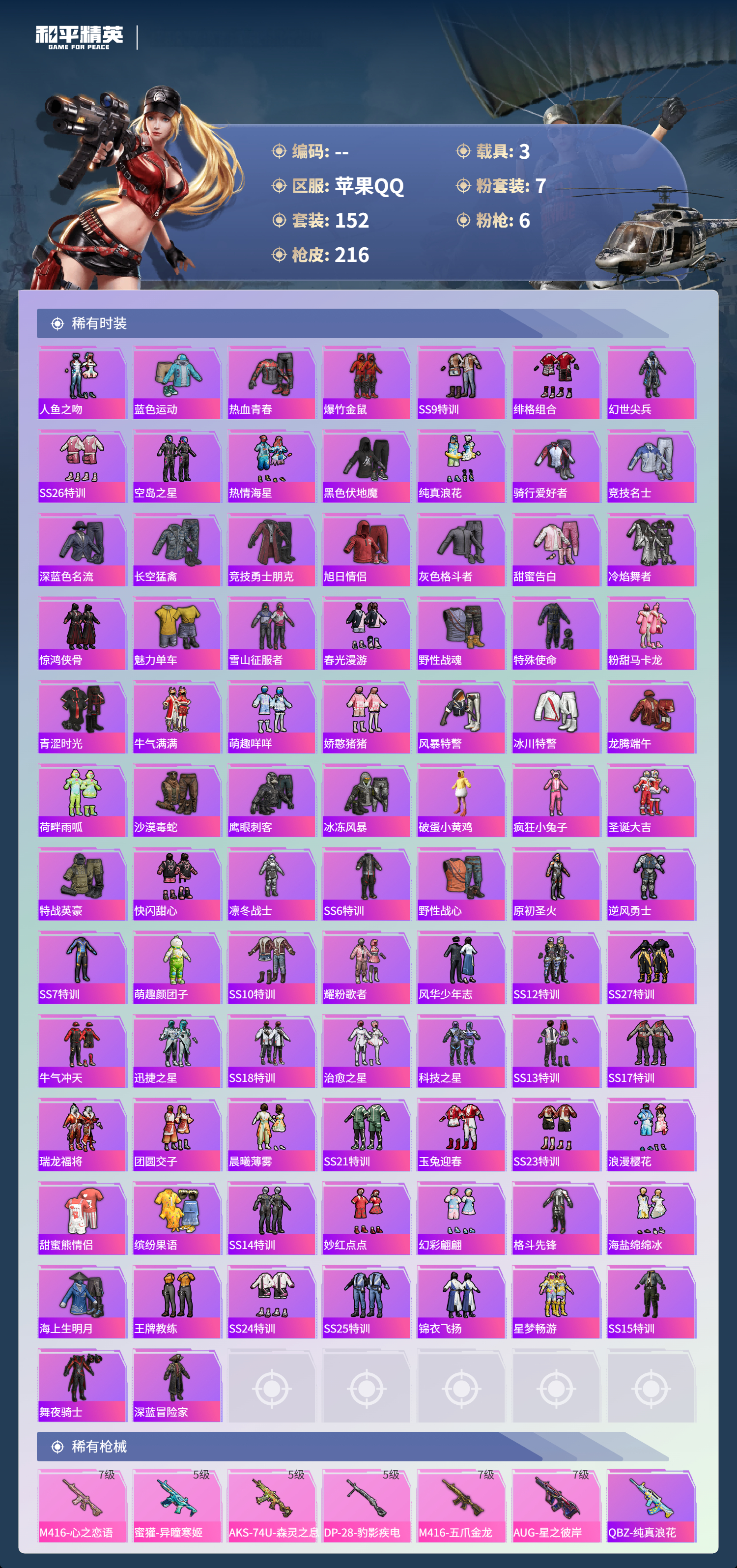 3载具-152套装-216呛皮-hs60848 苹果手q-7王牌印记-7粉装-6特效呛-3载具-72071热力值-152套装-216呛皮-1卓越印记 【7粉装】套装-金属狂野角色-圣堂之誓套装-梦幻火箭角色-异瞳寒姬套装-音爆索尼克套装-金曜白虎套装-王牌四分卫 【6特效呛】aks-74u-森灵之息/5级dp-28-豹影疾电/5级aug-星之彼岸/7级蜜獾-异瞳寒姬/5级m416-五爪金龙/7级m416-心