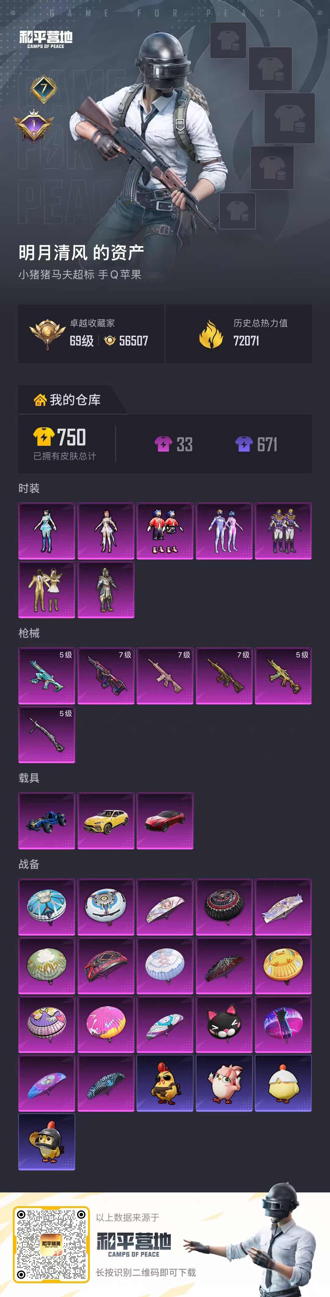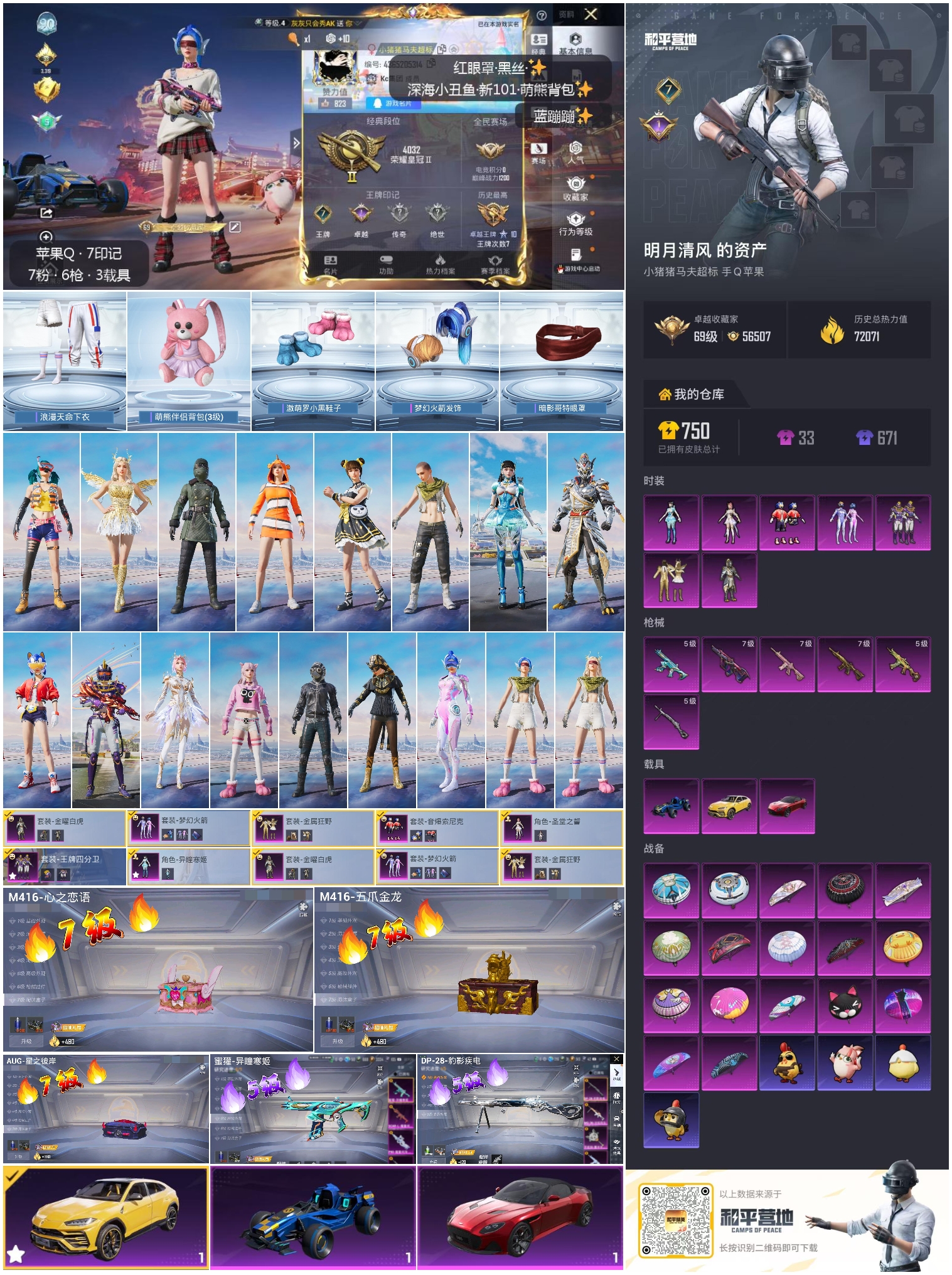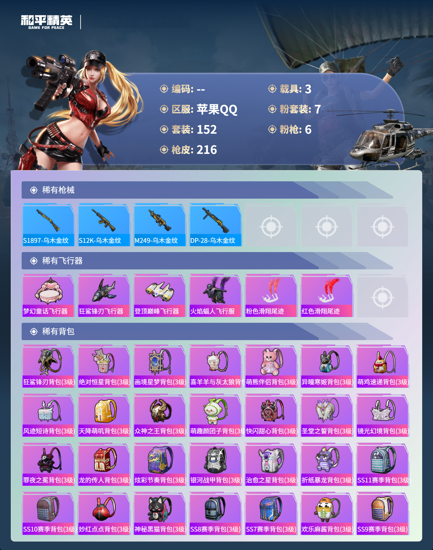 3载具-152套装-216呛皮-hs60848 苹果手q-7王牌印记-7粉装-6特效呛-3载具-72071热力值-152套装-216呛皮-1卓越印记 【7粉装】套装-金属狂野角色-圣堂之誓套装-梦幻火箭角色-异瞳寒姬套装-音爆索尼克套装-金曜白虎套装-王牌四分卫 【6特效呛】aks-74u-森灵之息/5级dp-28-豹影疾电/5级aug-星之彼岸/7级蜜獾-异瞳寒姬/5级m416-五爪金龙/7级m416-心